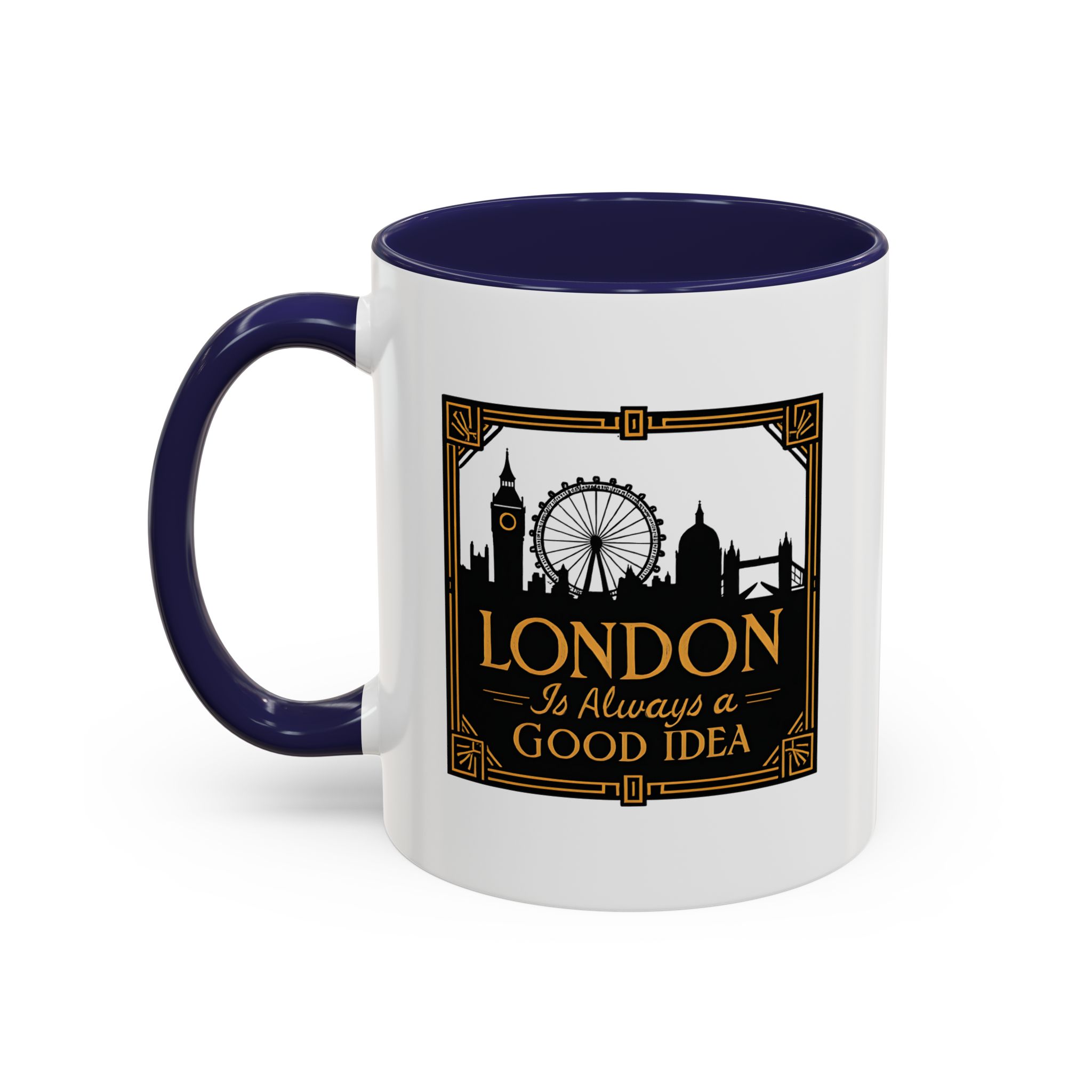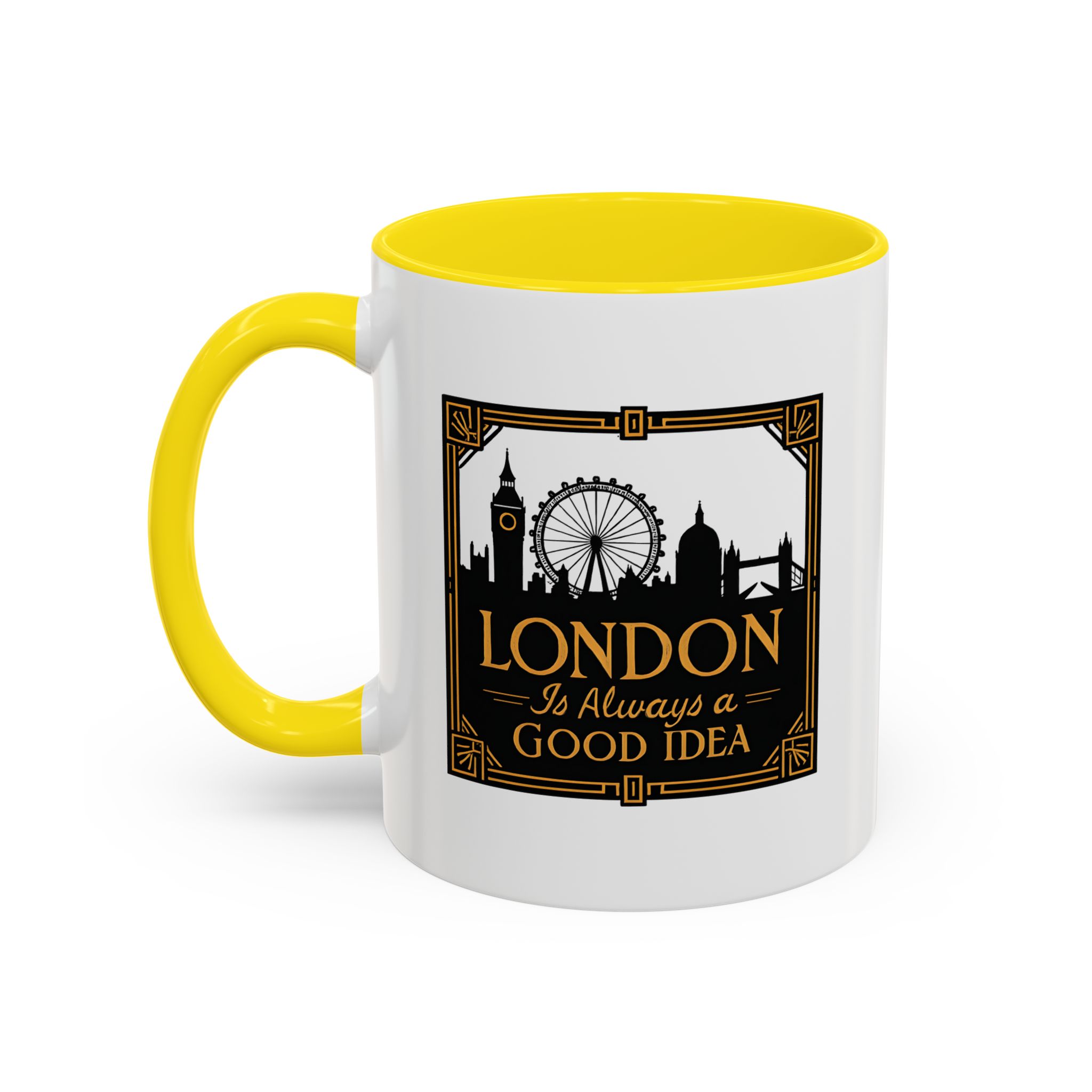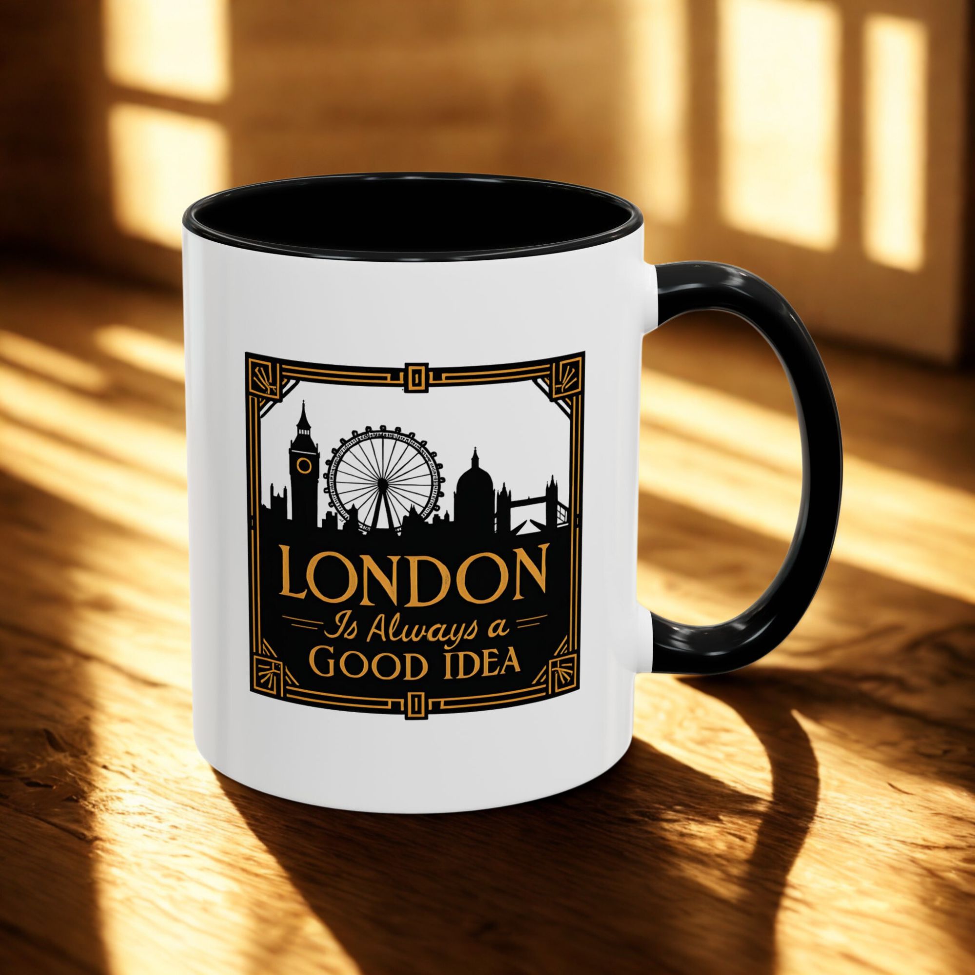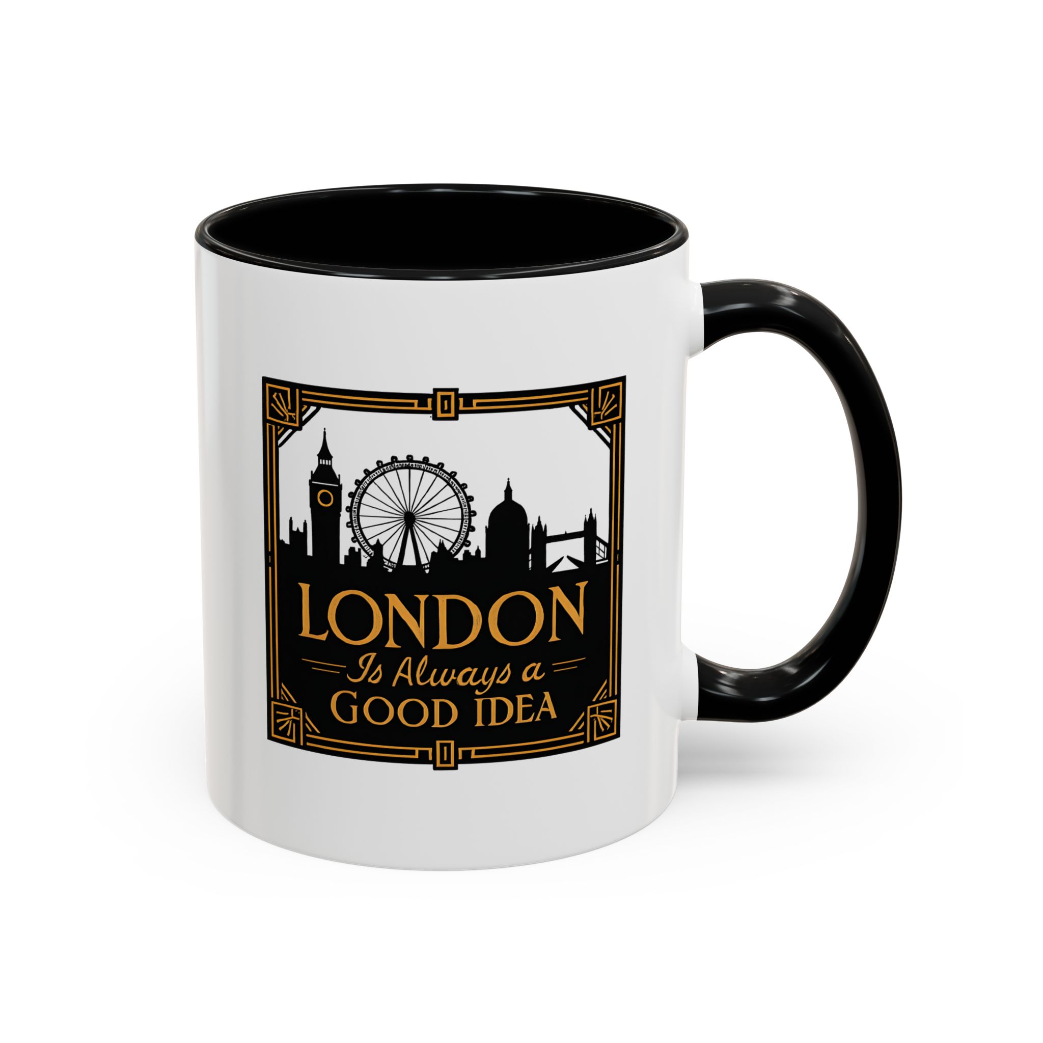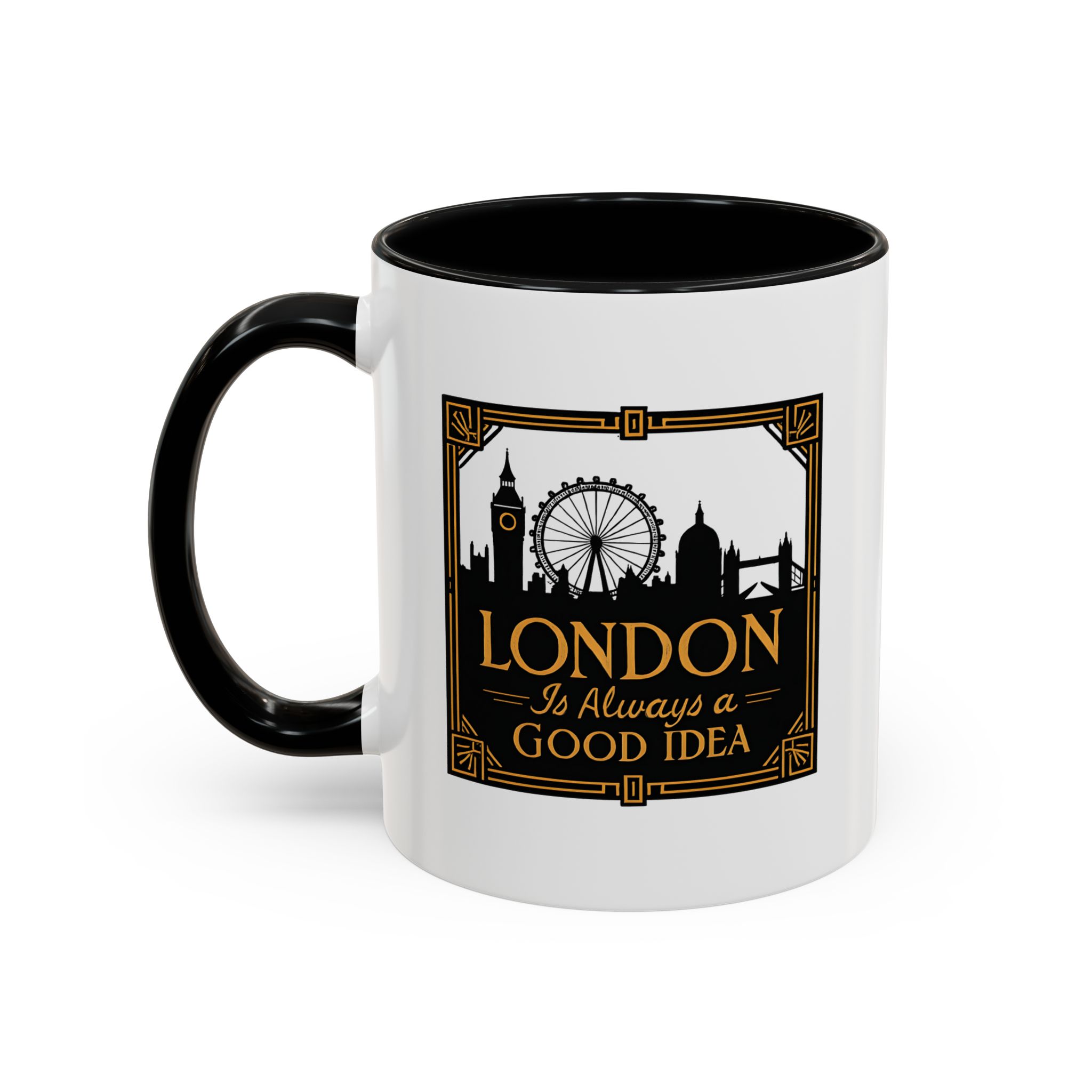 This art deco London skyline mug features the quote “London Is Always a Good Idea” with elegant landmark silhouettes. A refined gift for city lovers and travellers.