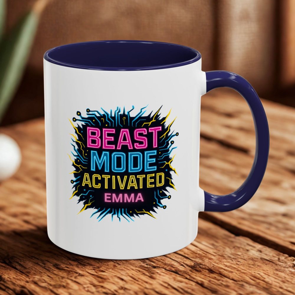Get fired up and crush your goals with this vibrant Beast Mode mug – perfect for anyone who lives in the fast lane and lifts like a legend. Featuring neon-style typography and an explosive tech-inspired background, this custom mug lets you add your name (like Emma) to activate your own power mode every morning.