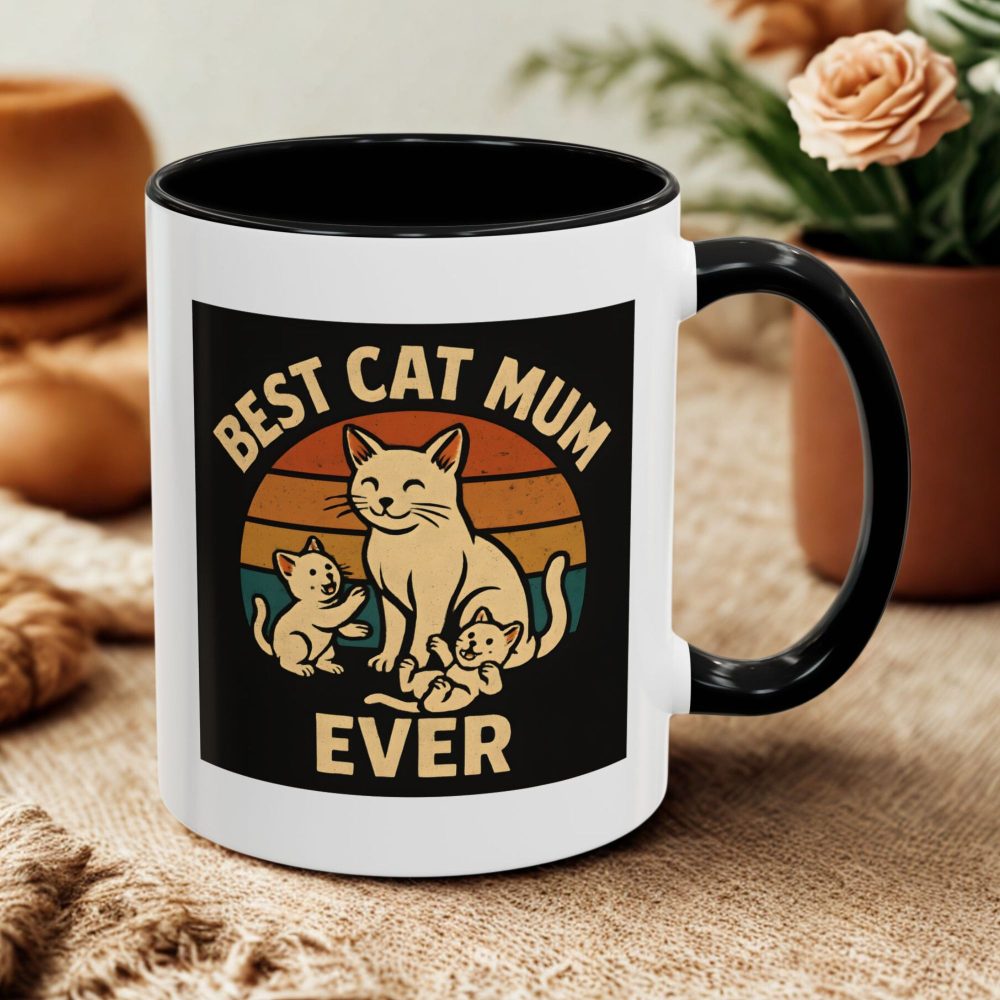 Best Cat Mum Mug Retro – 11oz ceramic, dishwasher & microwave safe, available in 9 accent colours. A vintage-style gift for proud cat mums.