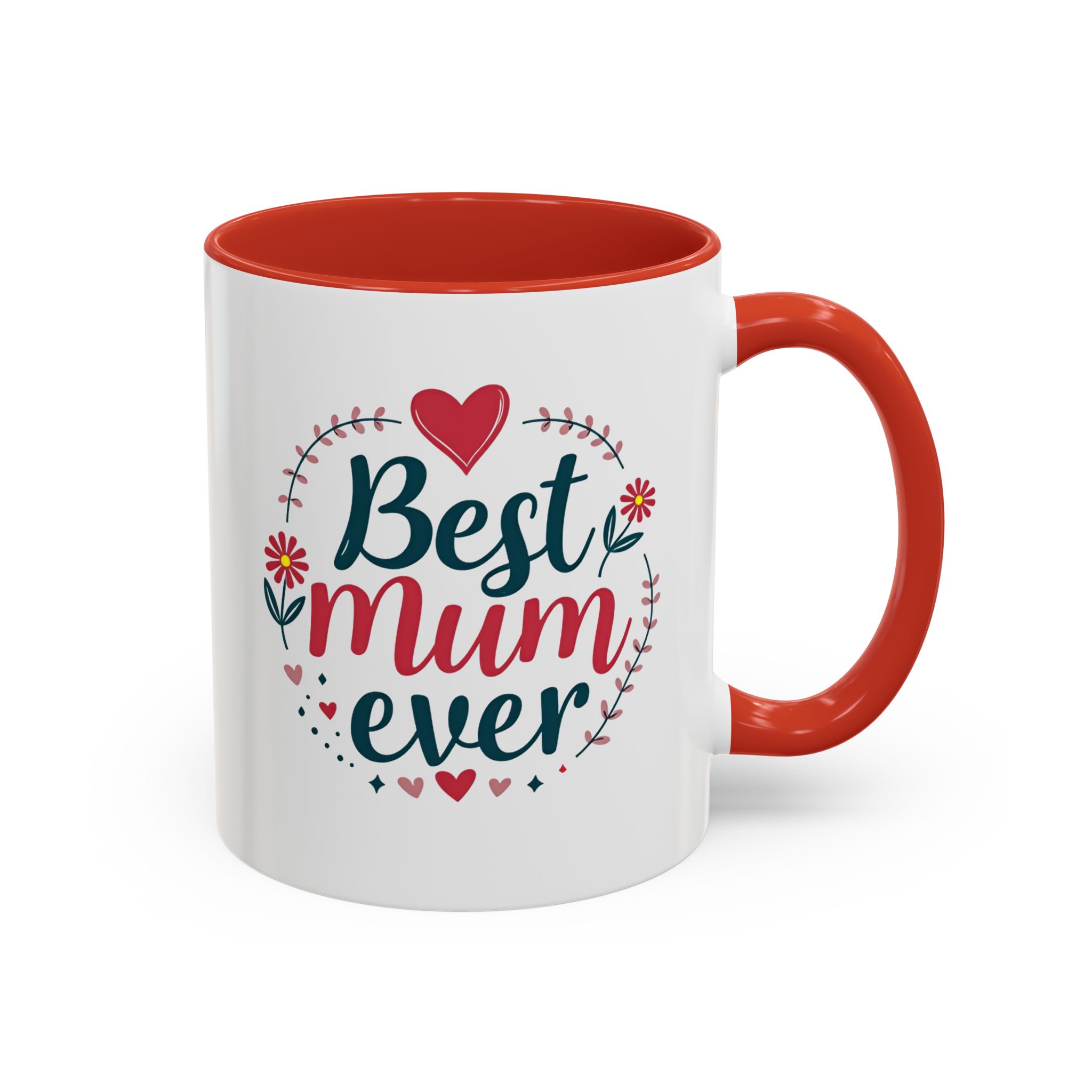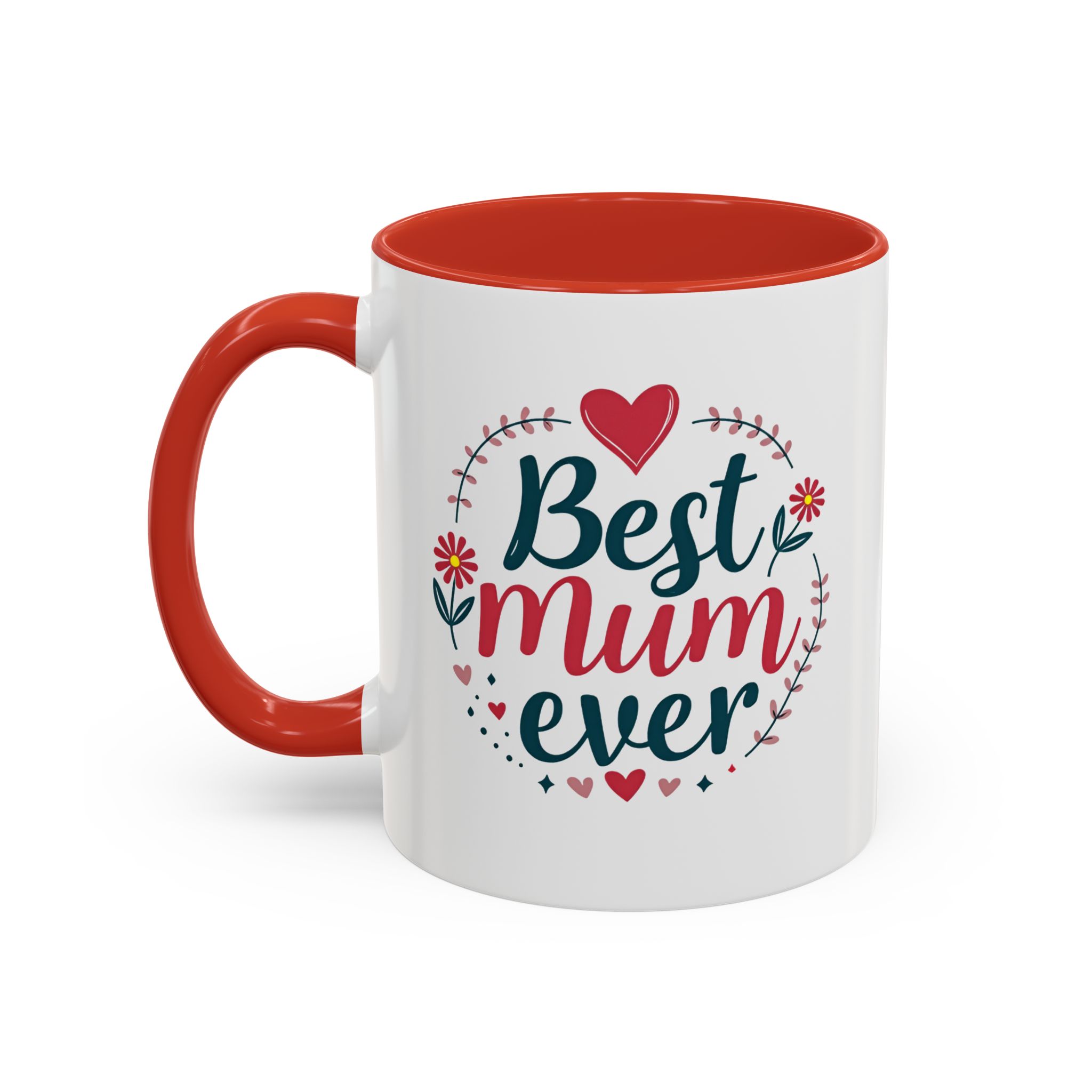 The phrase “Best Mum Ever” is set in bold, friendly script — with “Mum” highlighted in vibrant red — framed by a heart-shaped border of pink flowers, mini hearts, and leafy vines. A bright red heart crowns the top, making it ideal for Mother’s Day, birthdays, or any occasion where Mum deserves some extra love.