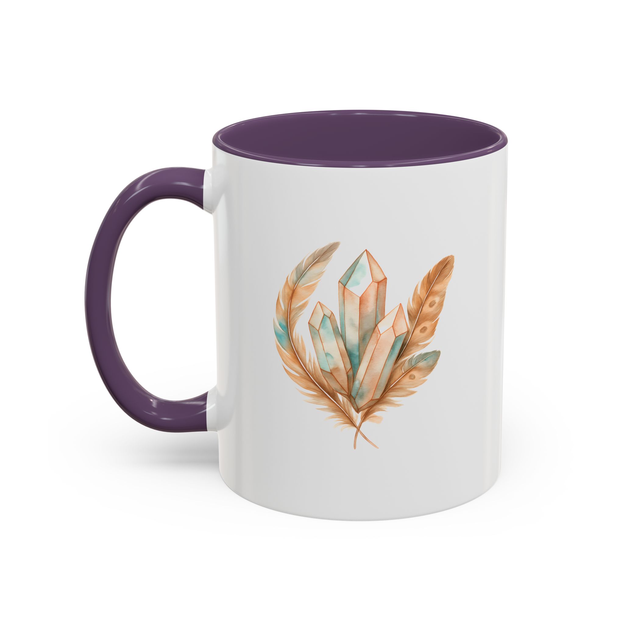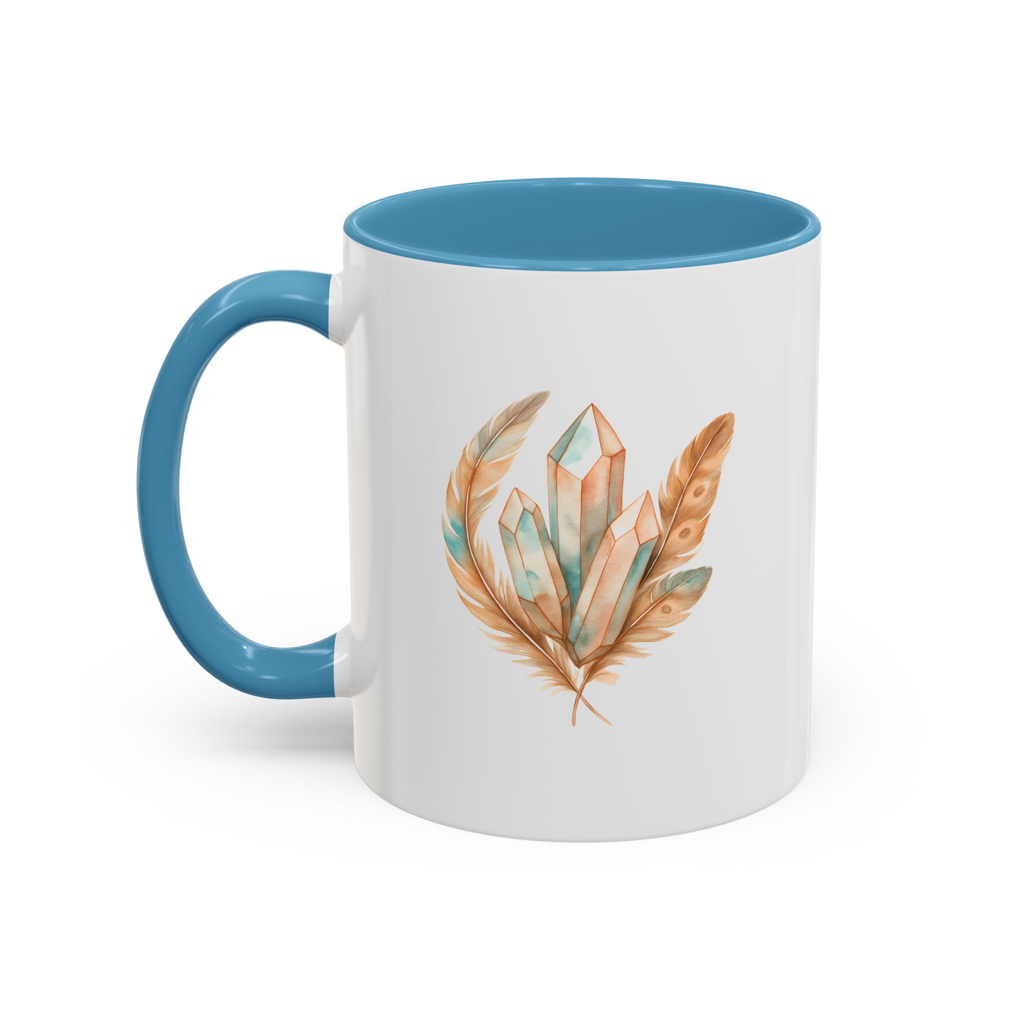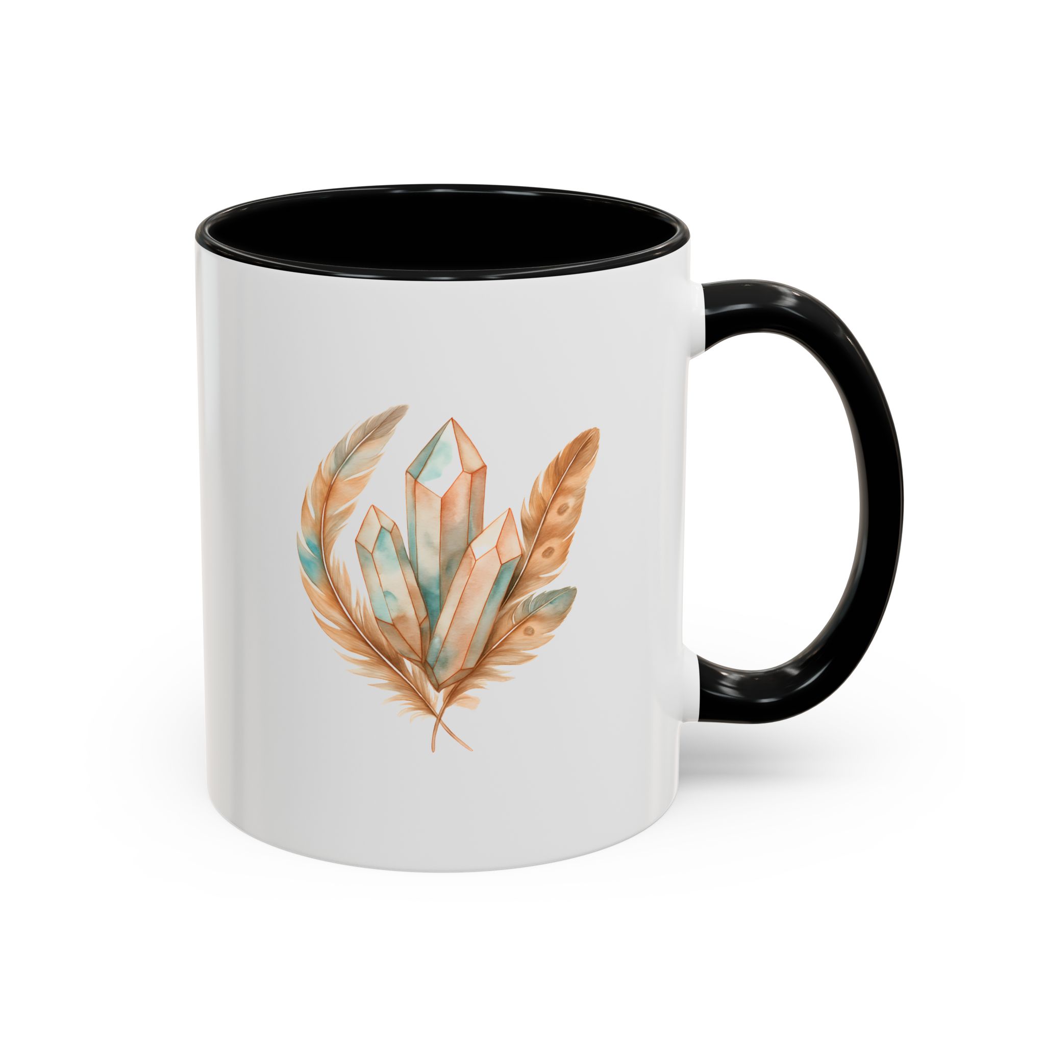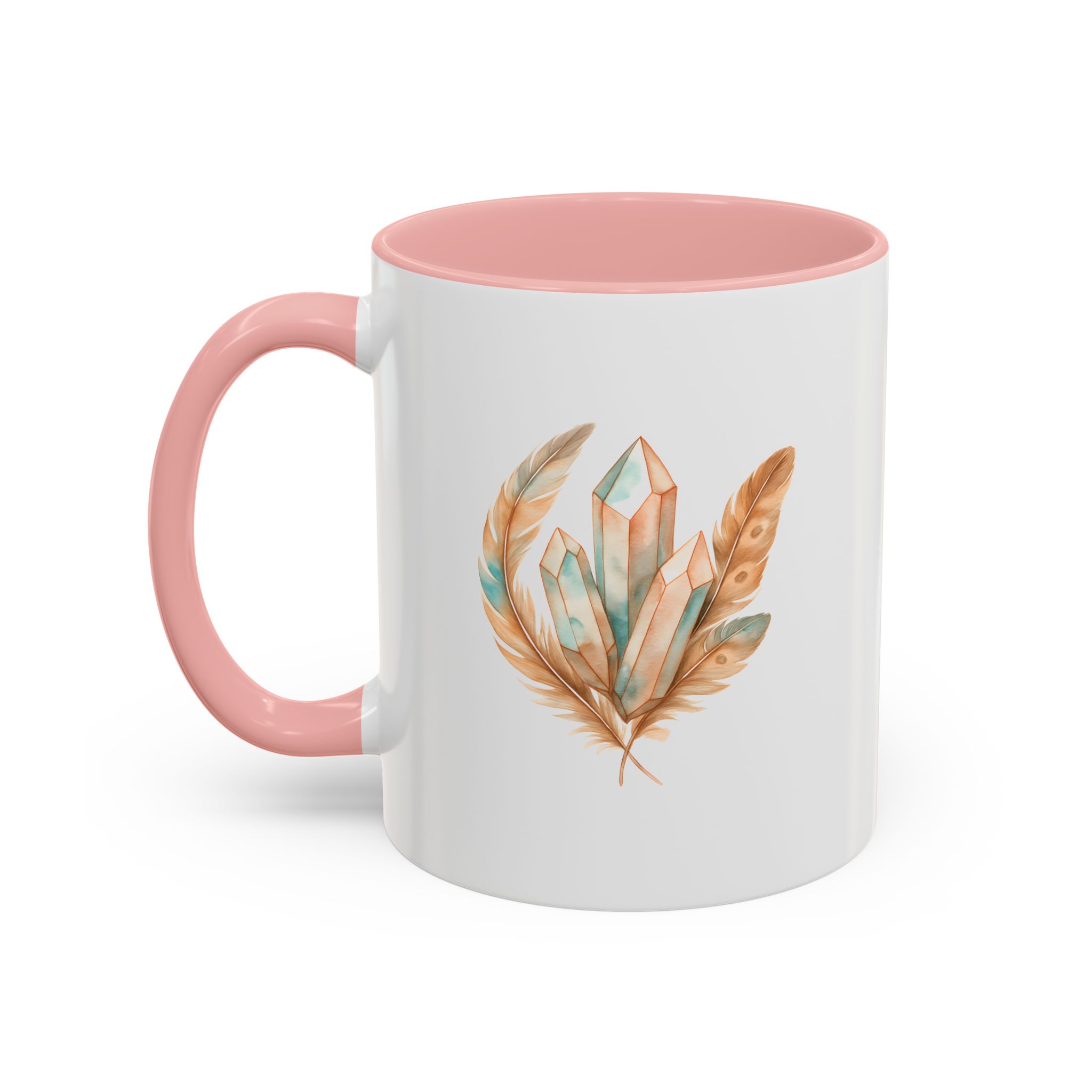 Boho Crystal Healing Mug – Spiritual Coffee Cup with Feathers & Crystals