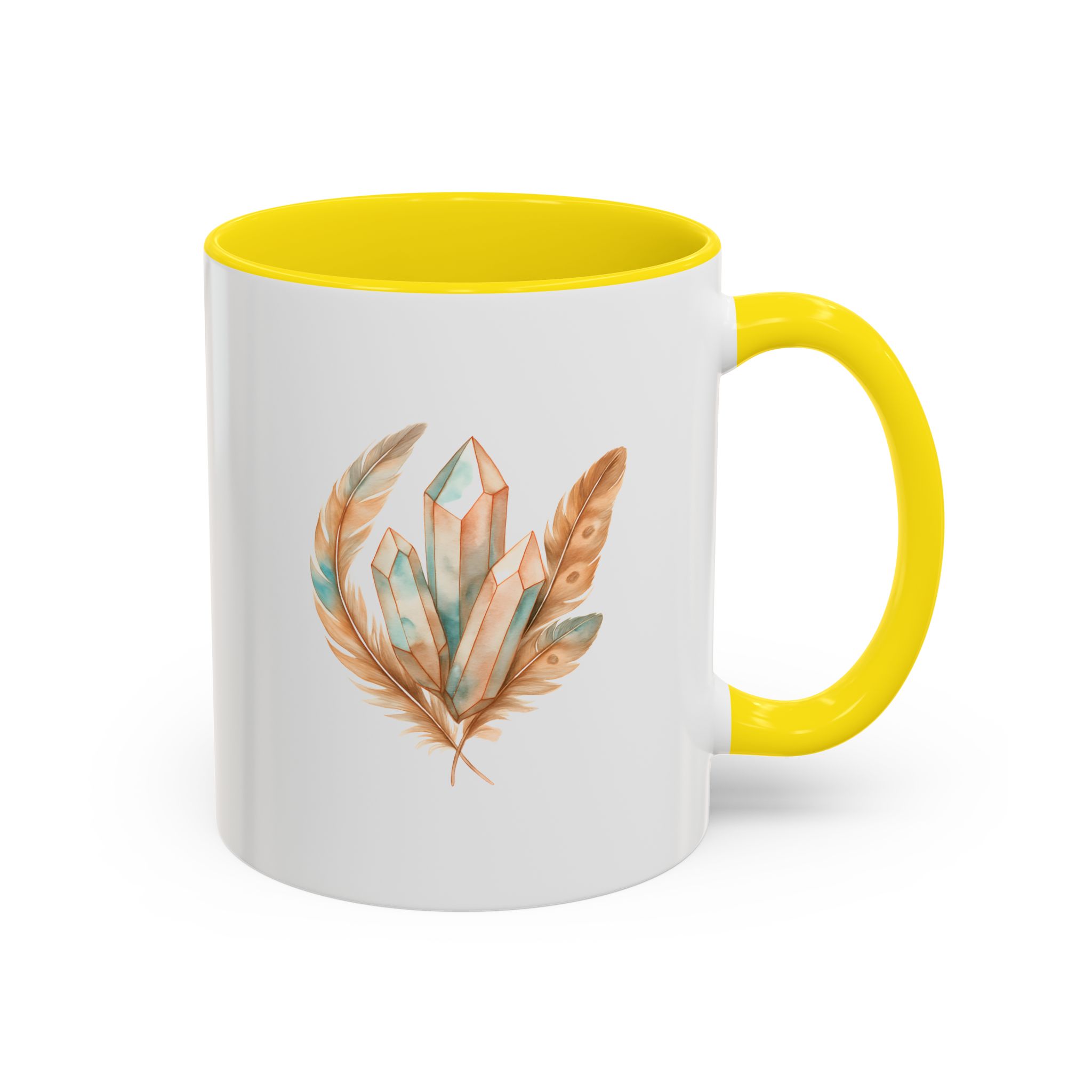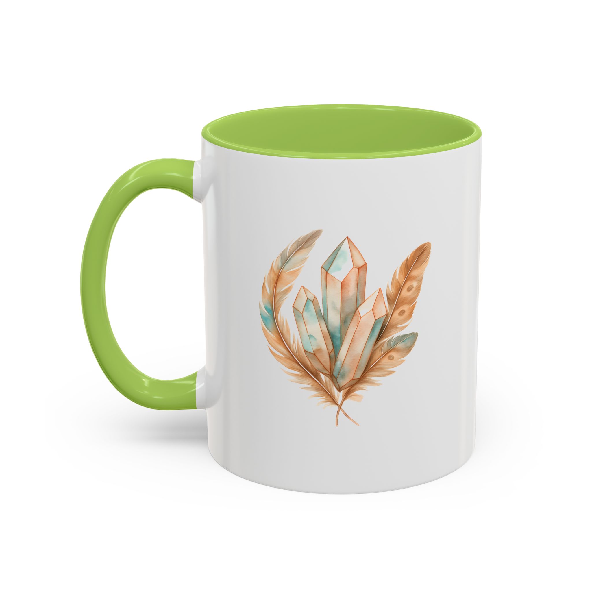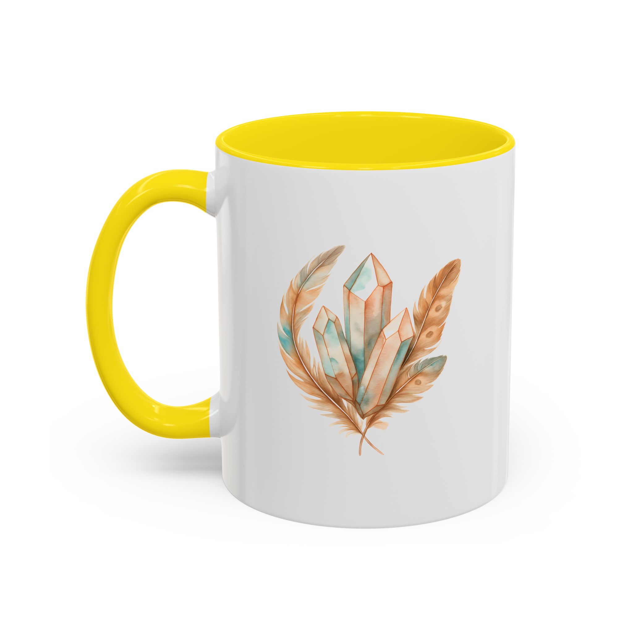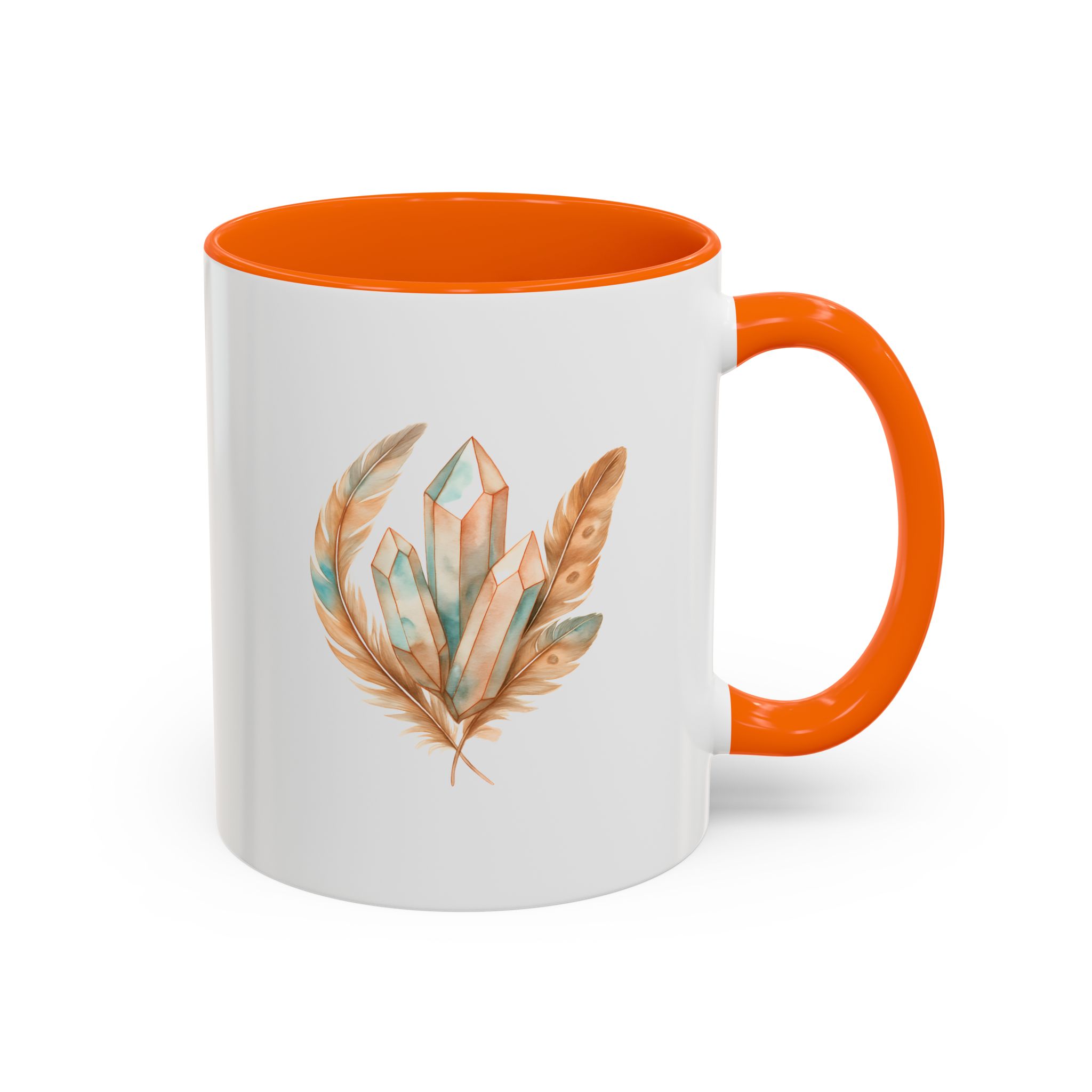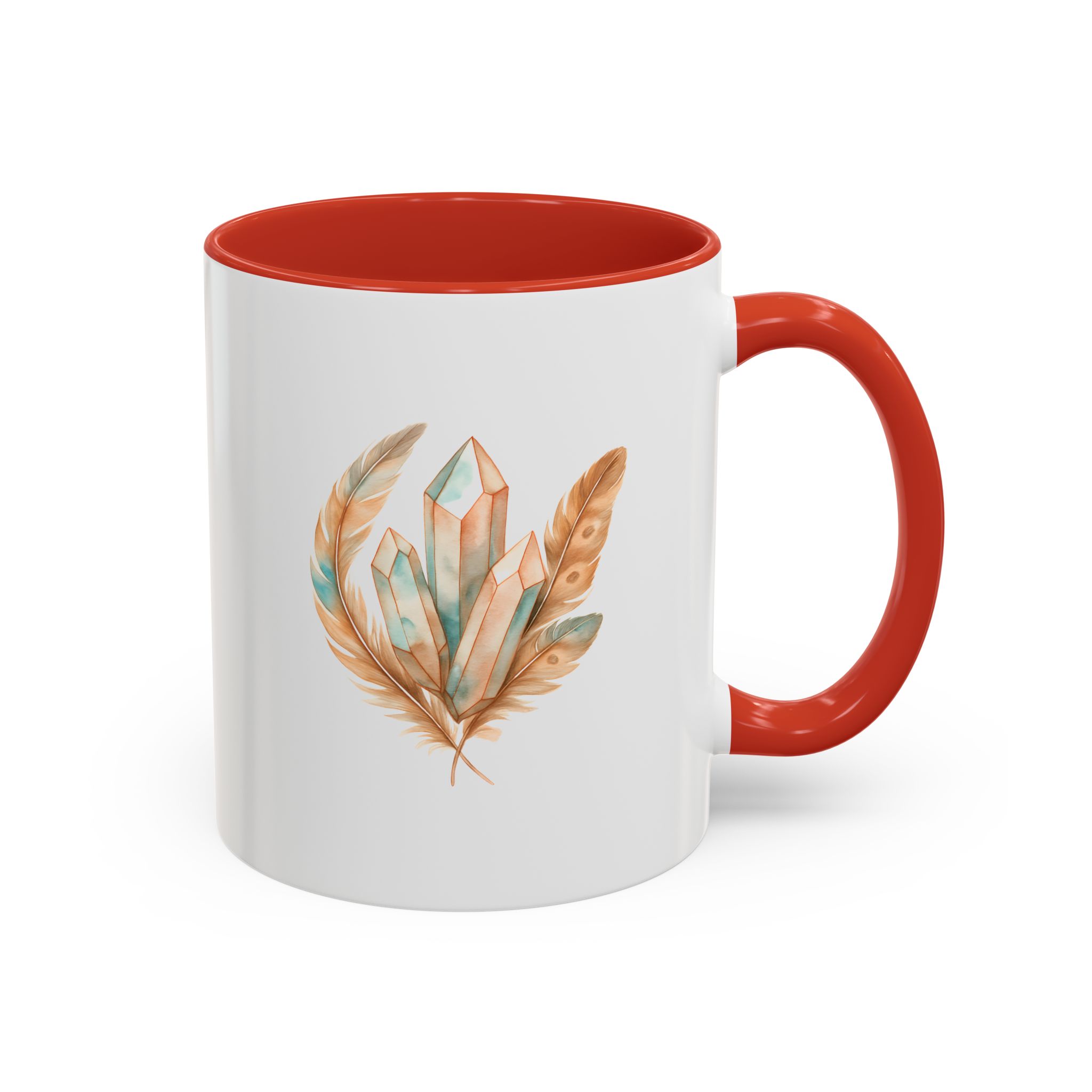Boho Crystal Healing Mug – Spiritual Coffee Cup with Feathers & Crystals