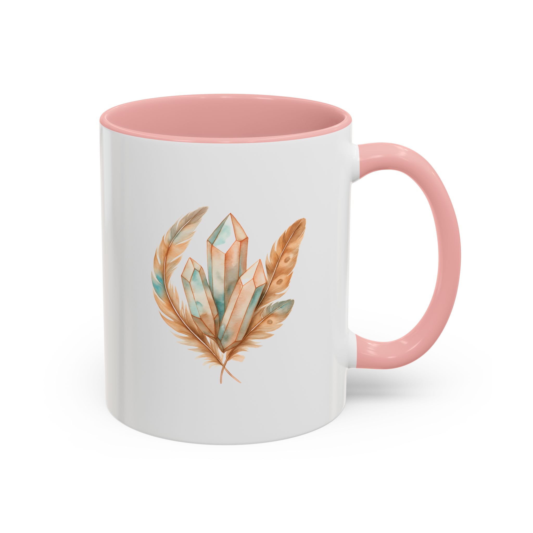 This boho crystal healing mug features a beautiful feather and crystal design — a mindful gift for spiritual souls and crystal lovers.