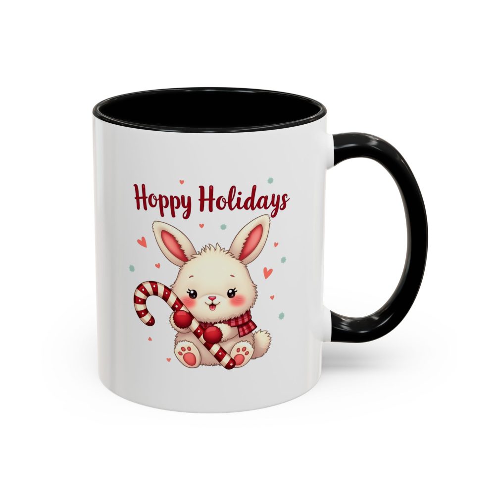 Spread holiday cheer with this adorable “Hoppy Holidays” bunny Christmas mug. Featuring a cute bunny holding a festive candy cane, surrounded by hearts and snowflakes, this design is part of our bunny christmas mug collection.
