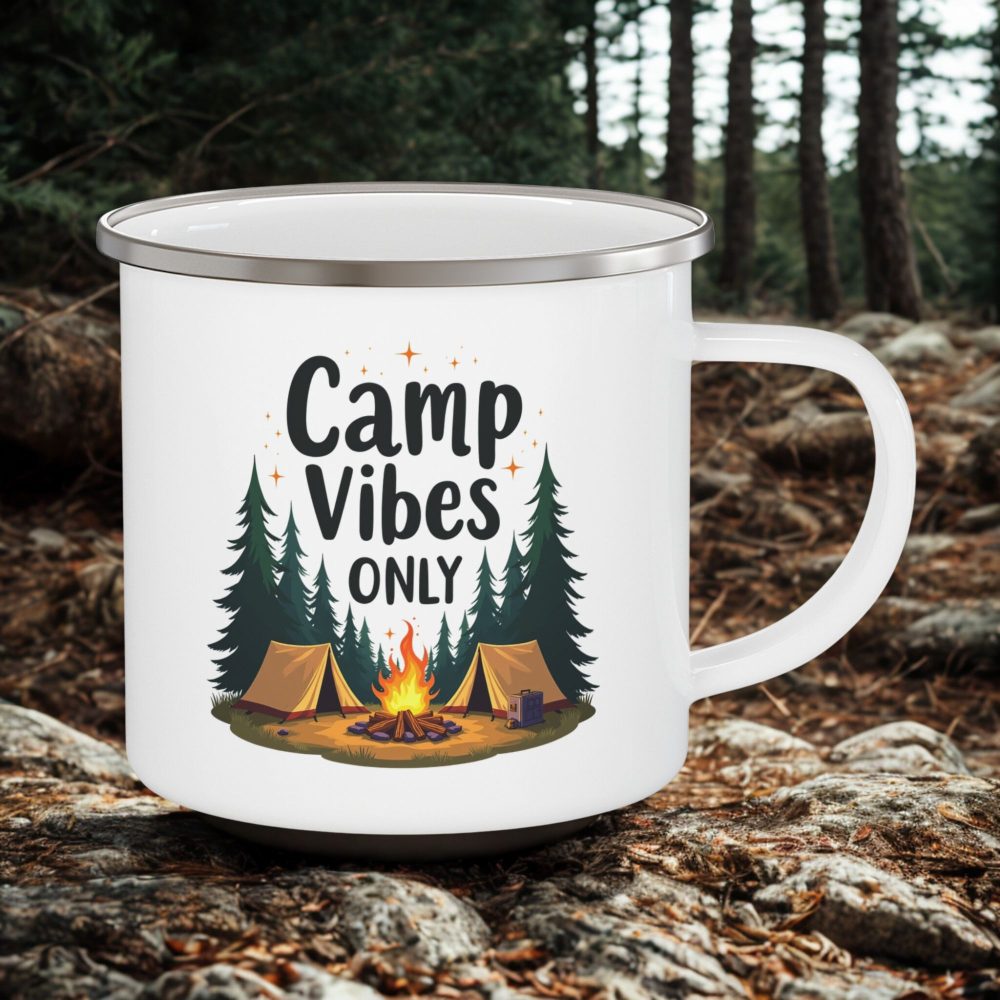 Celebrate relaxed outdoor living with this Camp Vibes enamel mug. A lightweight 12oz camping mug with a cosy campsite design — perfect for coffee by the fire, camping trips, and everyday use. Hand wash only.