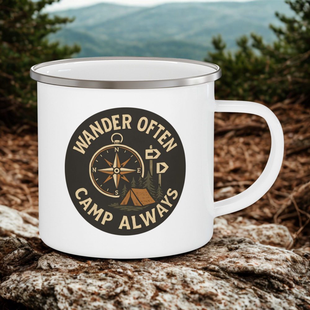 Featuring a bold circular compass design with the phrase “Wander Often Camp Always”, this enamel mug captures the spirit of navigation, travel, and outdoor freedom. Printed using vibrant, full-colour dye-sublimation, the design stays crisp and long-lasting. Rounded corners provide a comfortable grip, making it perfect for campsite mornings, road trips, or relaxing at home.