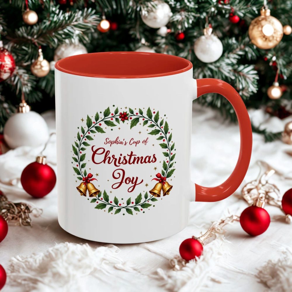 • 🎄 Personalised “Name’s Cup of Christmas Joy” with elegant wreath and bells