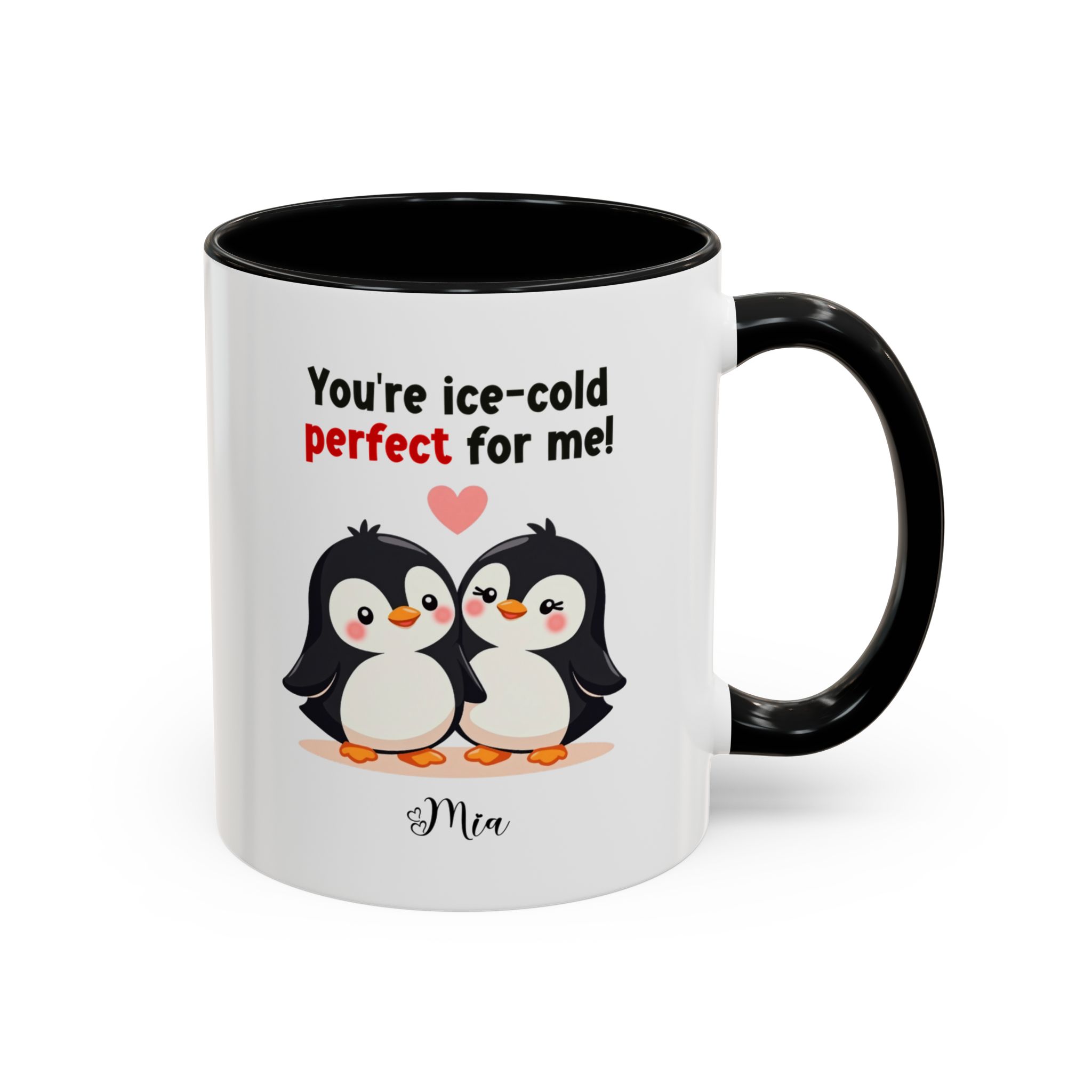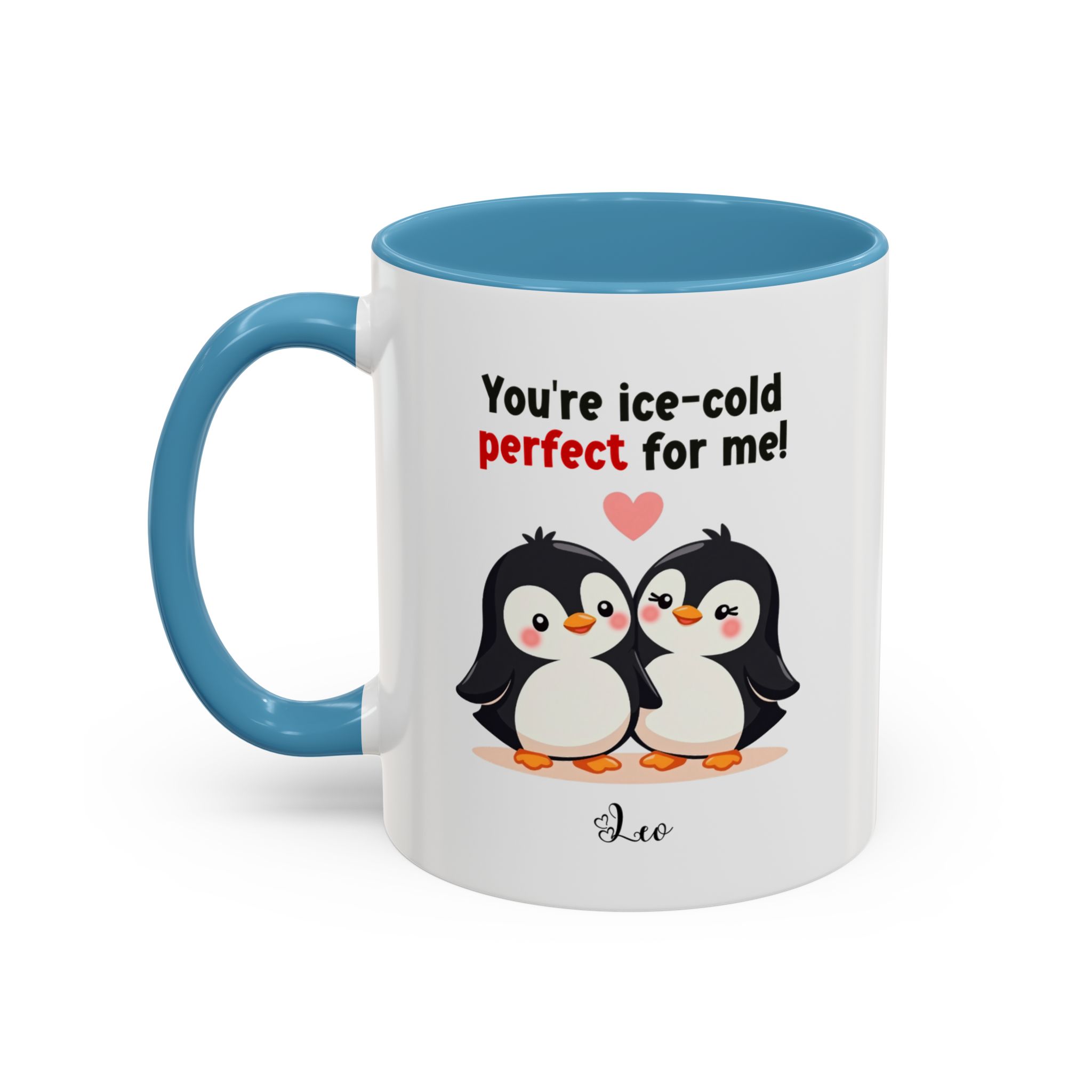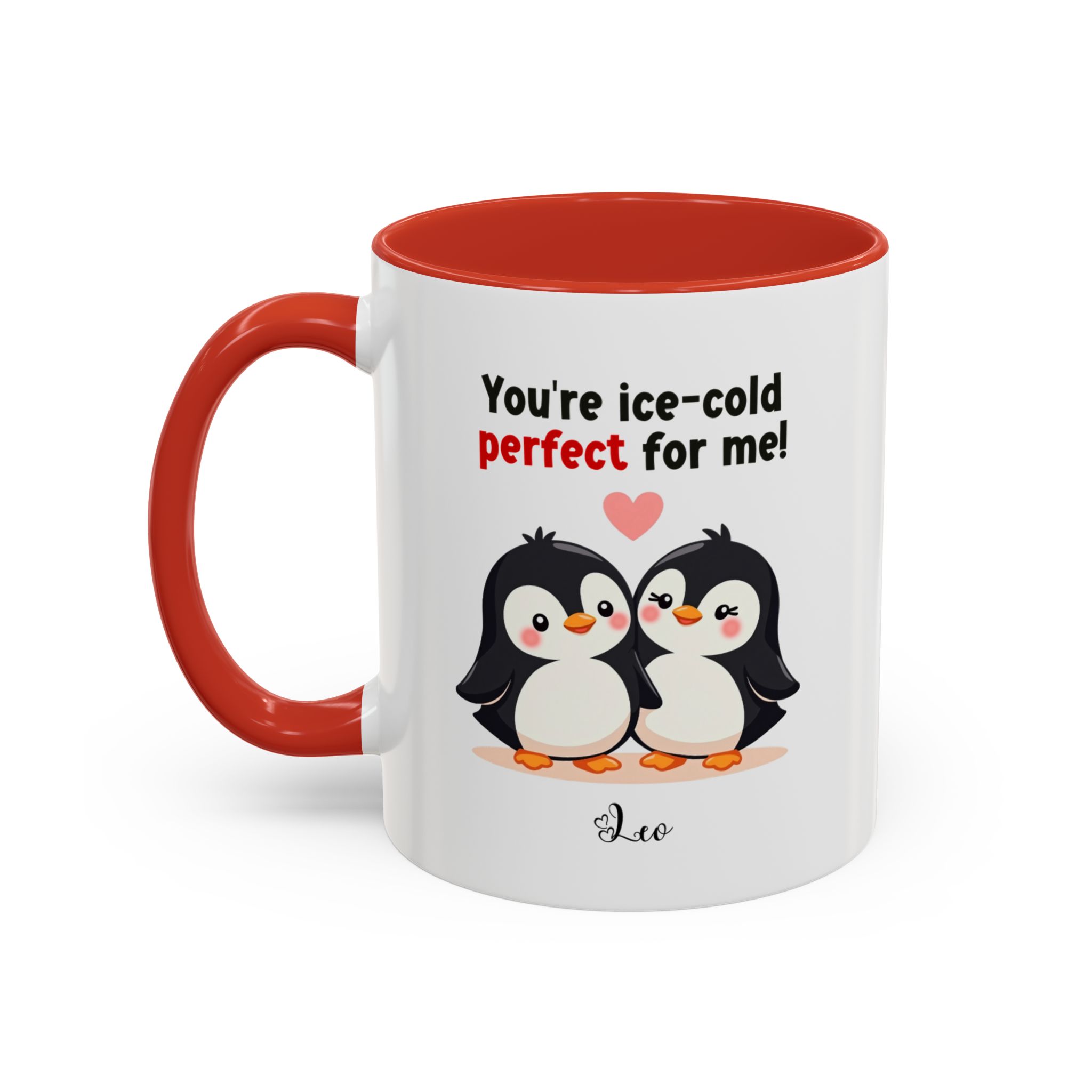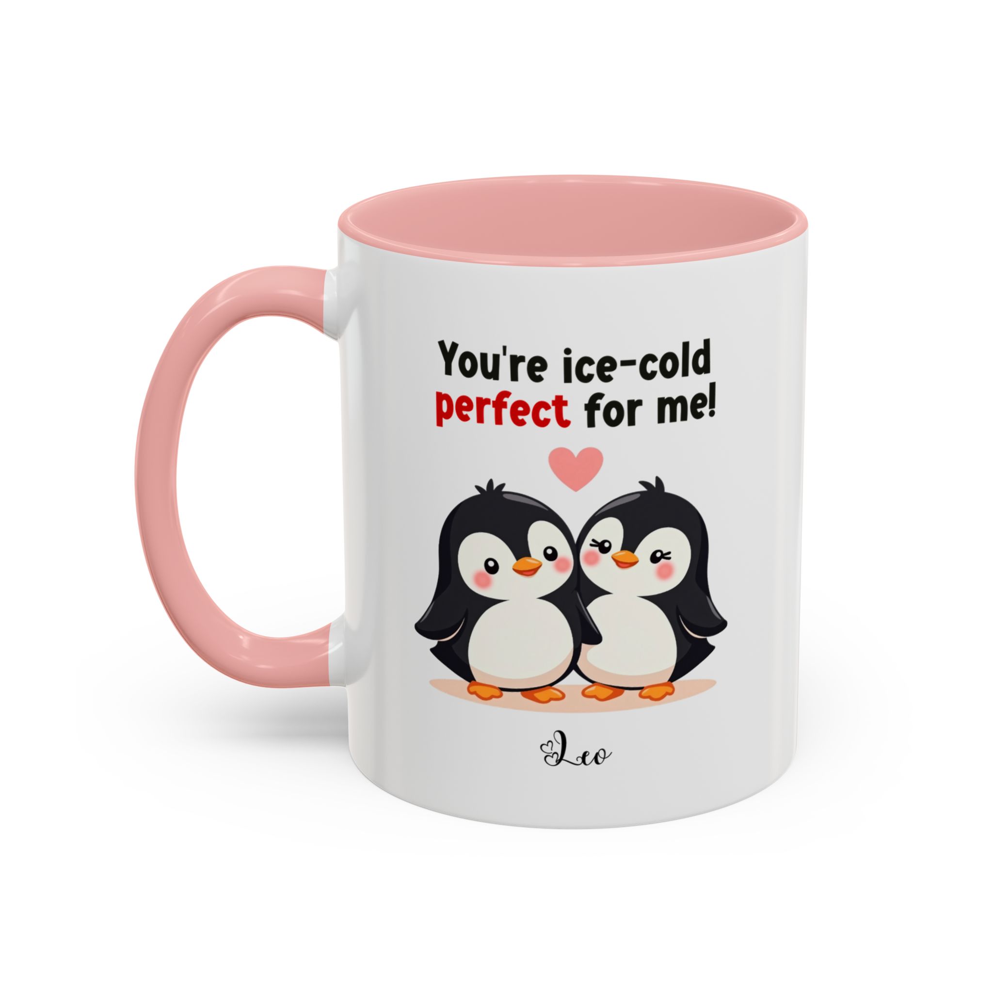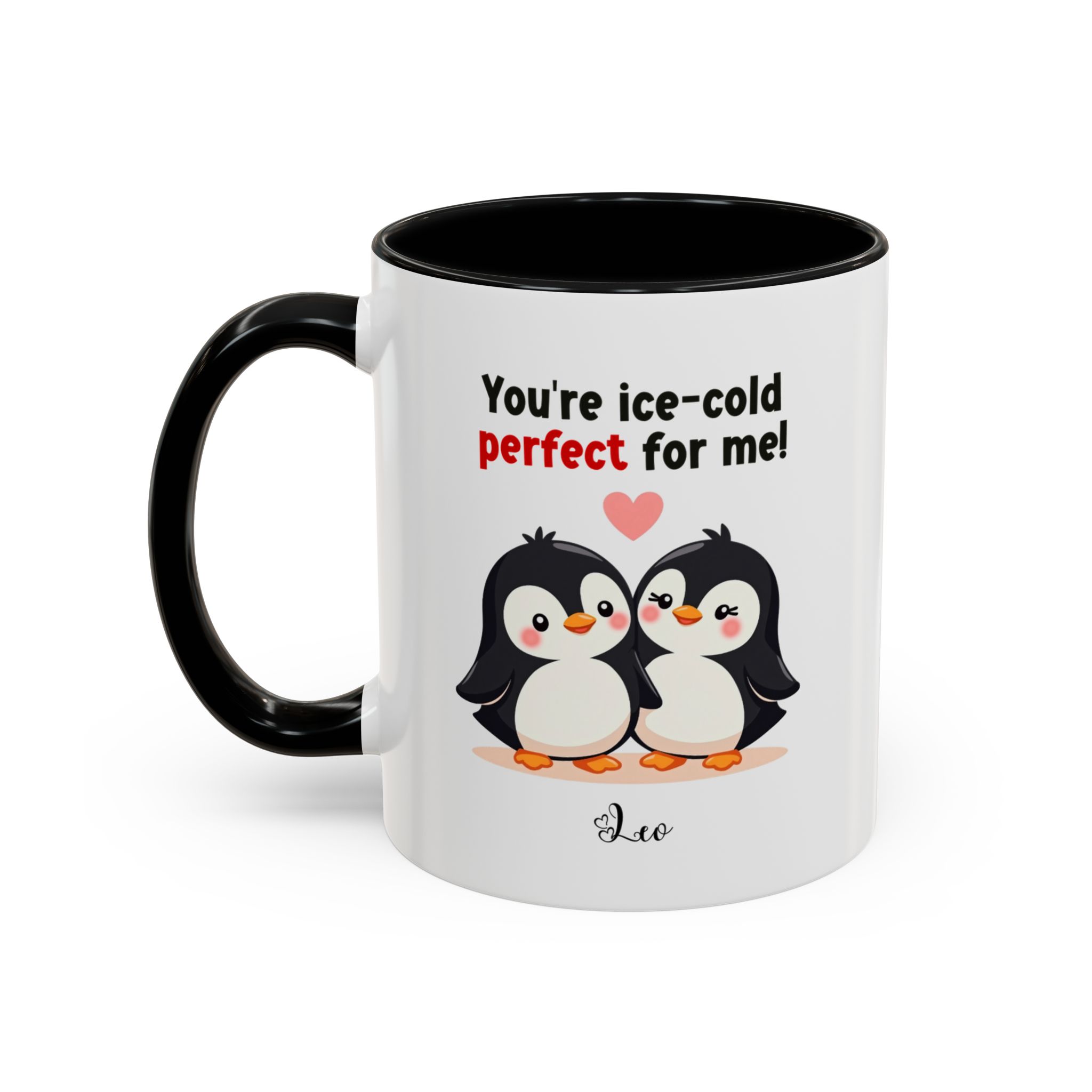 A cute Valentine’s Day mug featuring two cuddly penguins, a heart, and the charming phrase ‘You’re Ice-Cold Perfect for Me!’. Personalised with a name starting with a heart symbol, this 11oz mug is microwave & dishwasher safe—ideal for a romantic gift!