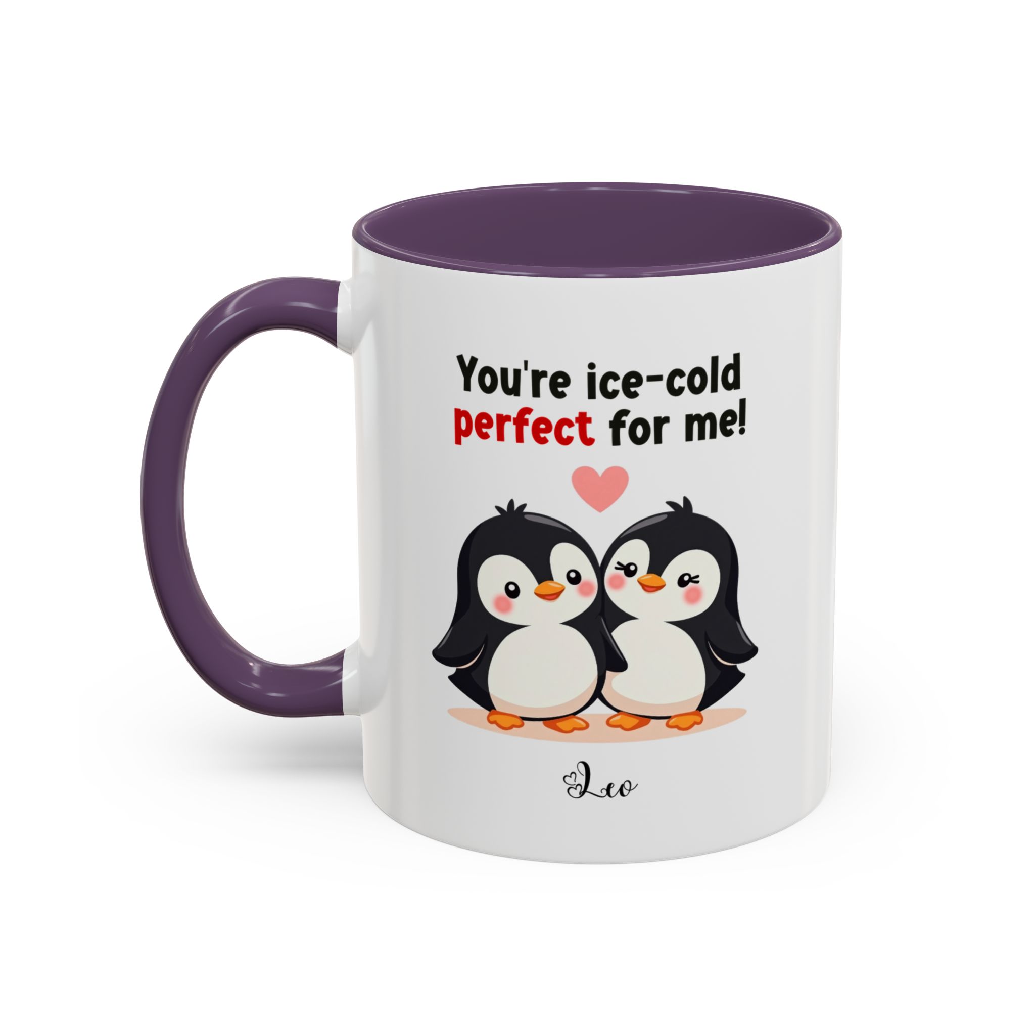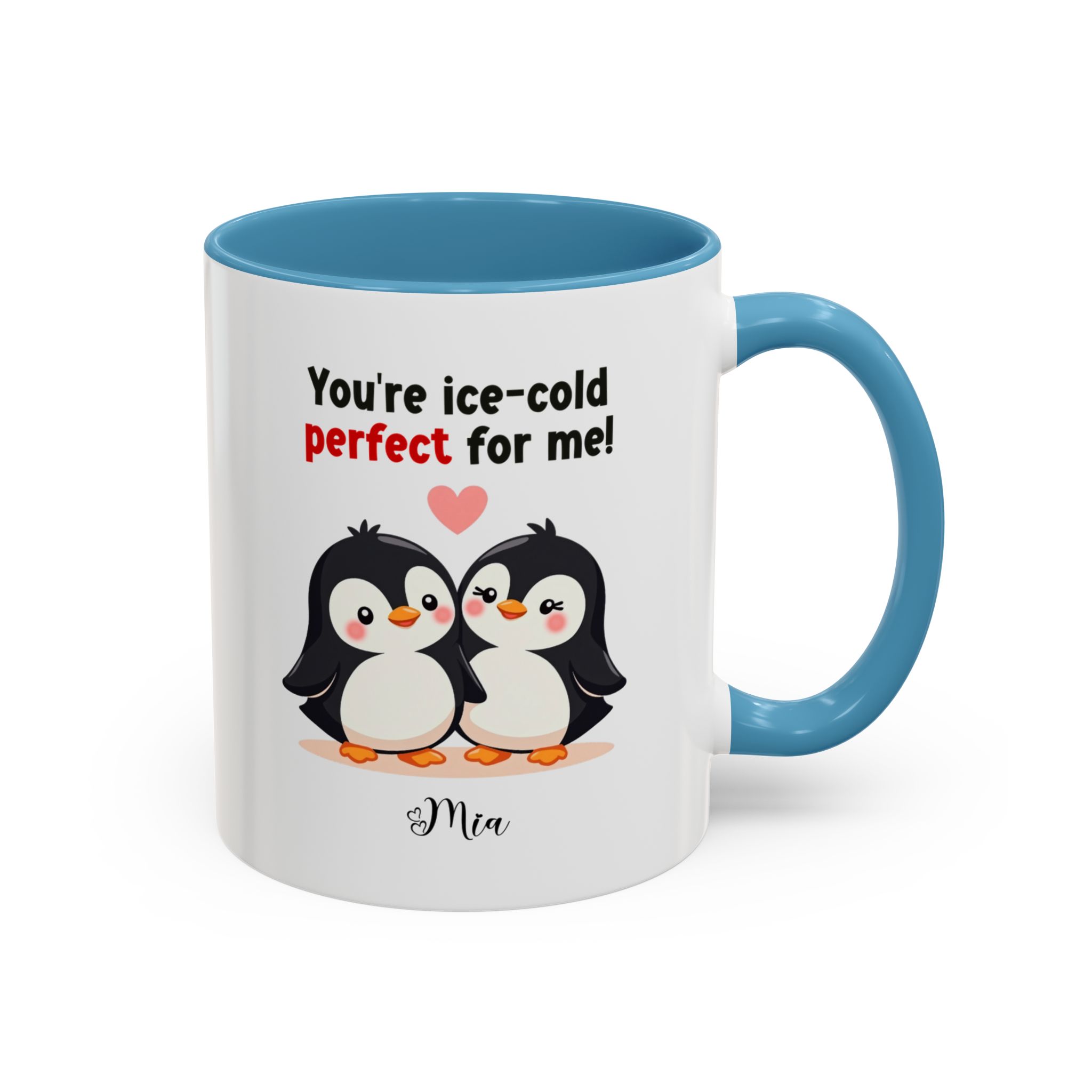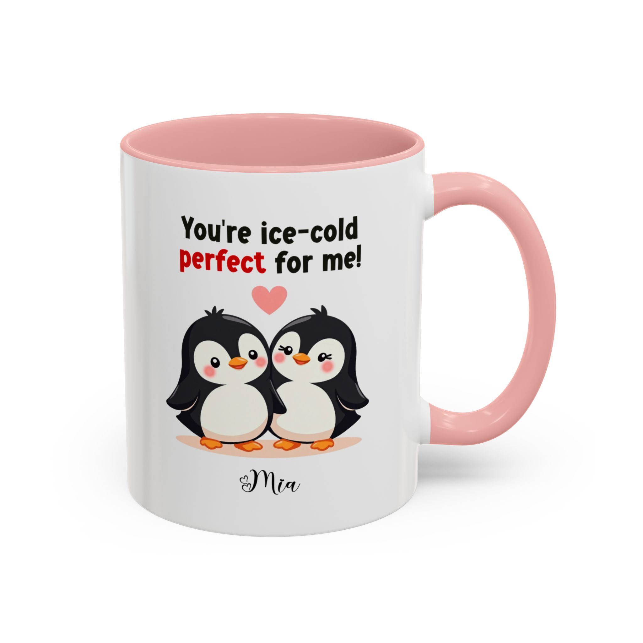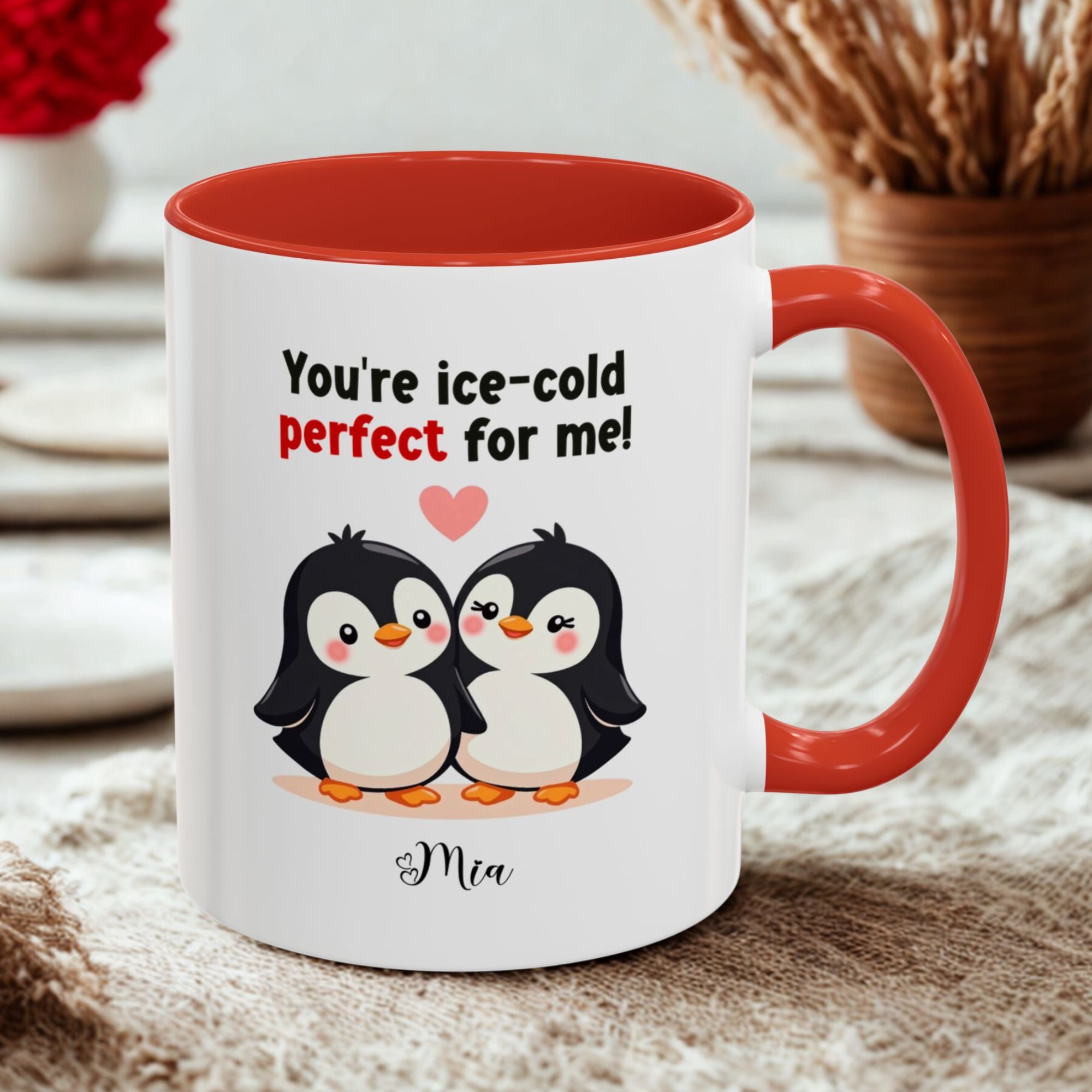 A cute Valentine’s Day mug featuring two cuddly penguins, a heart, and the charming phrase ‘You’re Ice-Cold Perfect for Me!’. Personalised with a name starting with a heart symbol, this 11oz mug is microwave & dishwasher safe—ideal for a romantic gift!