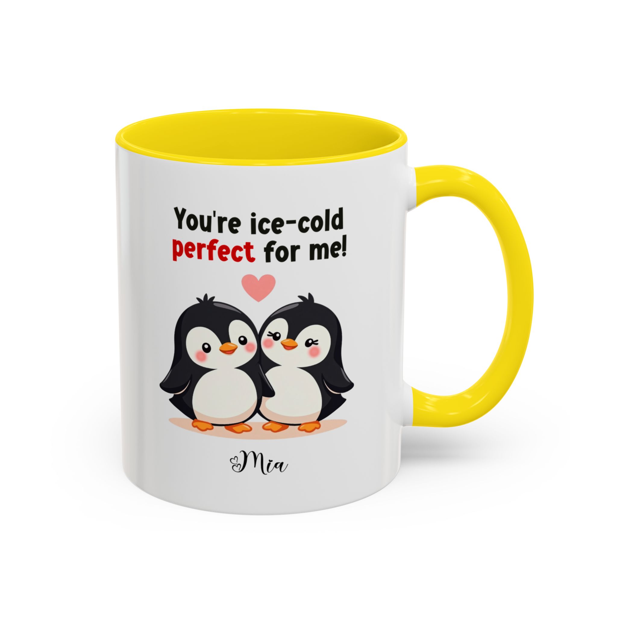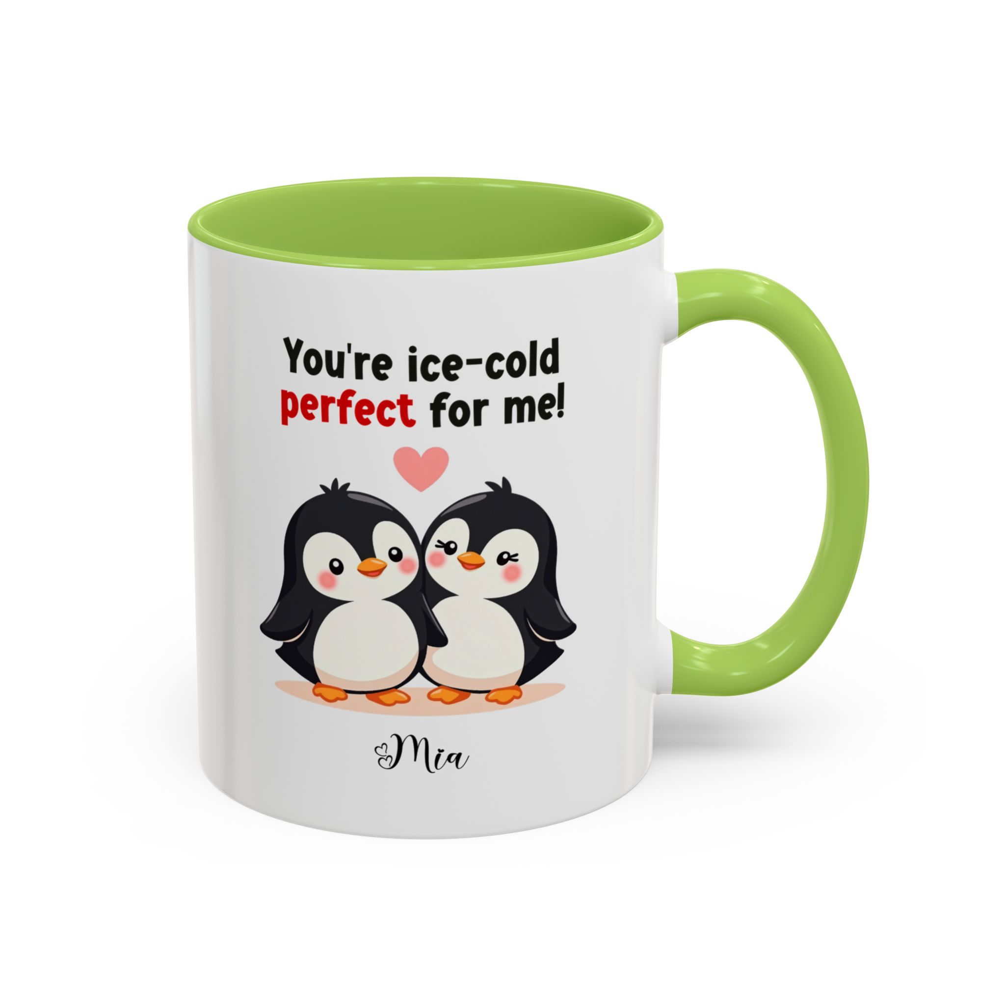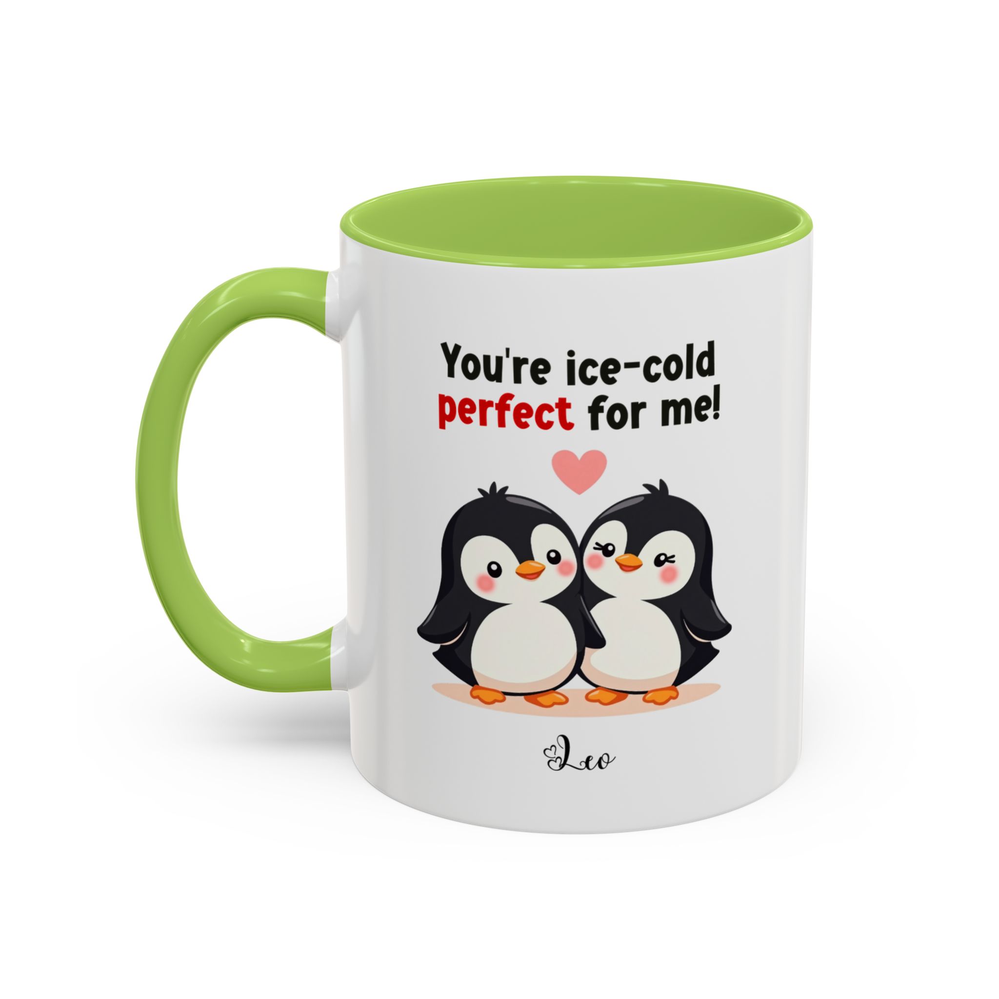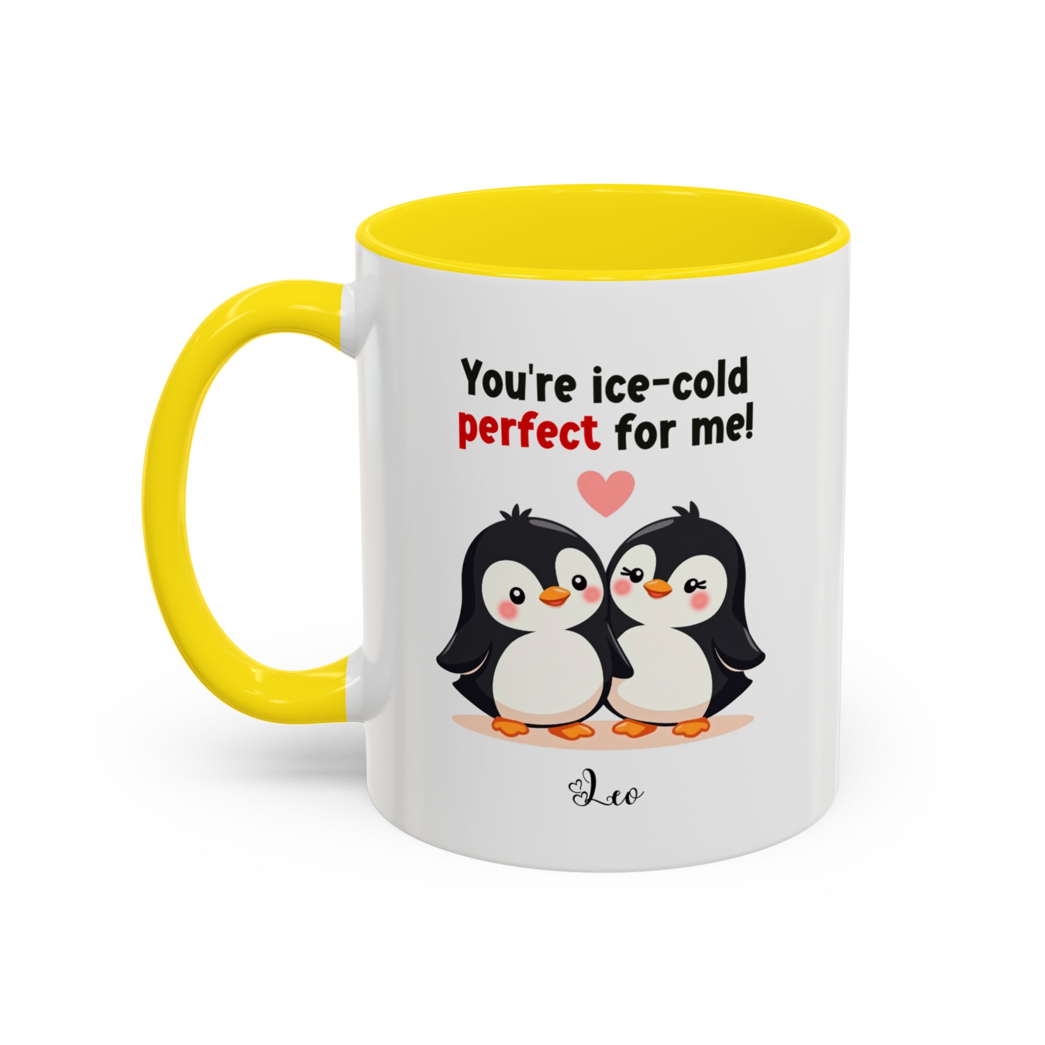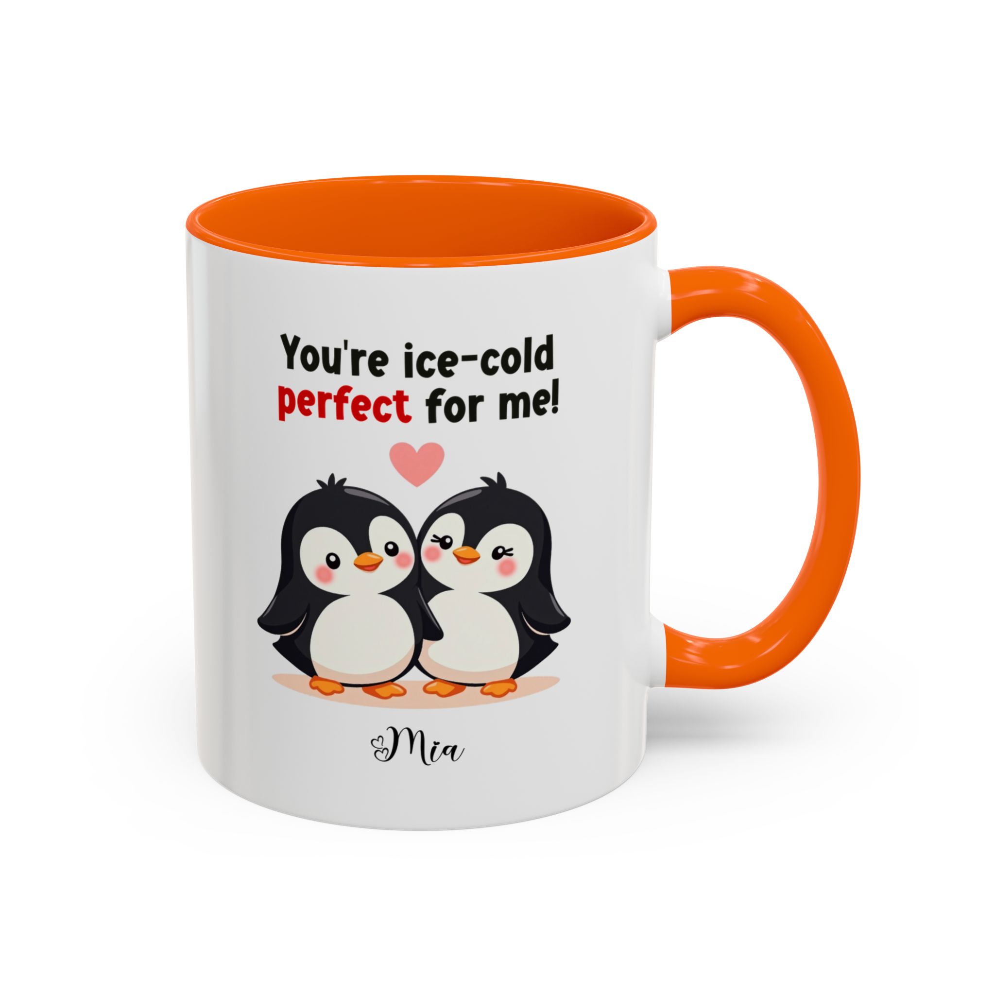 A cute Valentine’s Day mug featuring two cuddly penguins, a heart, and the charming phrase ‘You’re Ice-Cold Perfect for Me!’. Personalised with a name starting with a heart symbol, this 11oz mug is microwave & dishwasher safe—ideal for a romantic gift!
