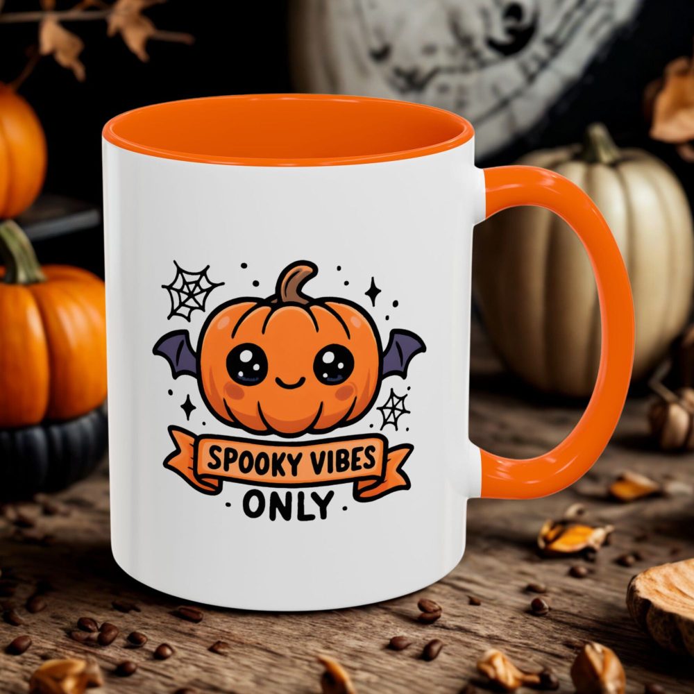 Cute Spooky Mug with kawaii pumpkin and “Spooky Vibes Only” design. Perfect for Halloween or everyday coffee and tea lovers.