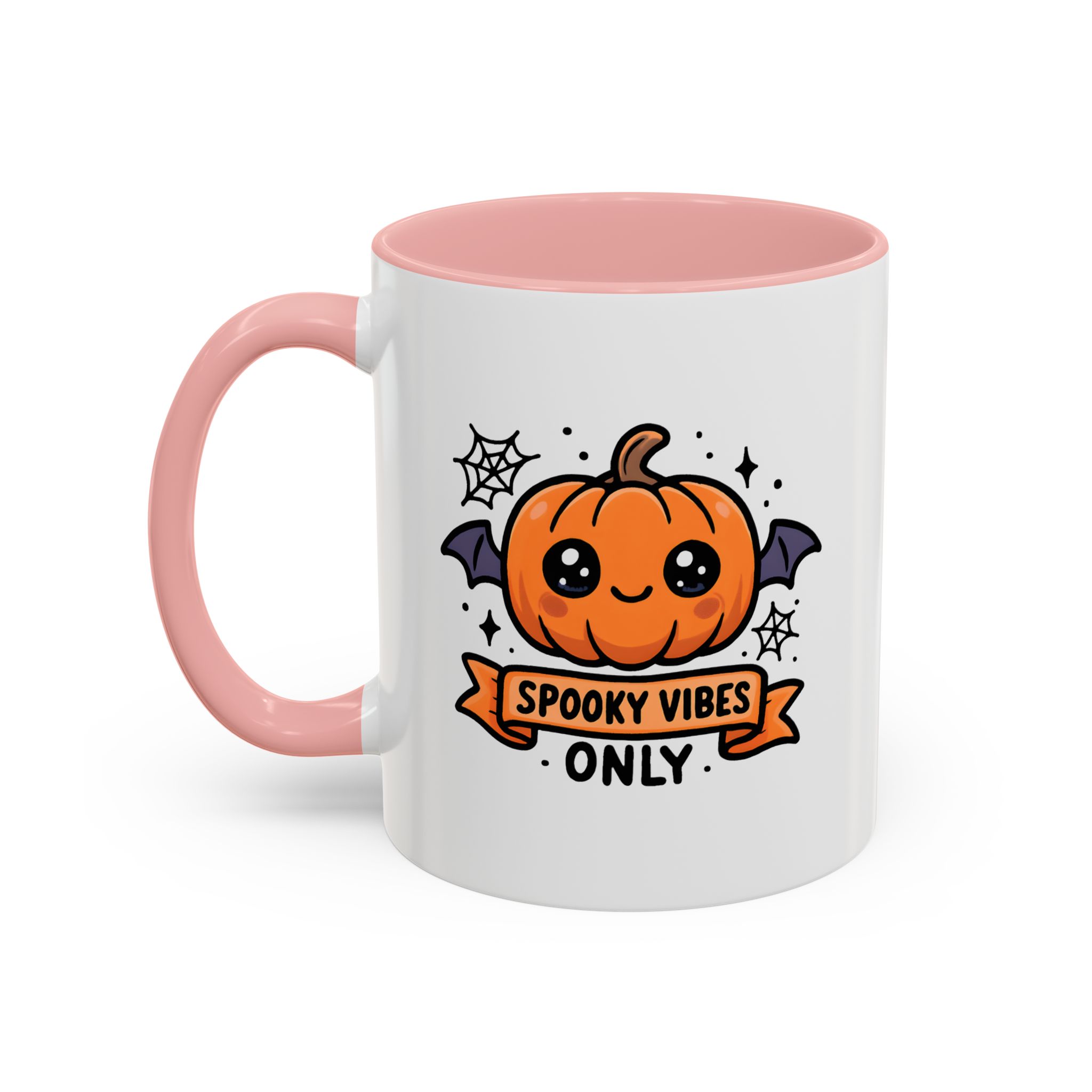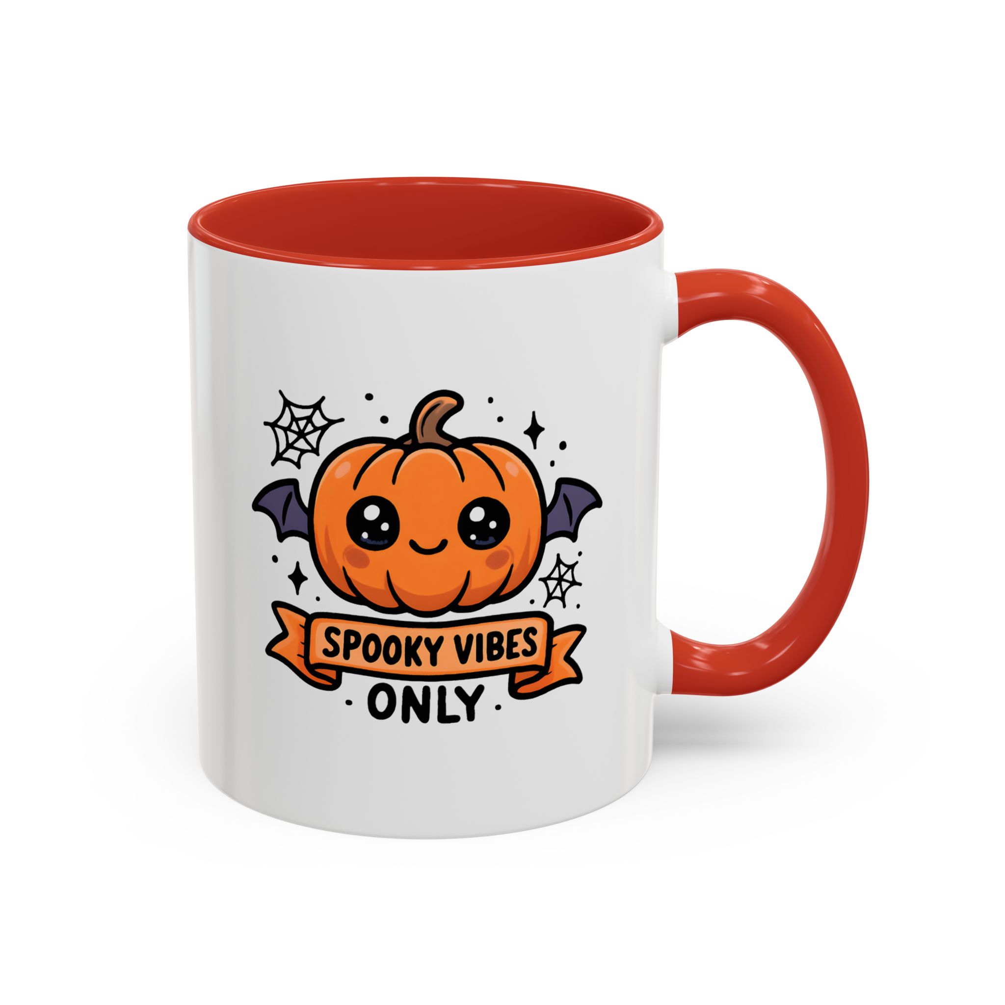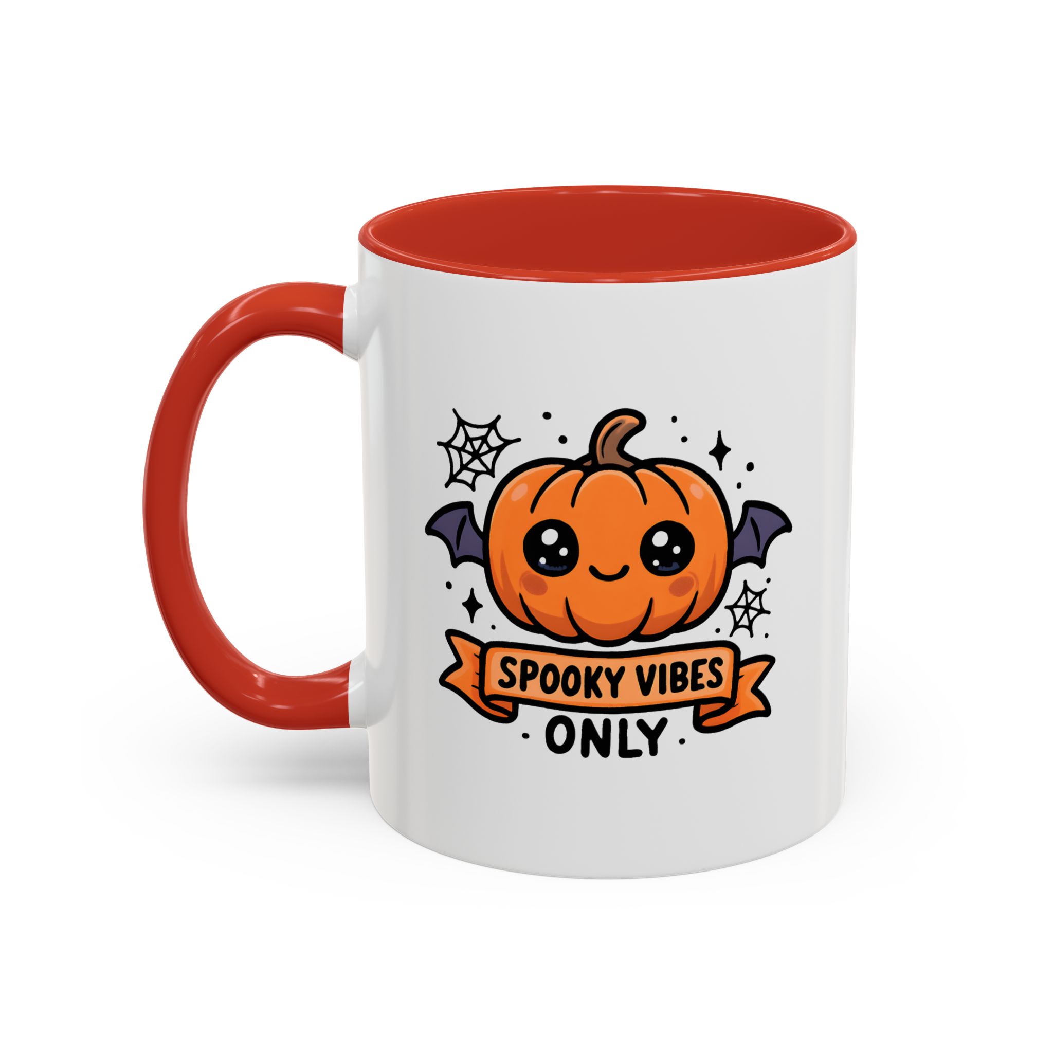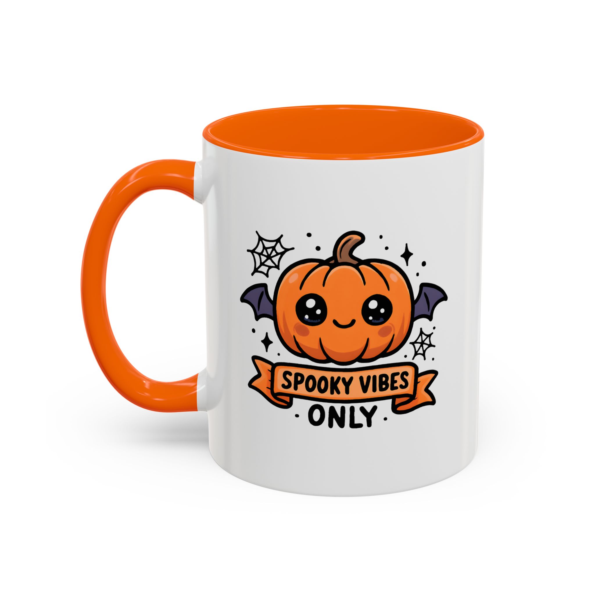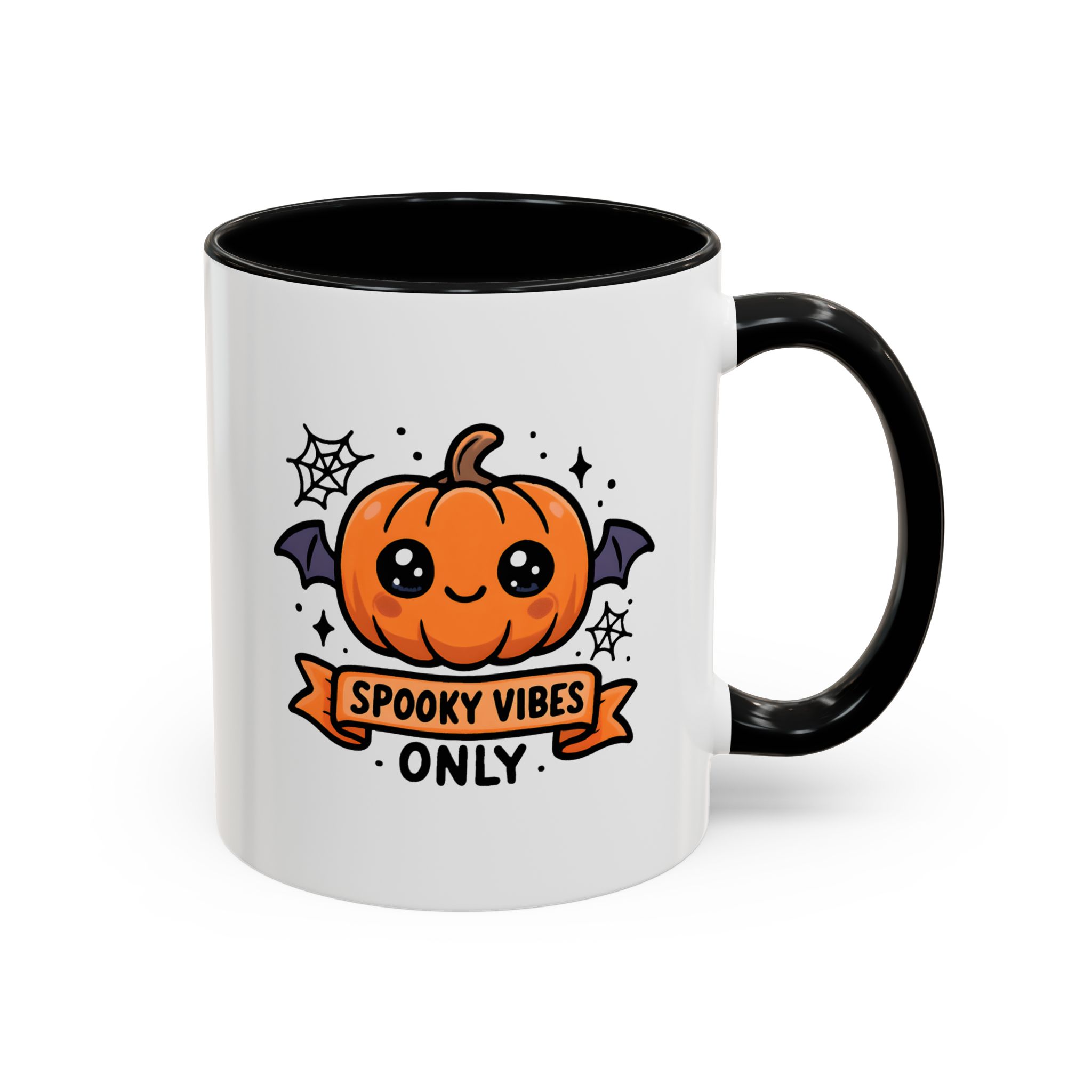 Bring adorable Halloween charm to your mornings with this Cute Spooky Mug. Featuring a smiling pumpkin with bat wings, cobweb accents, and the phrase “Spooky Vibes Only”, this kawaii-inspired mug adds a playful twist to your daily coffee or tea.