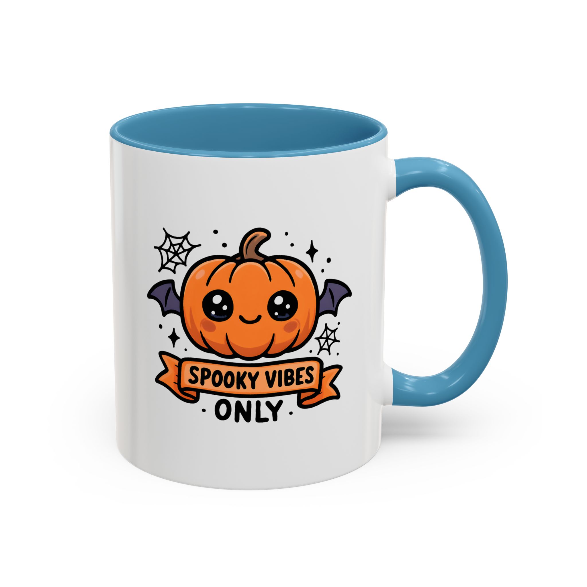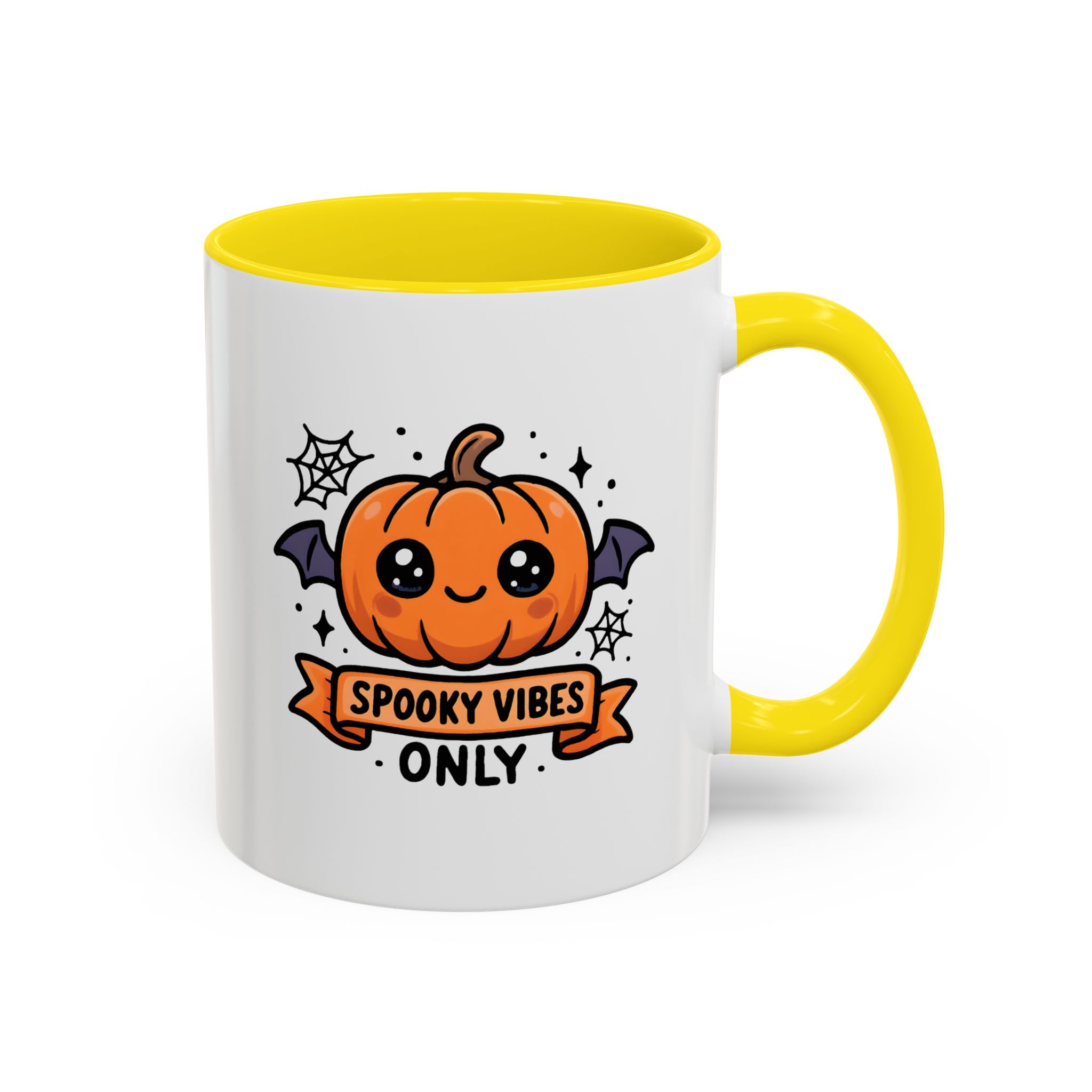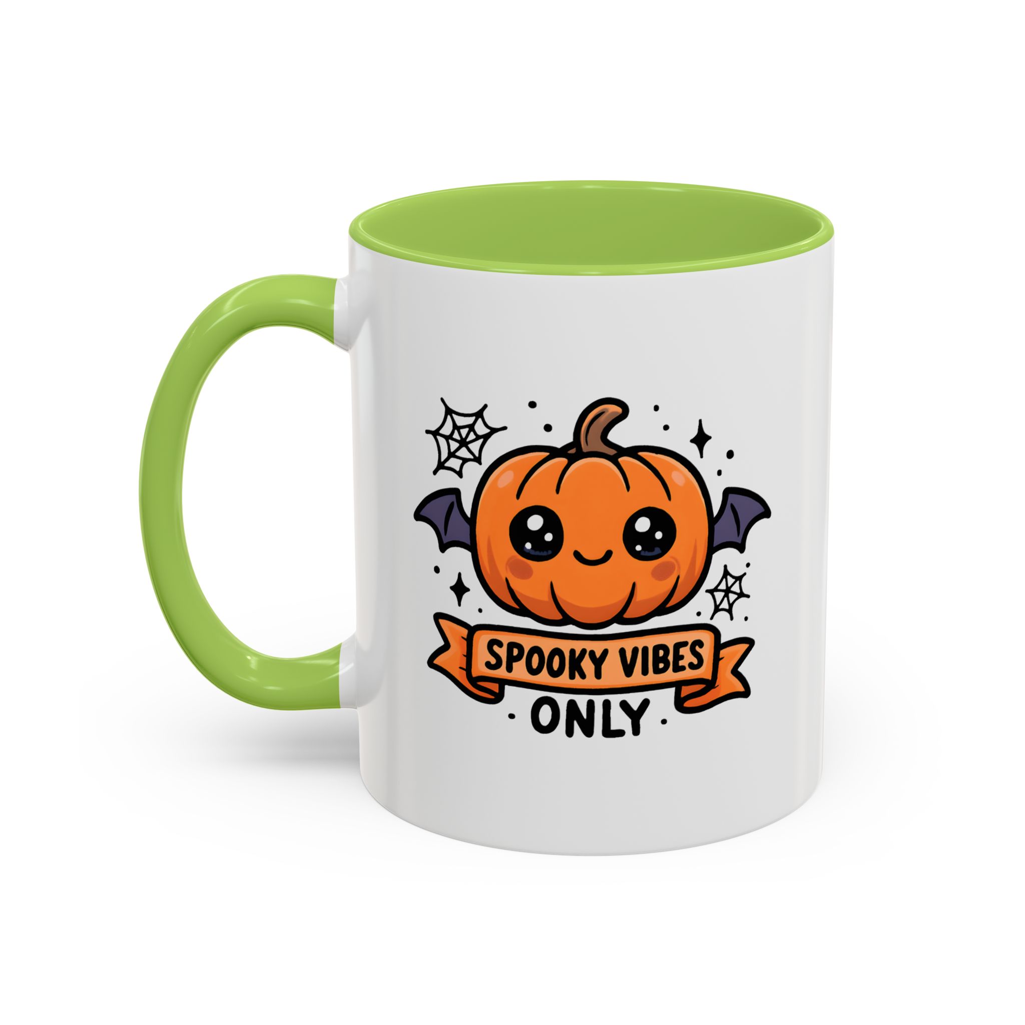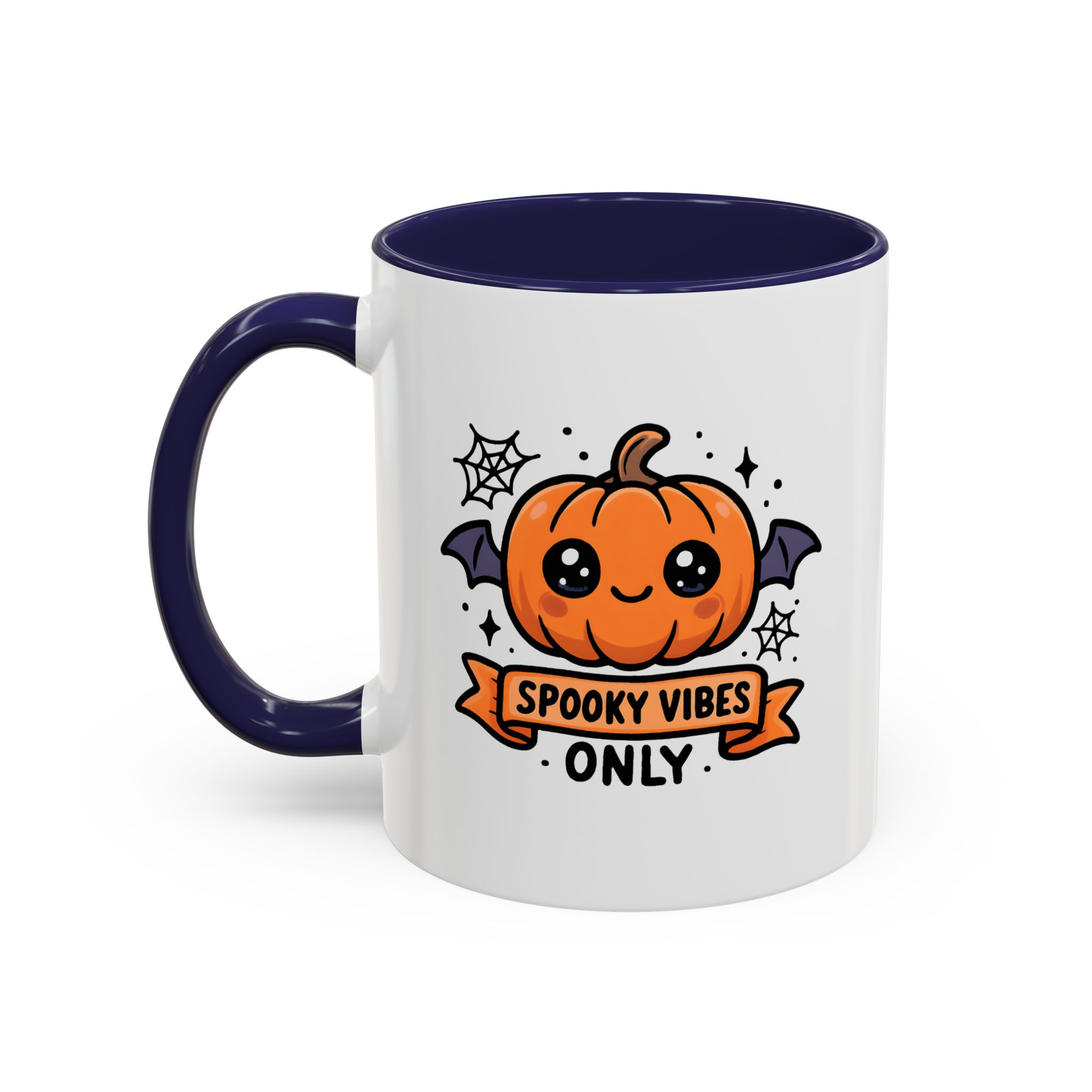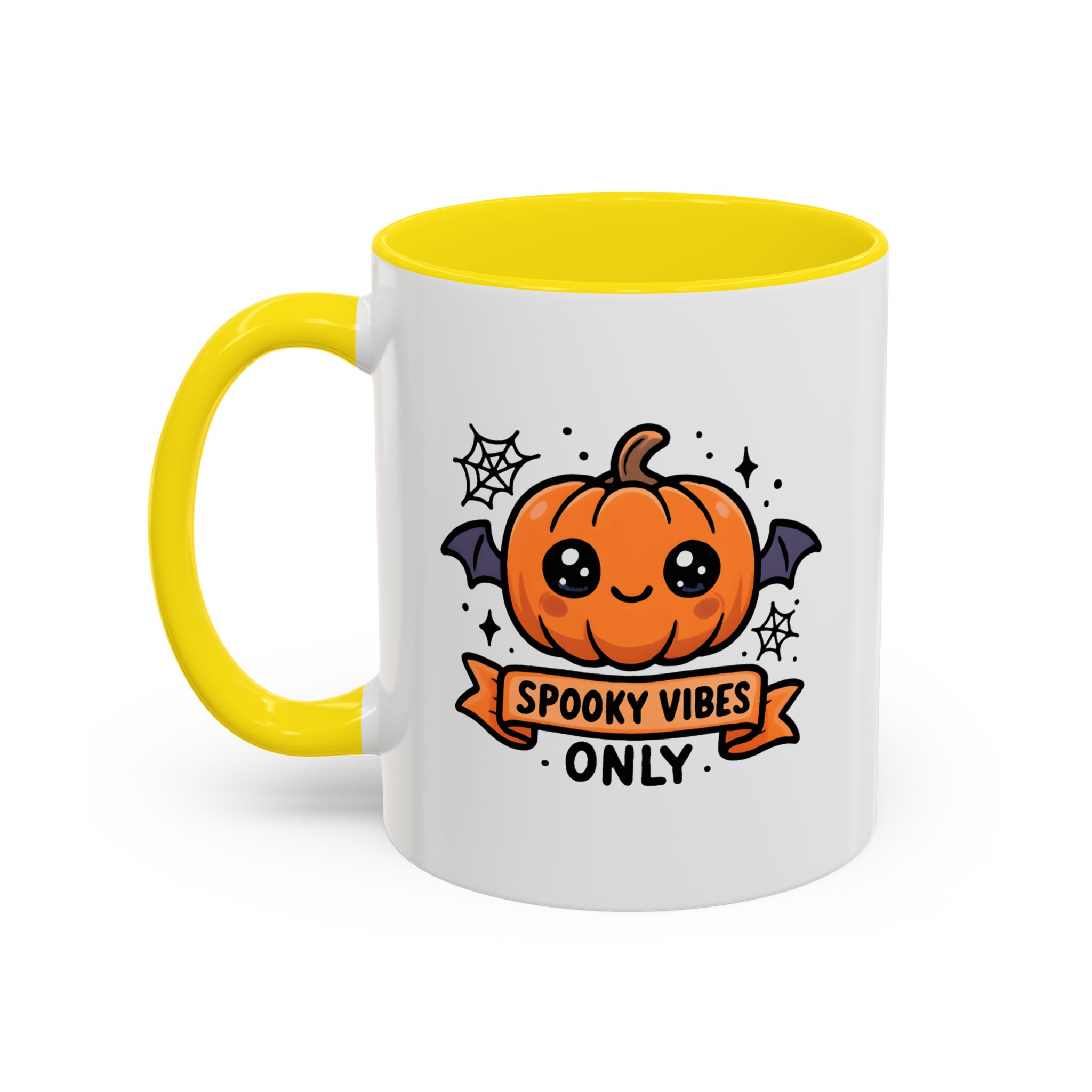 Bring adorable Halloween charm to your mornings with this Cute Spooky Mug. Featuring a smiling pumpkin with bat wings, cobweb accents, and the phrase “Spooky Vibes Only”, this kawaii-inspired mug adds a playful twist to your daily coffee or tea.
