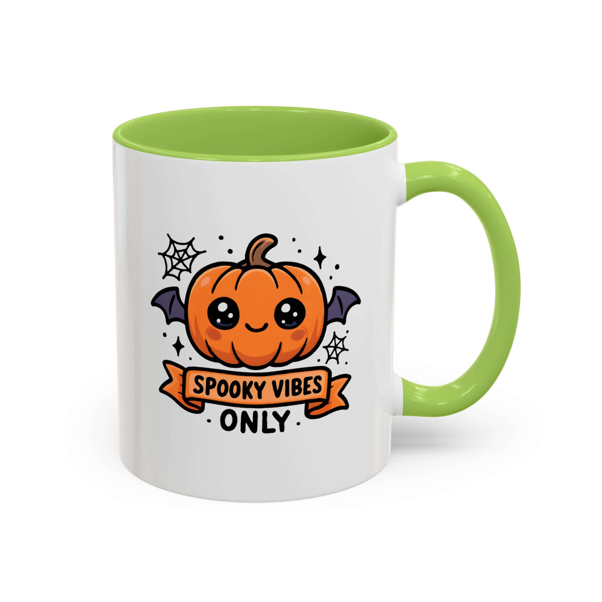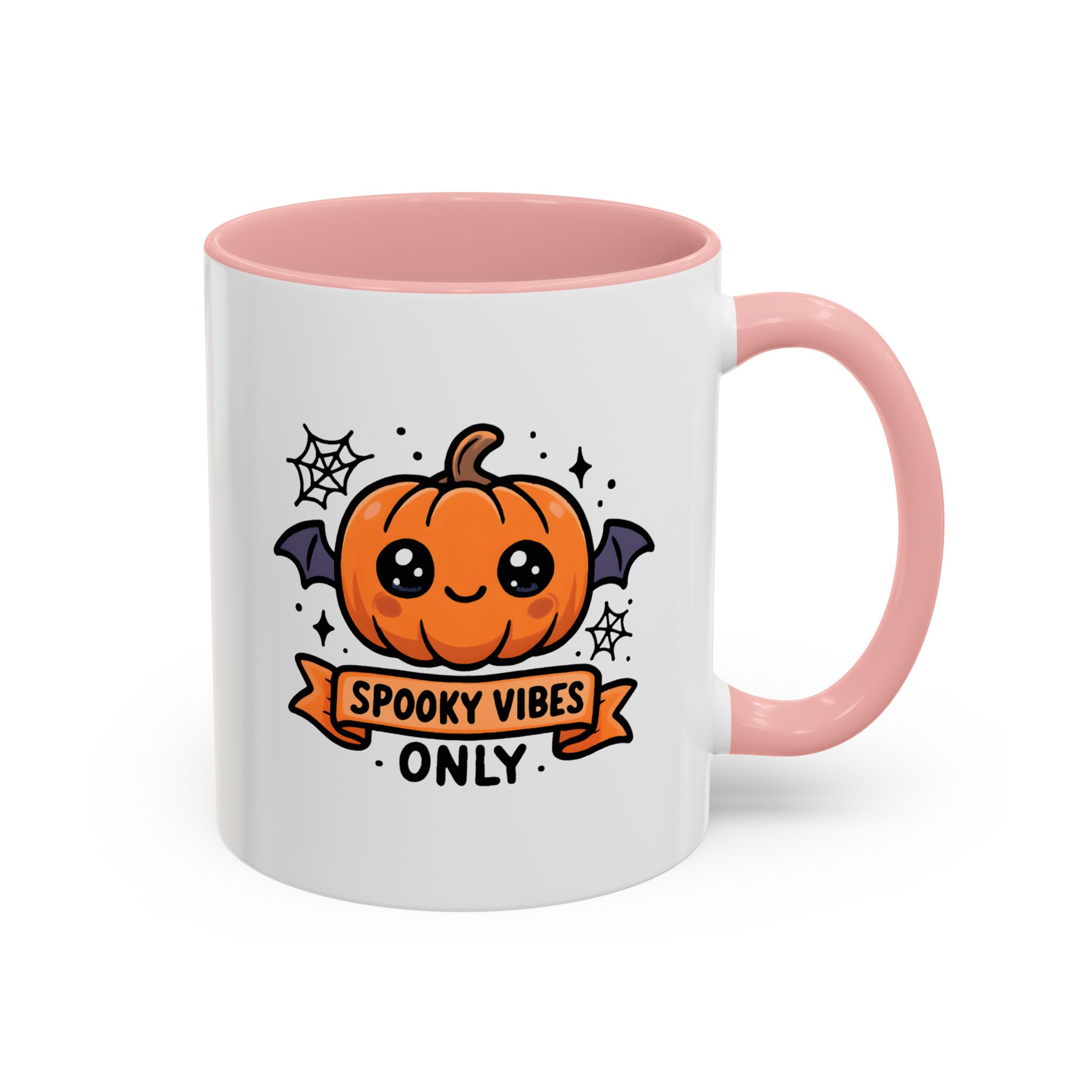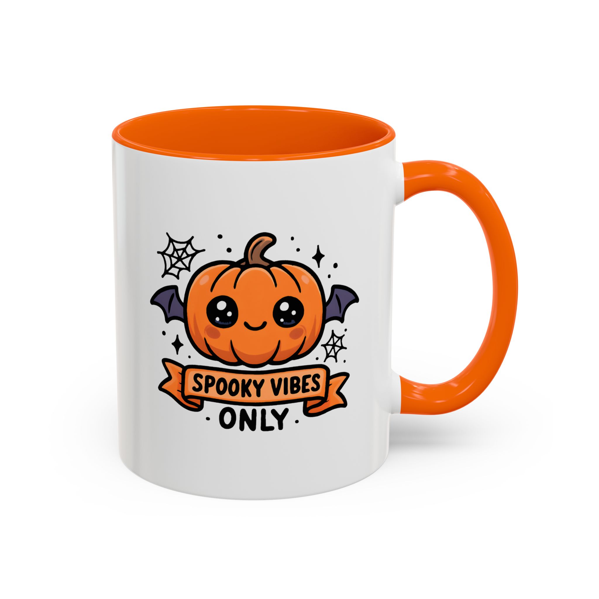 Cute Spooky Mug with kawaii pumpkin and “Spooky Vibes Only” design. Perfect for Halloween or everyday coffee and tea lovers.