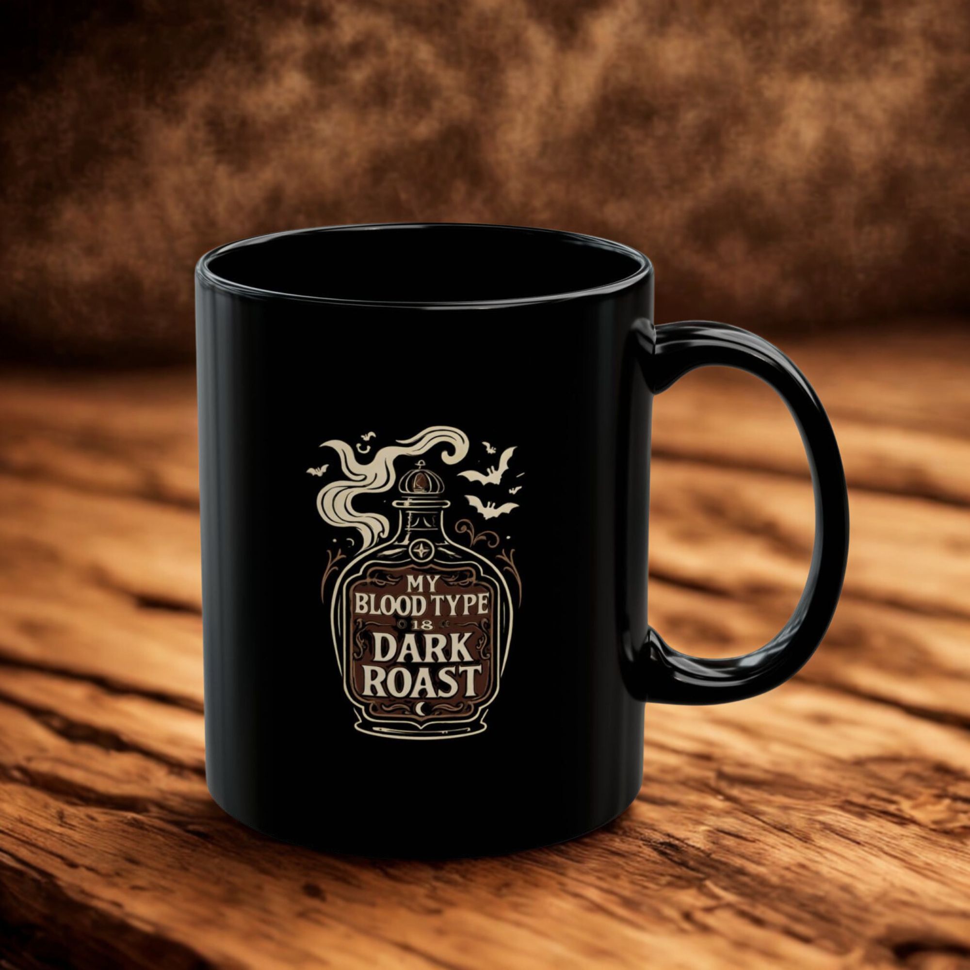 • Black ceramic mug with gothic “My Blood Type is Dark Roast” bottle design