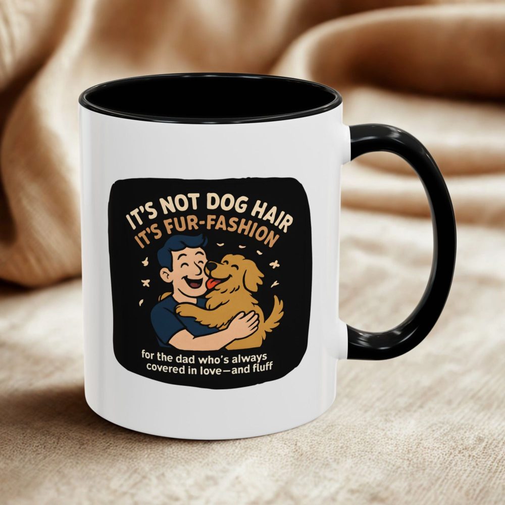 Funny dog dad mug with “Fur-Fashion” slogan. 11oz ceramic, microwave- and dishwasher-safe — a perfect UK gift for dog lovers.
