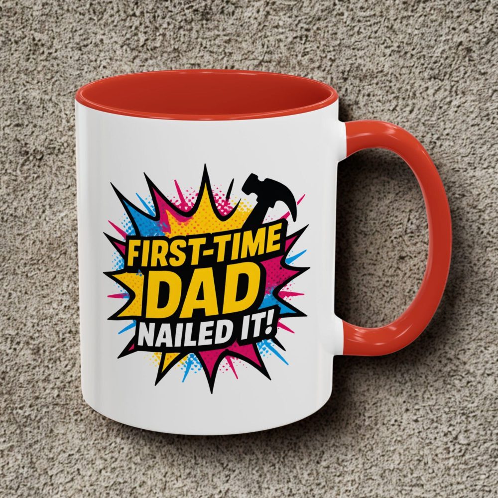 First Time Dad Gift Mug – a bold and funny way to celebrate new fatherhood! Featuring a vibrant comic-book style design with the phrase “First-Time Dad Nailed It!” alongside a hammer graphic, this mug is full of energy and humour.