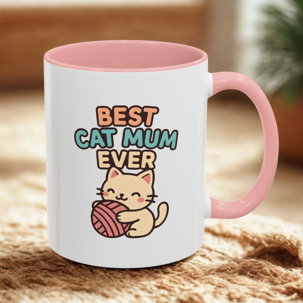 Funny Cat Mum Mug – the purrfect way to bring laughter and love to every coffee break. Featuring a playful cartoon kitty cuddling a ball of yarn with the words “Best Cat Mum Ever,” this mug is both adorable and humorous.