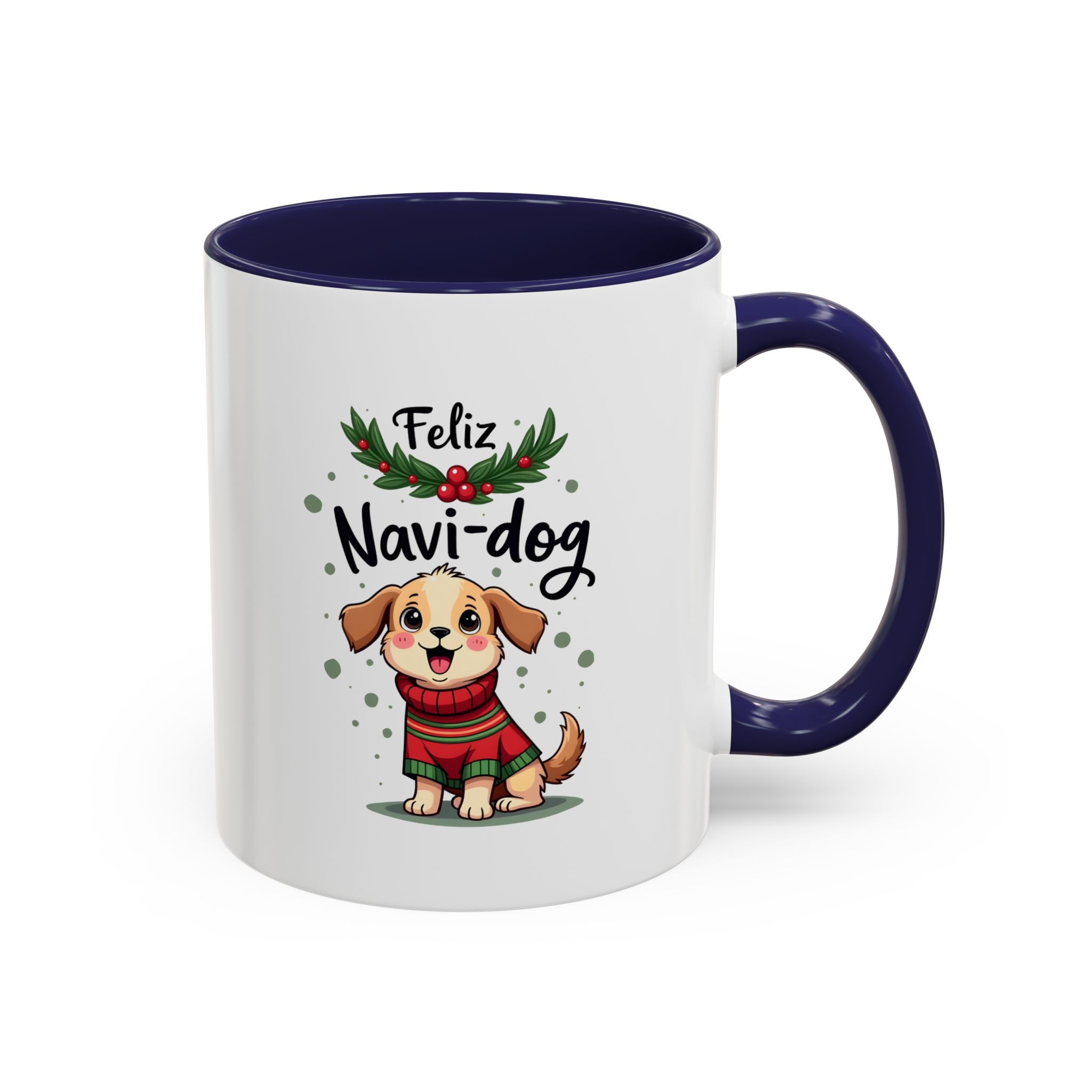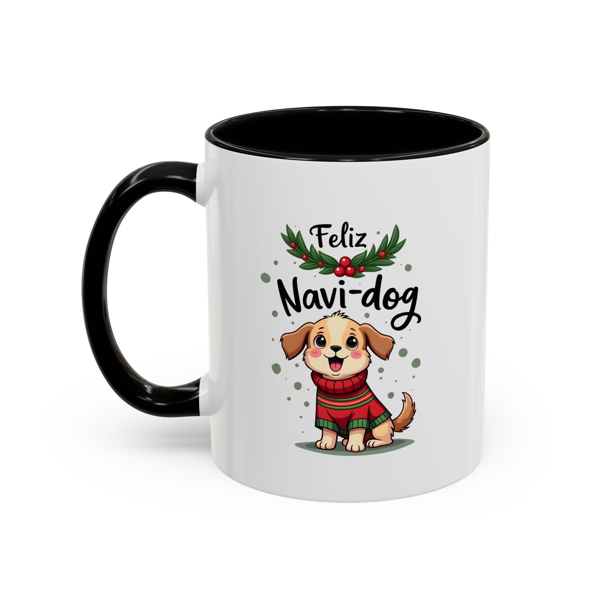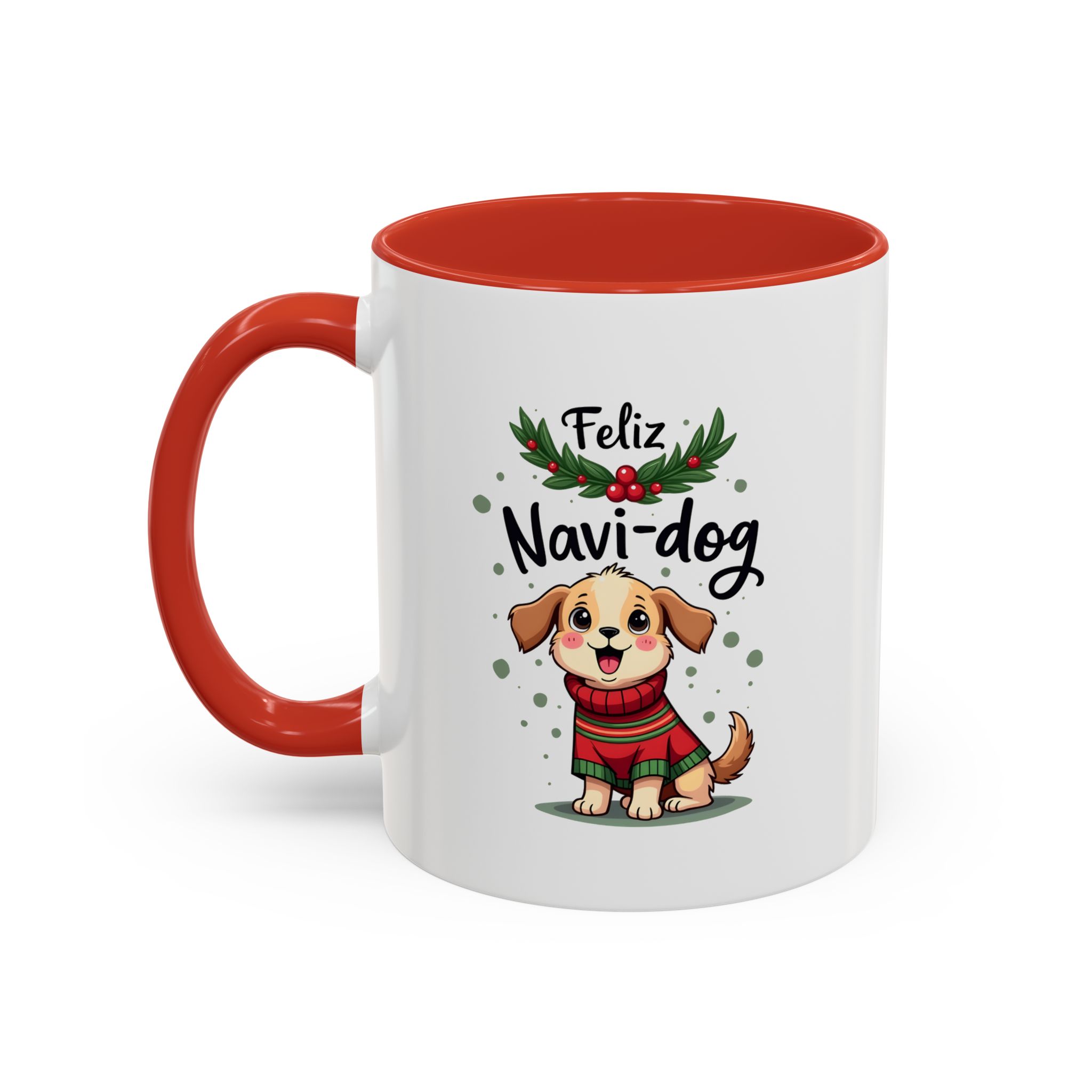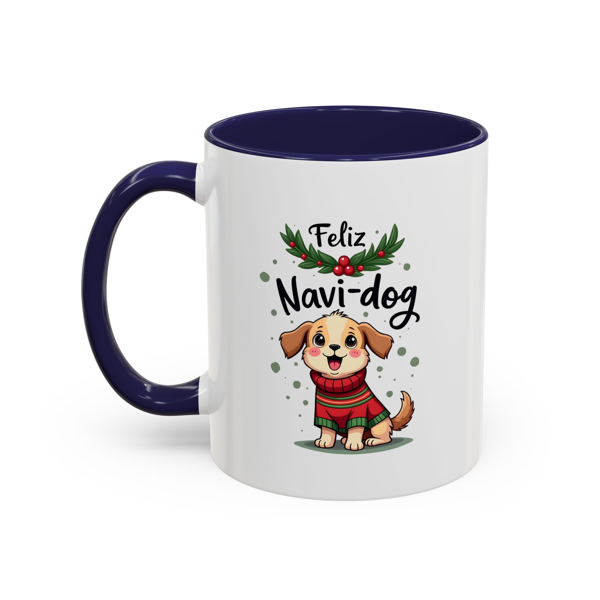 Celebrate the festive season with a wagging tail and lots of laughs thanks to this “Feliz Navi-dog” mug. Featuring a cute puppy in a cosy Christmas sweater surrounded by holly and festive dots, this design is part of our funny christmas dog mug collection.