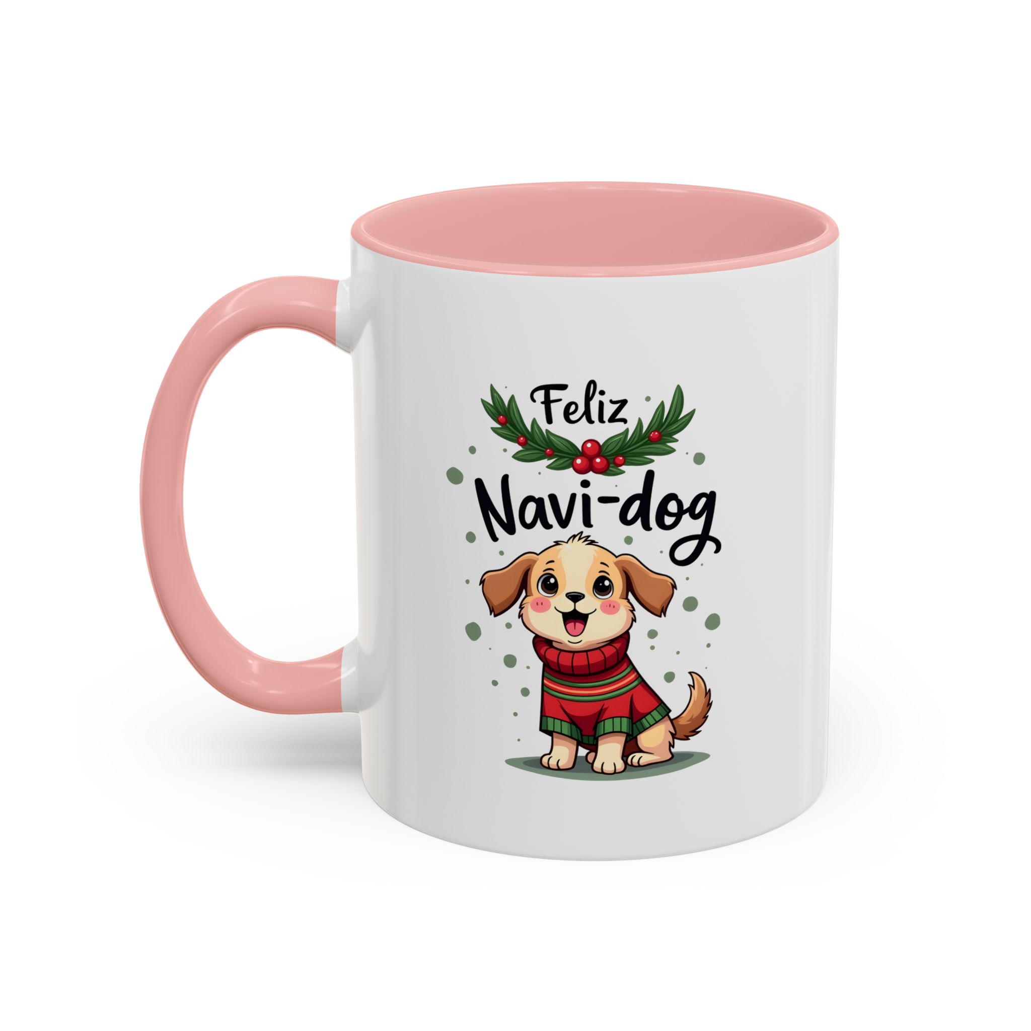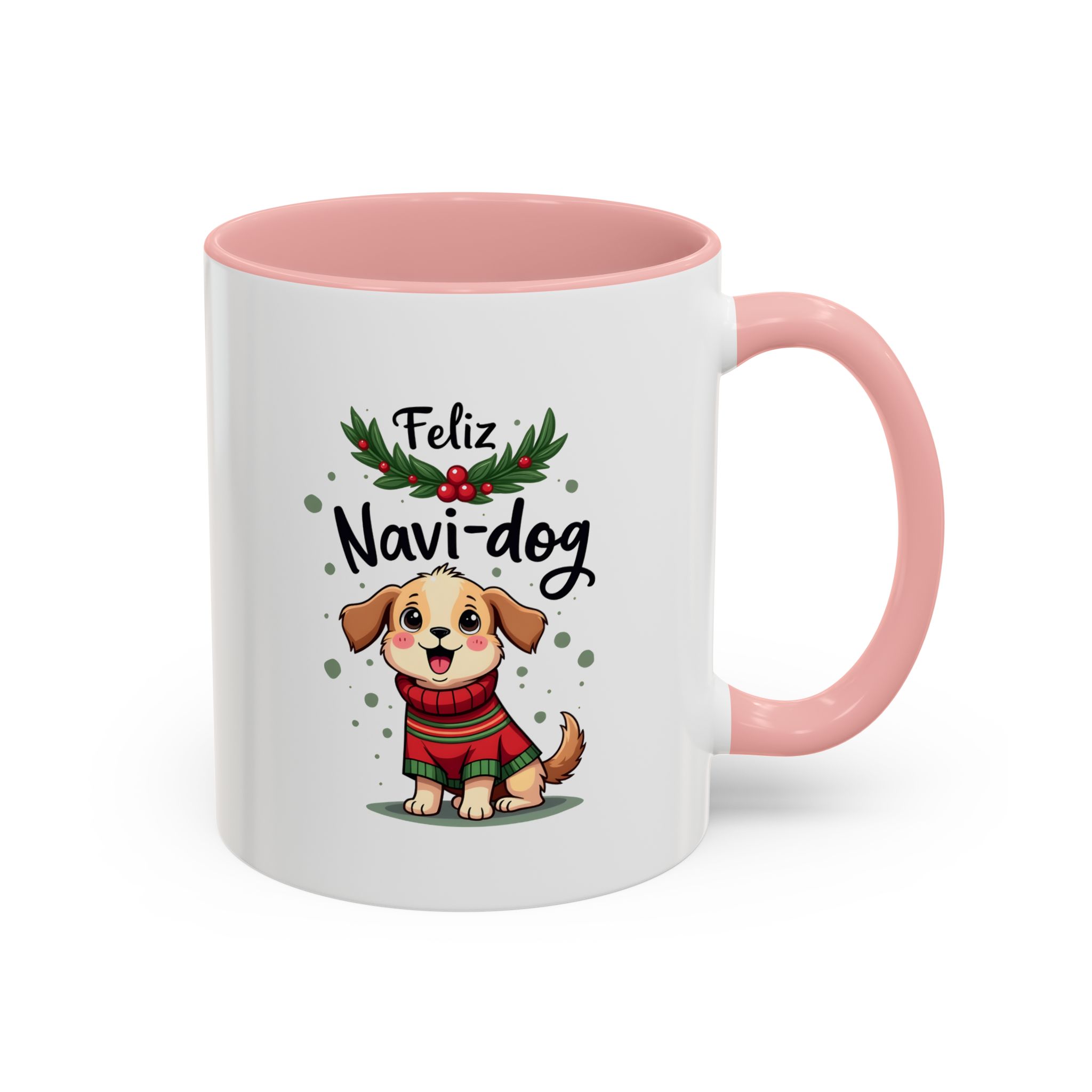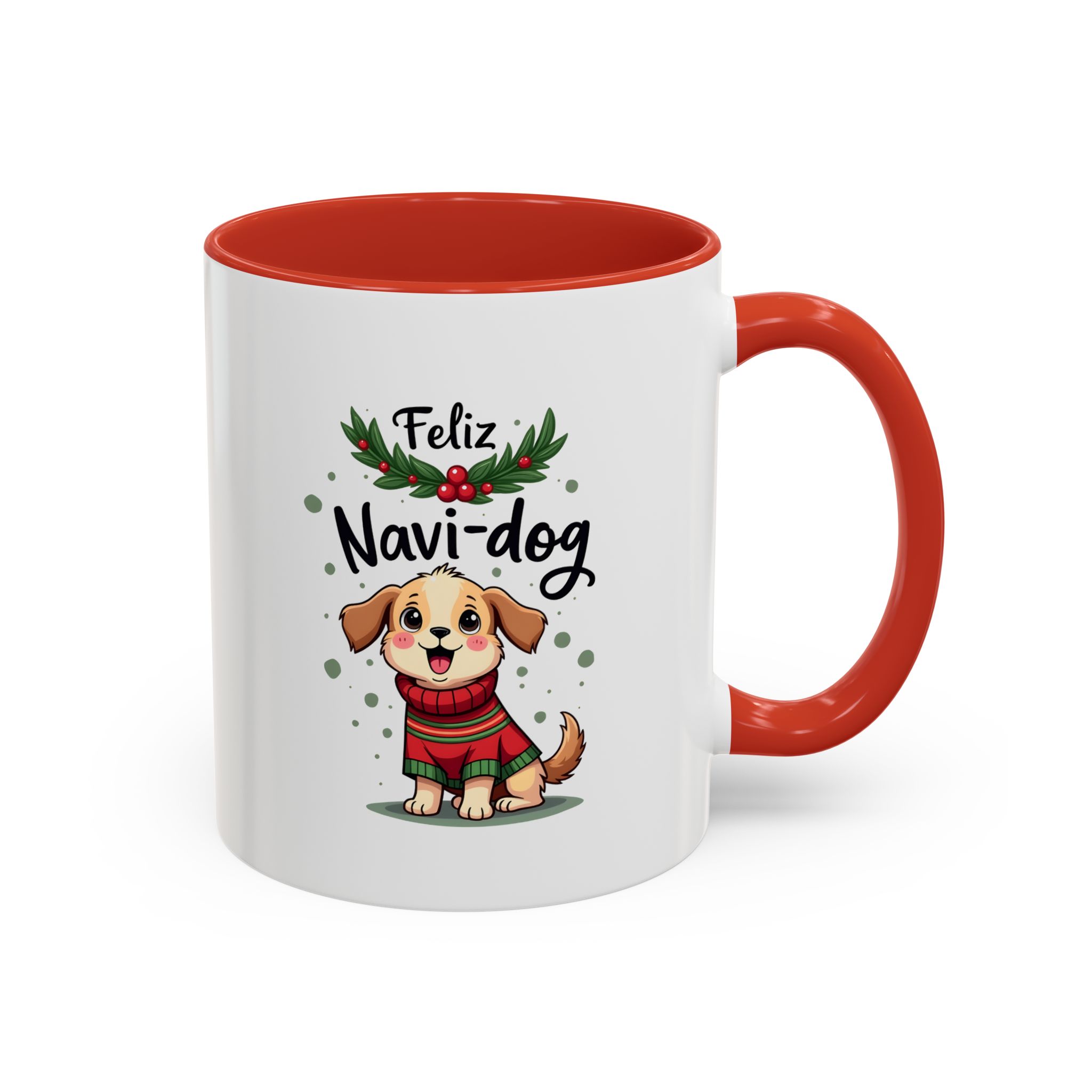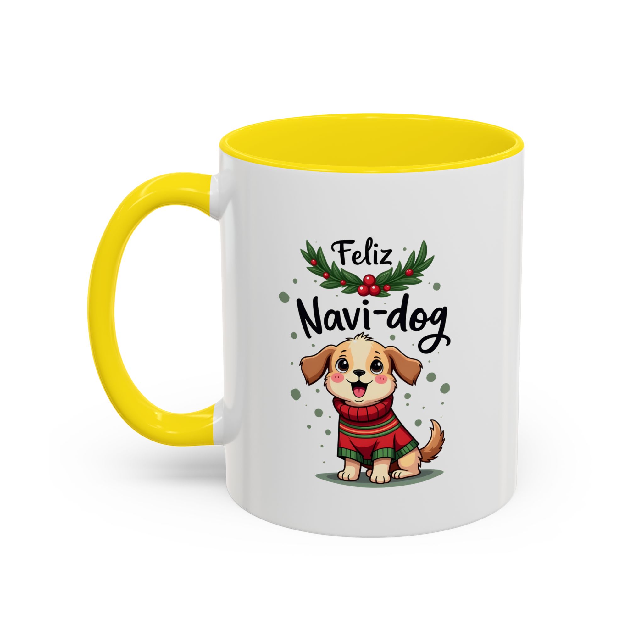 Celebrate the festive season with a wagging tail and lots of laughs thanks to this “Feliz Navi-dog” mug. Featuring a cute puppy in a cosy Christmas sweater surrounded by holly and festive dots, this design is part of our funny christmas dog mug collection.