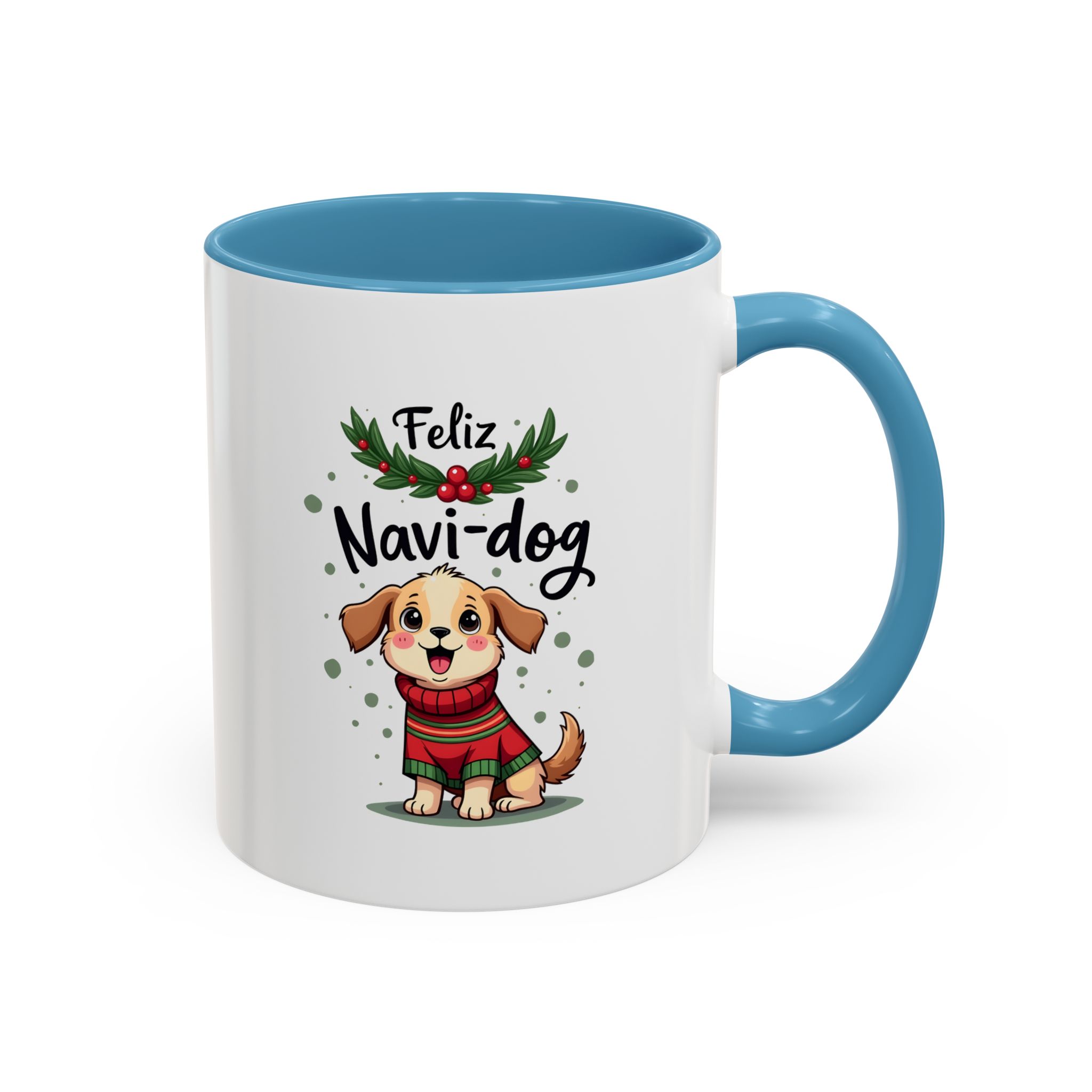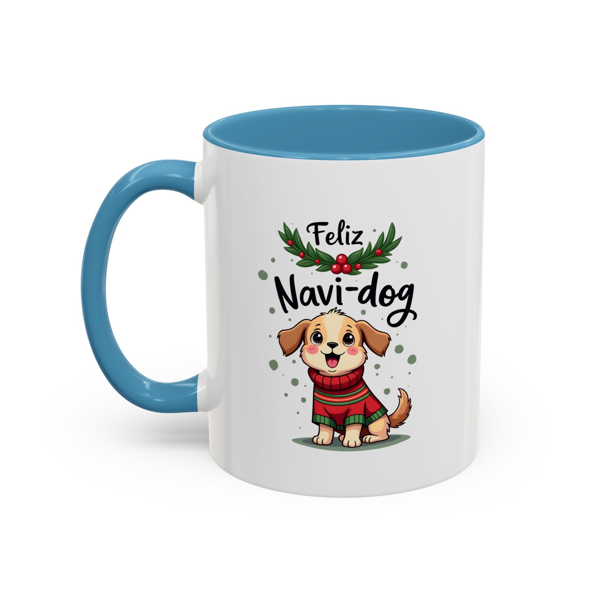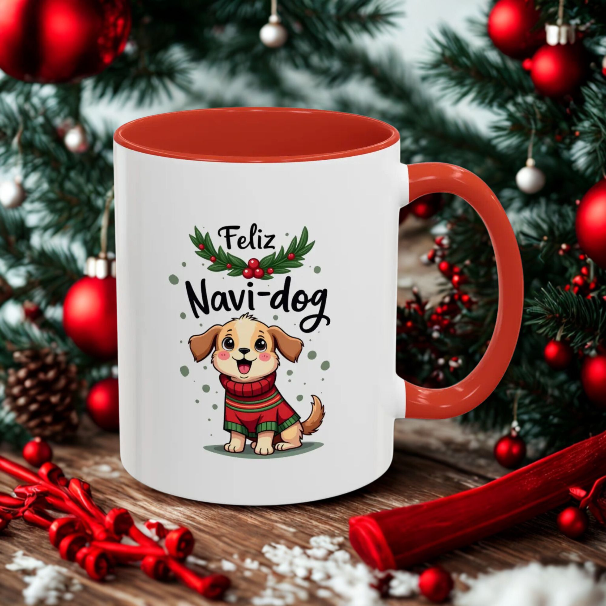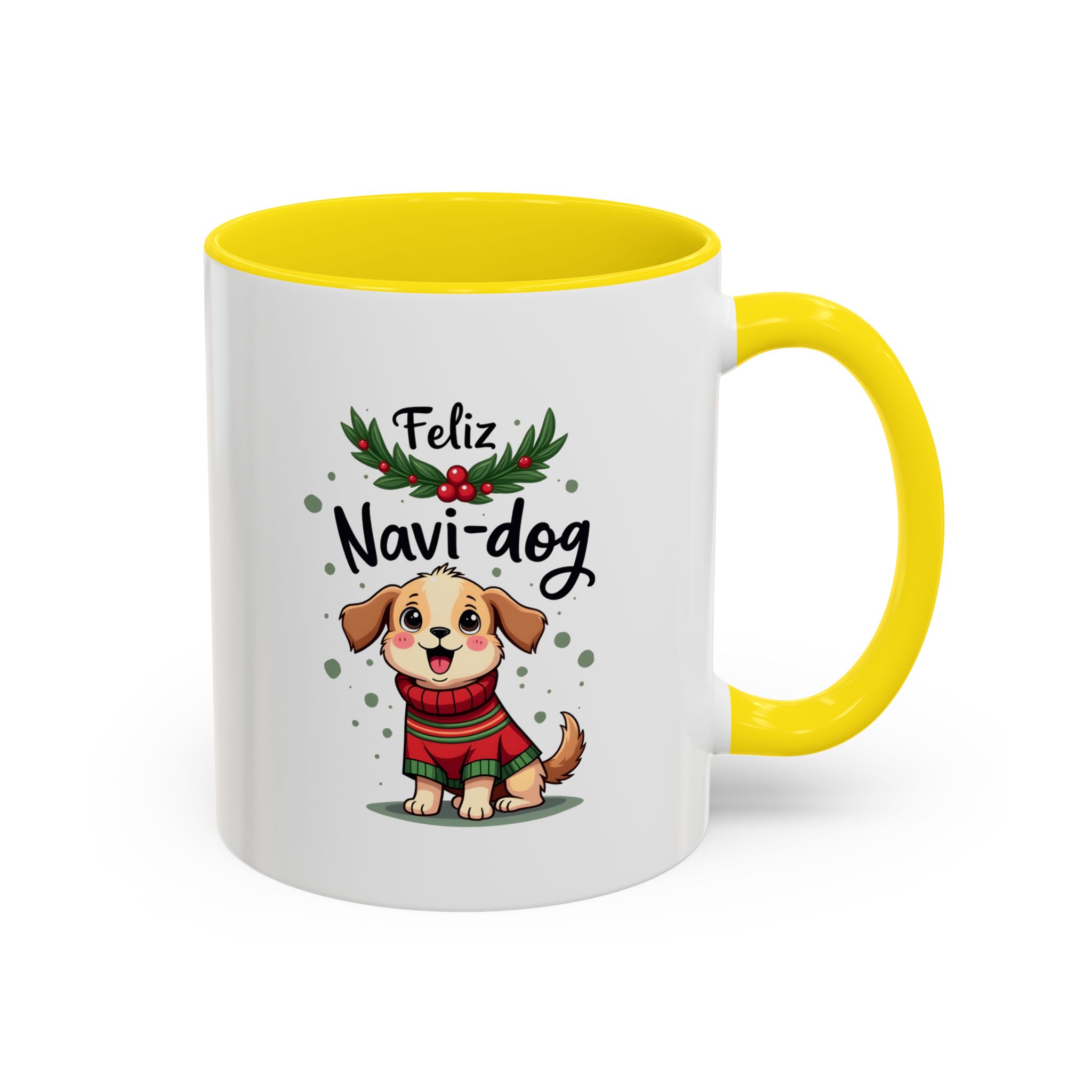 Celebrate the festive season with a wagging tail and lots of laughs thanks to this “Feliz Navi-dog” mug. Featuring a cute puppy in a cosy Christmas sweater surrounded by holly and festive dots, this design is part of our funny christmas dog mug collection.