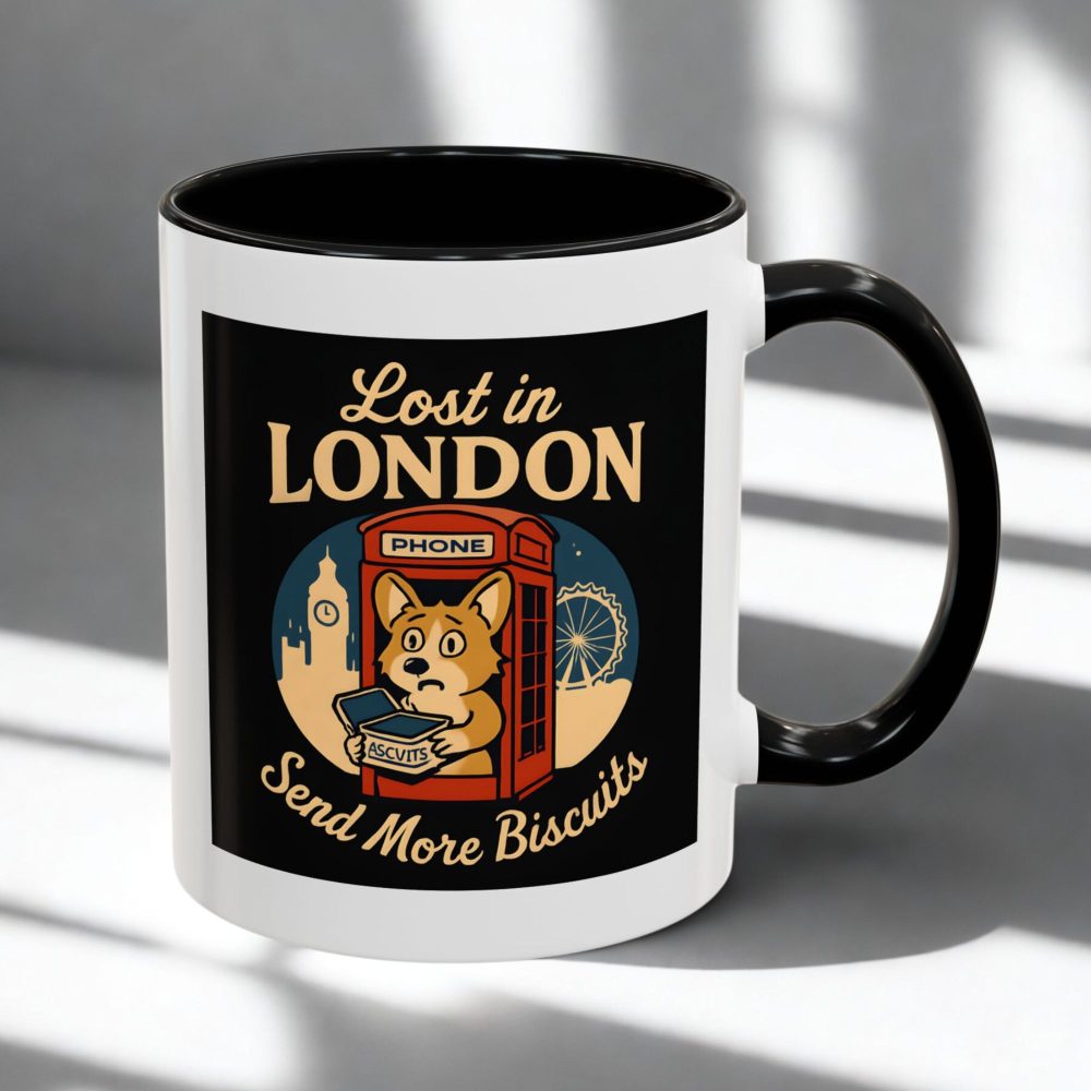 This funny corgi London mug features a pup in a red phone booth and the line “Lost in London – Send More Biscuits.” Perfect for dog lovers and UK fans.