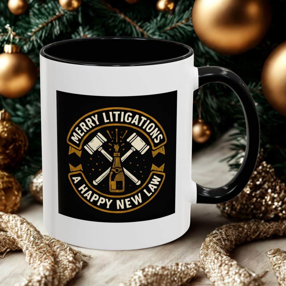 Celebrate the season with this Funny Lawyer Christmas Mug featuring “Merry Litigations & A Happy New Law.” The perfect holiday gift for lawyers and legal pros.
