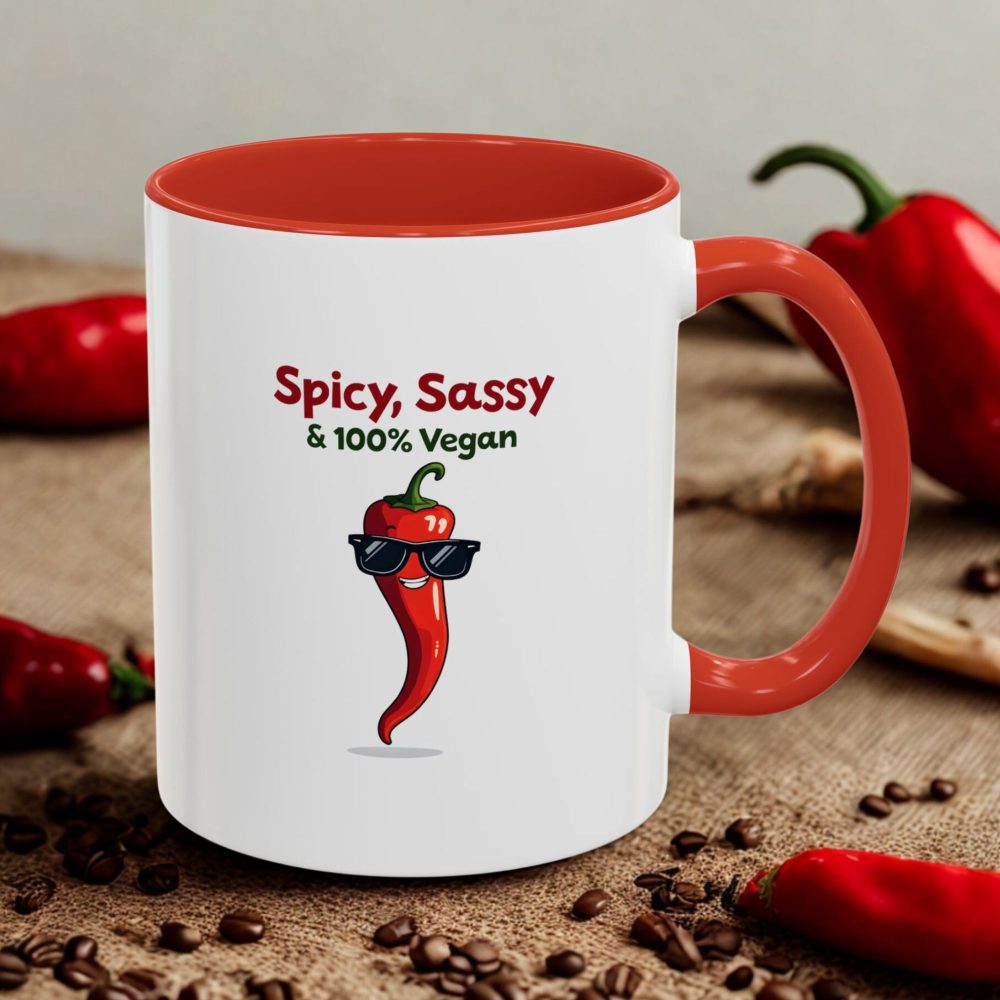 “Spicy, Sassy & 100% Vegan” with a chill chili pepper in shades — a funny vegan mug with hot personality.