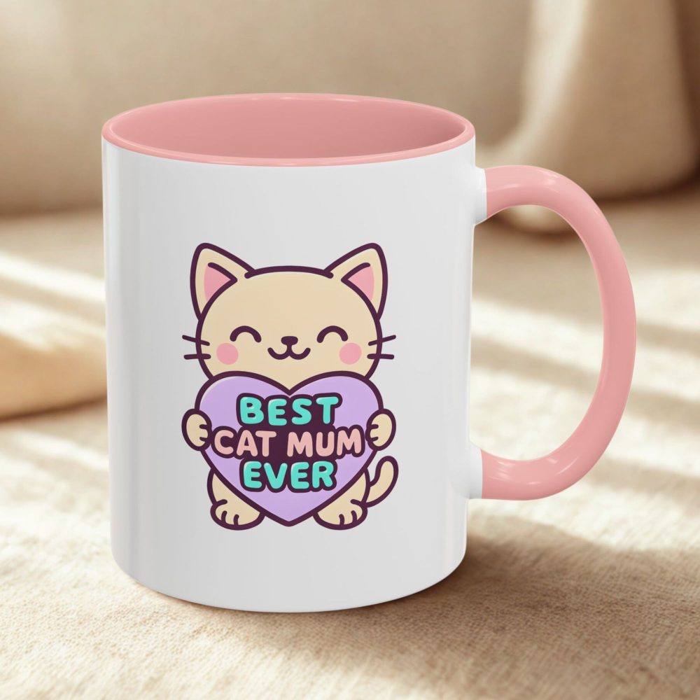 Kawaii Cat Mum Mug UK – 11oz ceramic, dishwasher & microwave safe, available in 9 accent colours. A cute and colourful gift for cat mums.