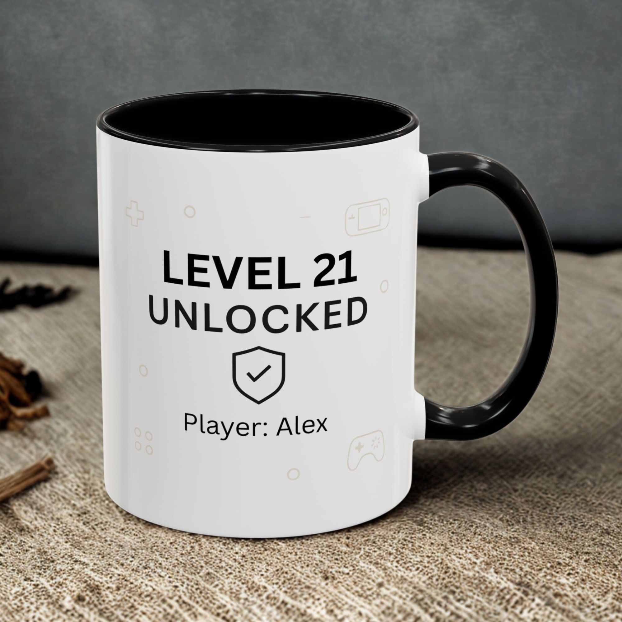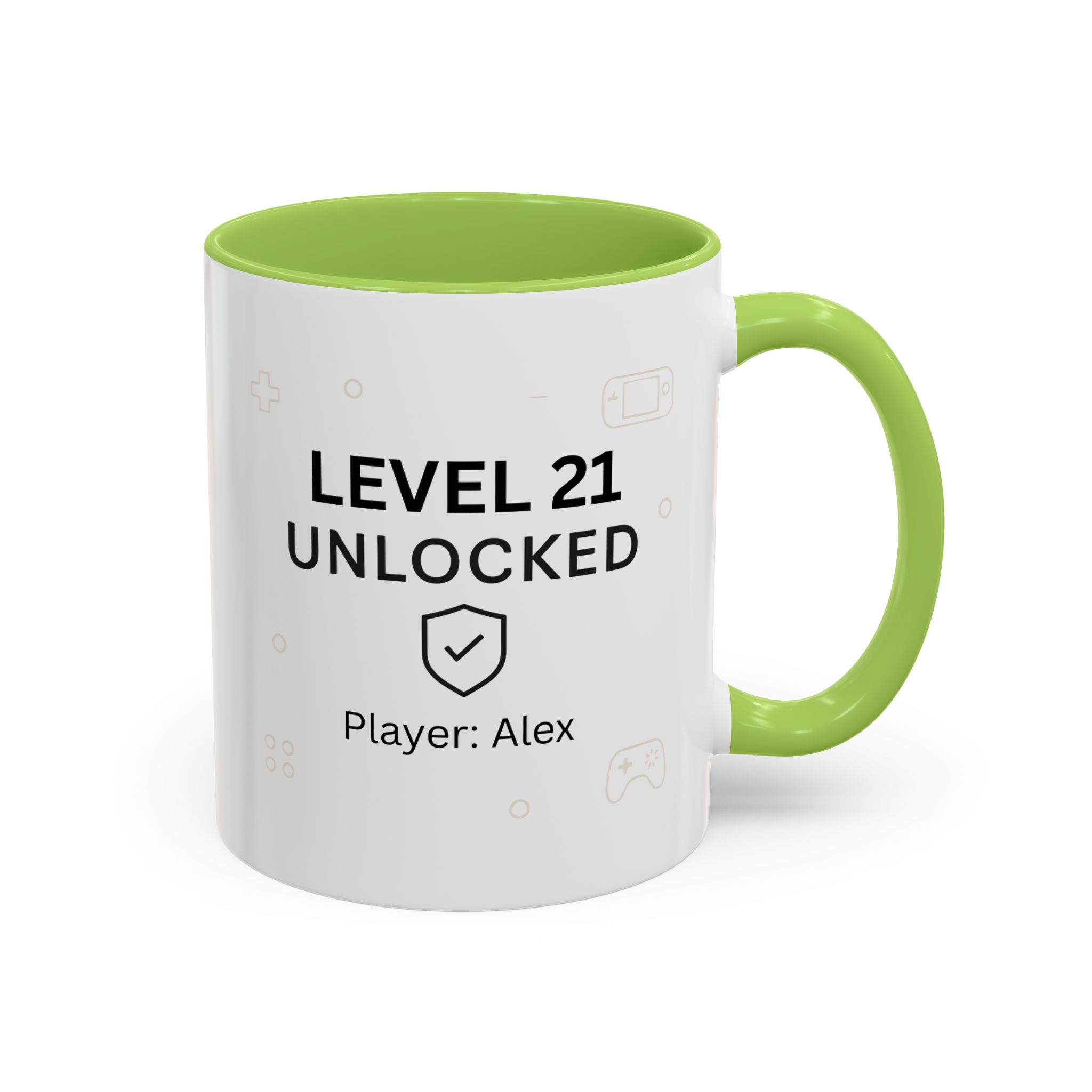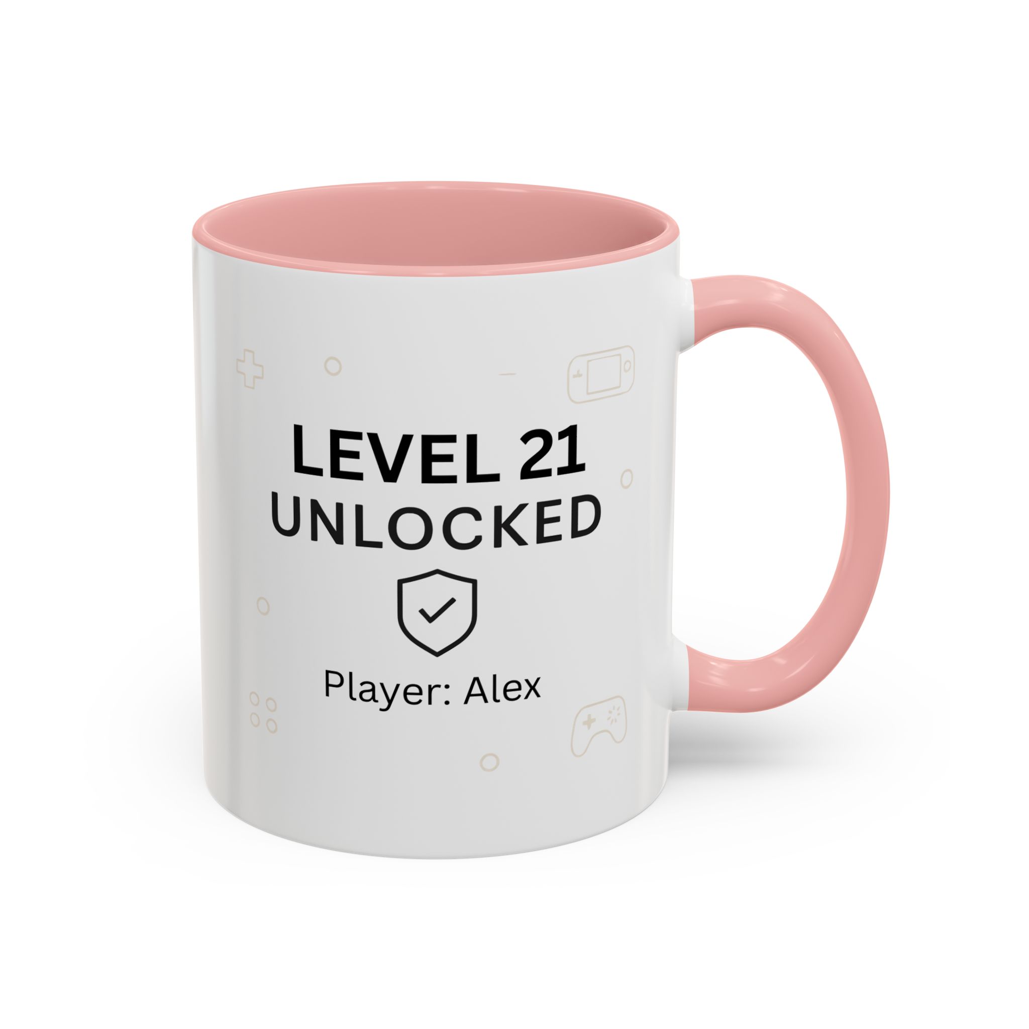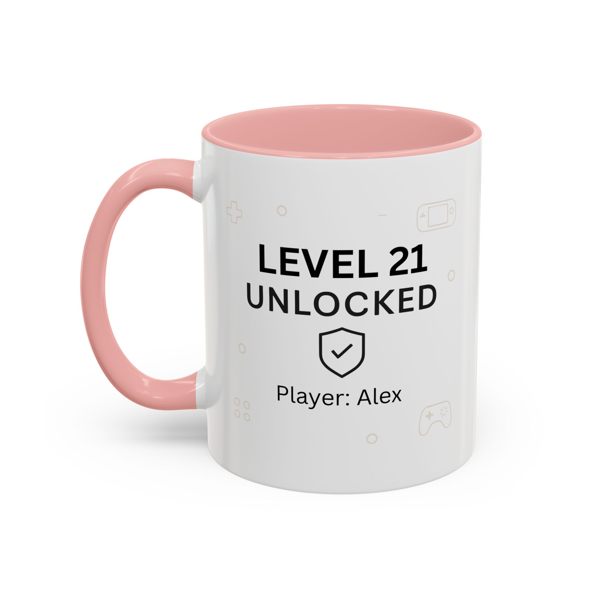 A personalised level 21 unlocked birthday mug featuring a custom player name. Dishwasher safe and perfect for celebrating a 21st birthday.