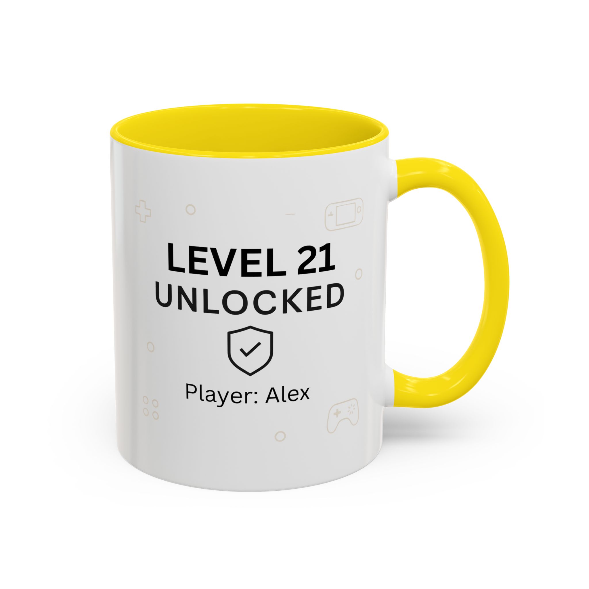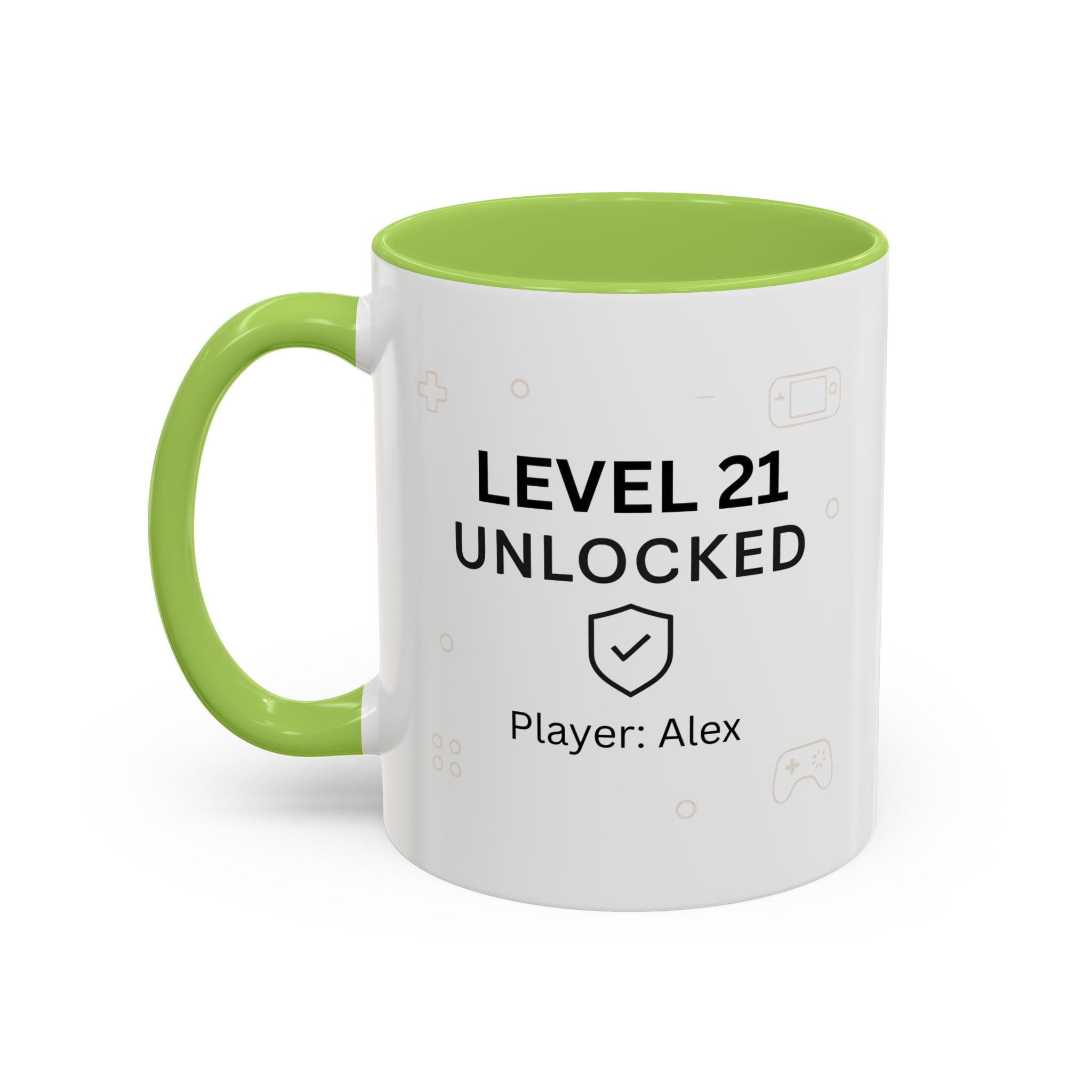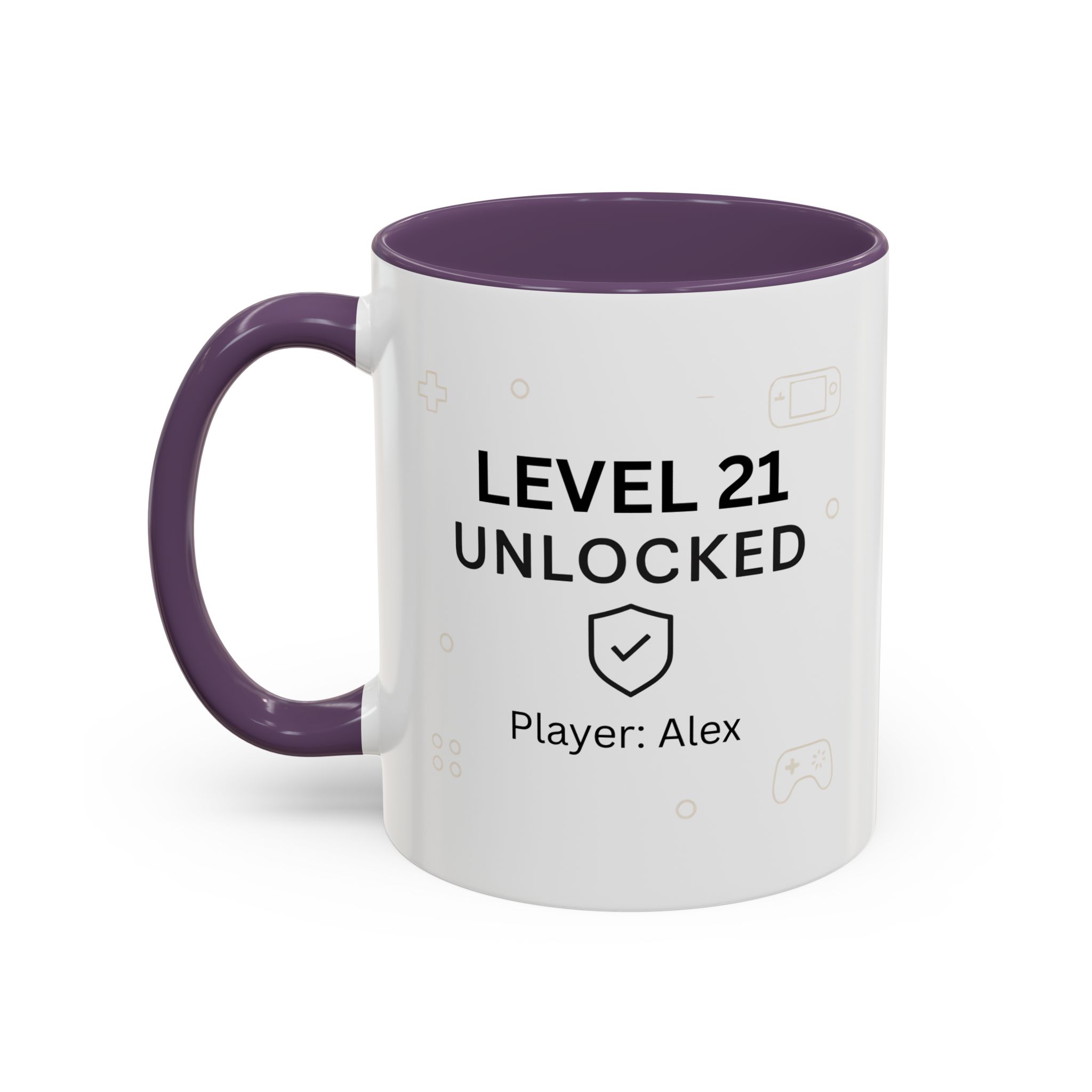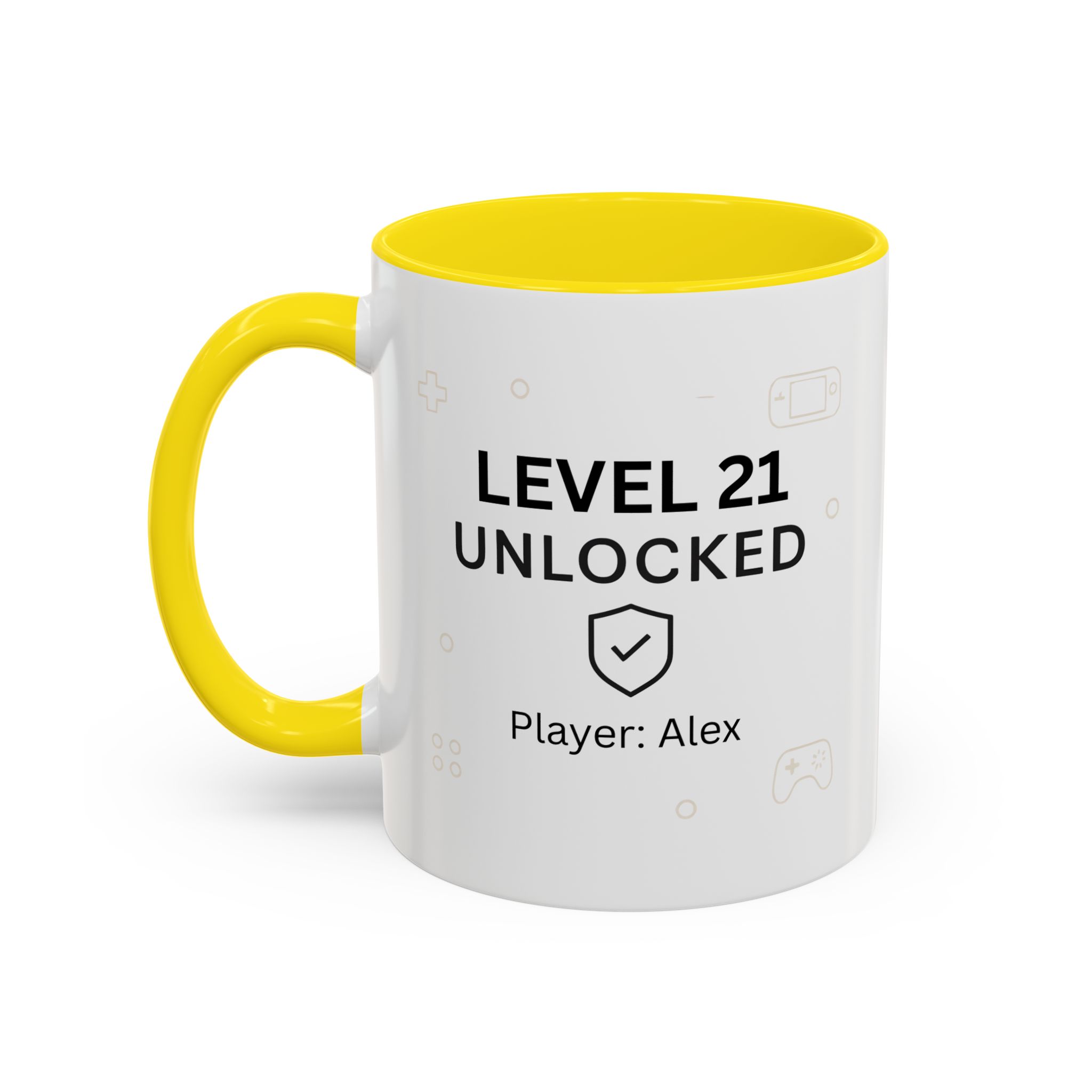 A personalised level 21 unlocked birthday mug featuring a custom player name. Dishwasher safe and perfect for celebrating a 21st birthday.