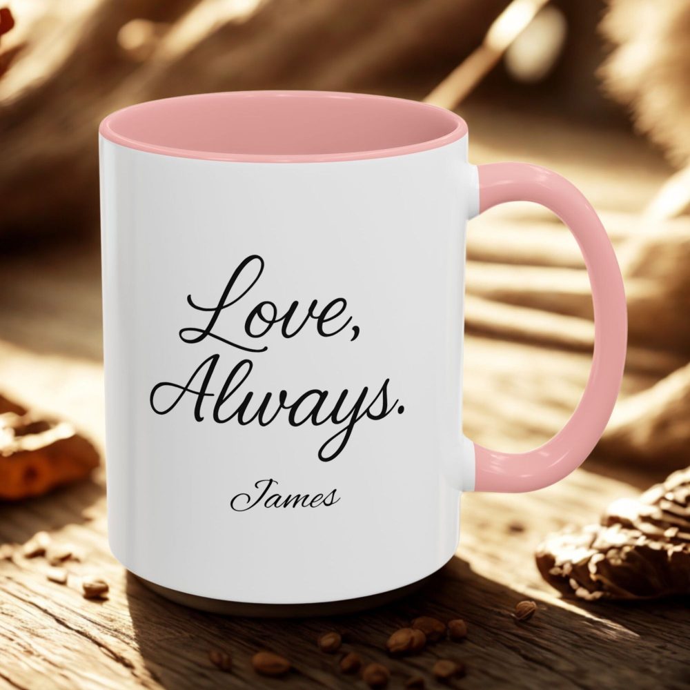 Share a timeless message with this personalised love always script mug. Elegant script design with custom name, 11oz ceramic, dishwasher and microwave safe — perfect for romantic gifting.