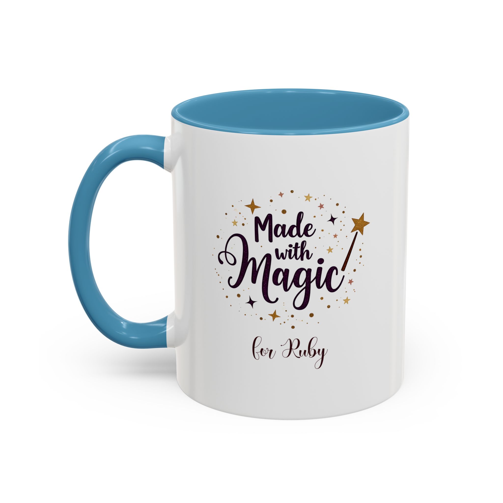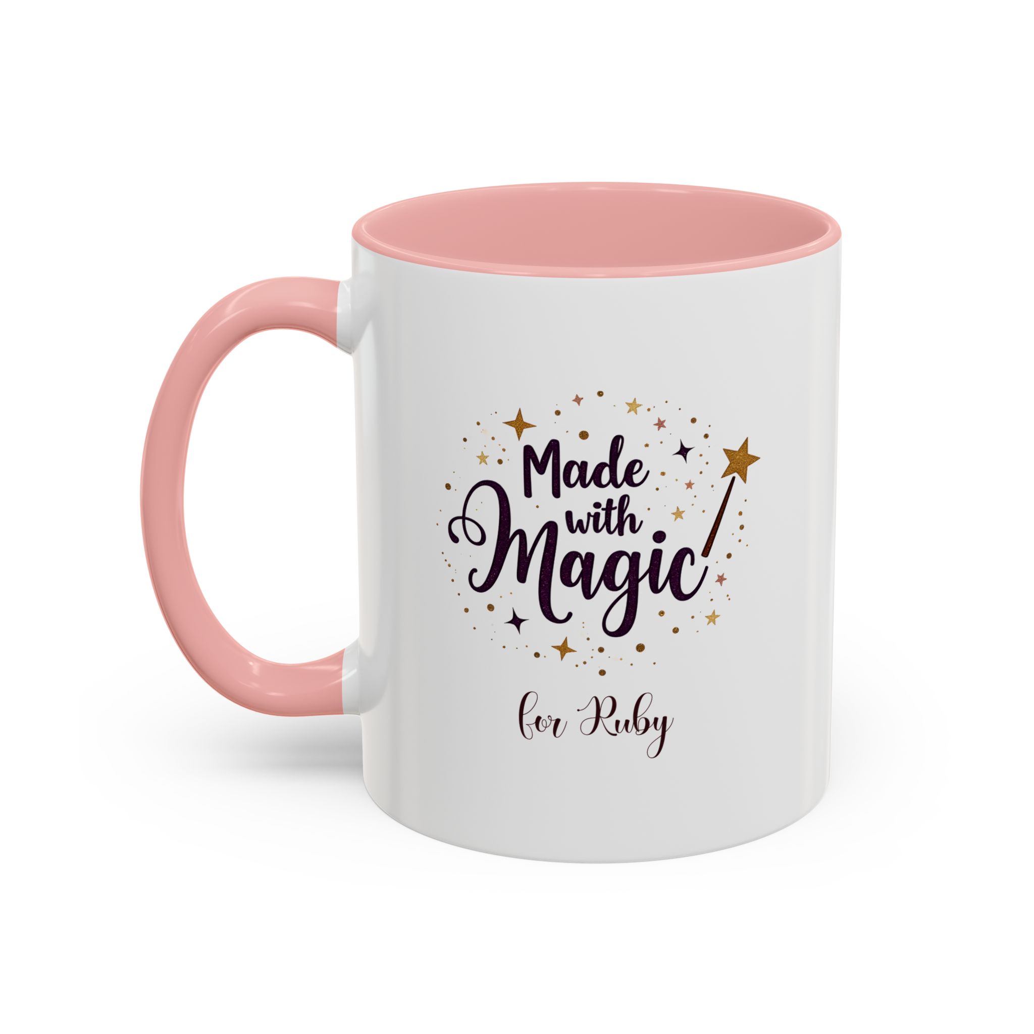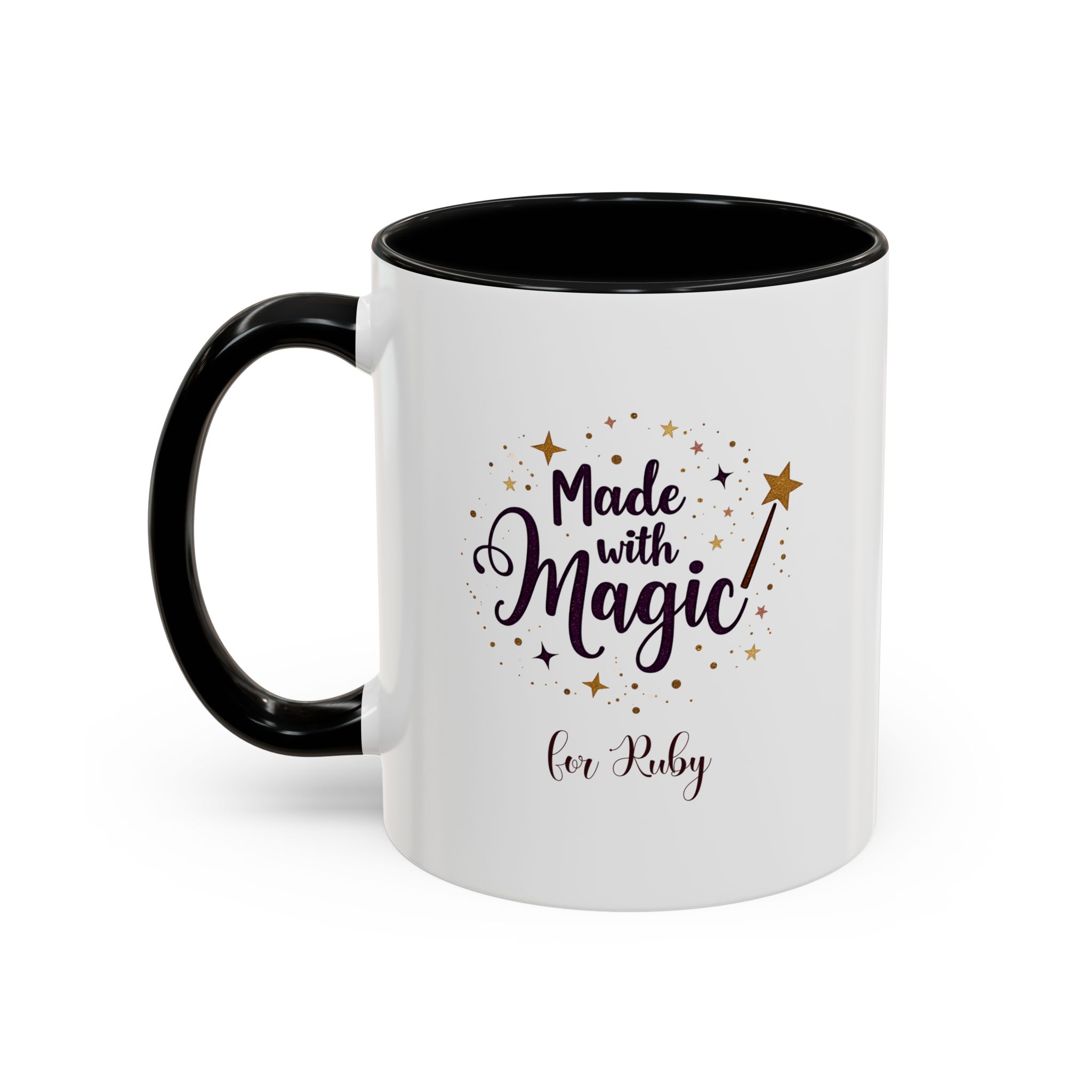 Bring enchantment to the holiday season with this personalised “Made with Magic” Christmas mug. Featuring elegant script surrounded by sparkling stars and a magic wand, along with a customisable name below, this design is part of our magic christmas mug collection.