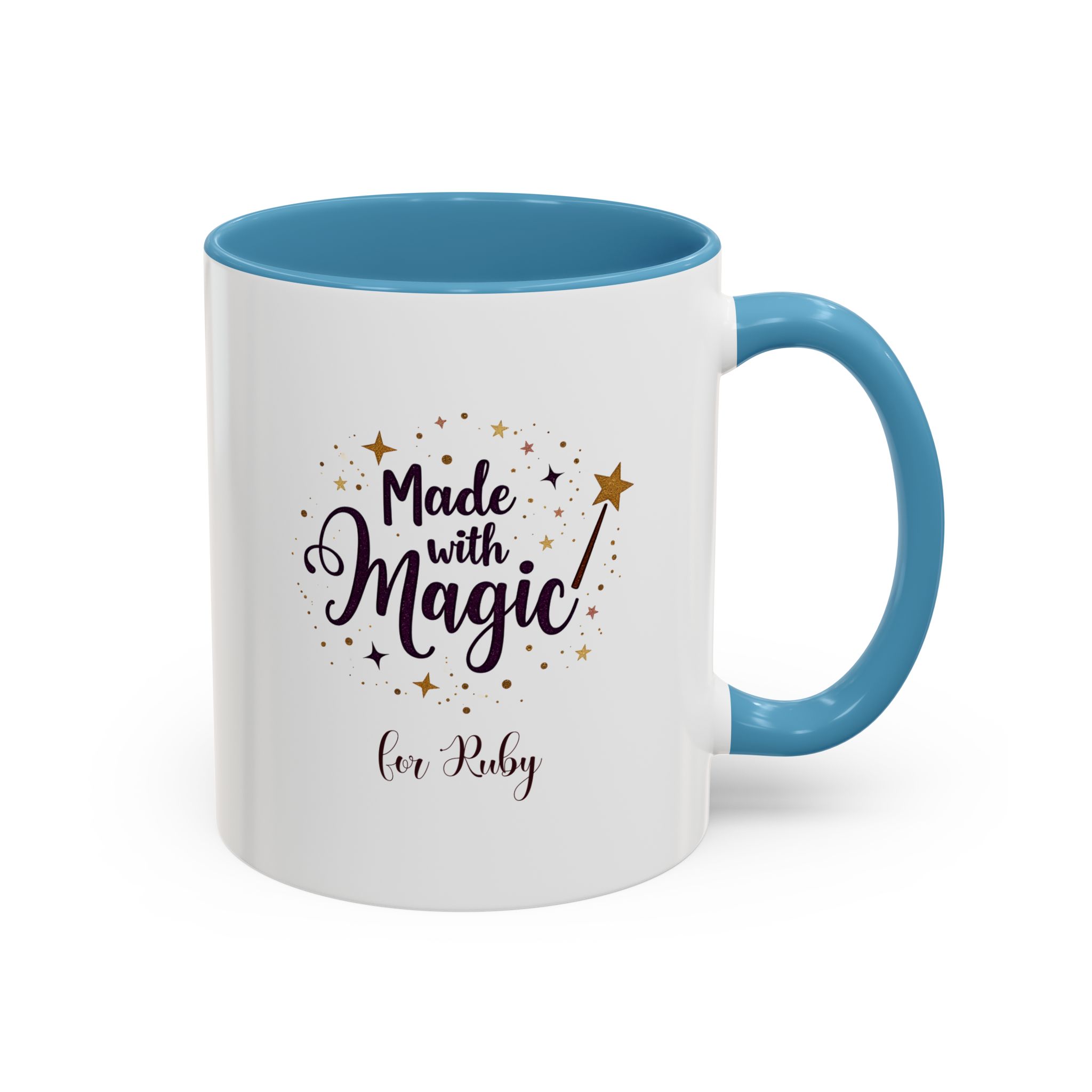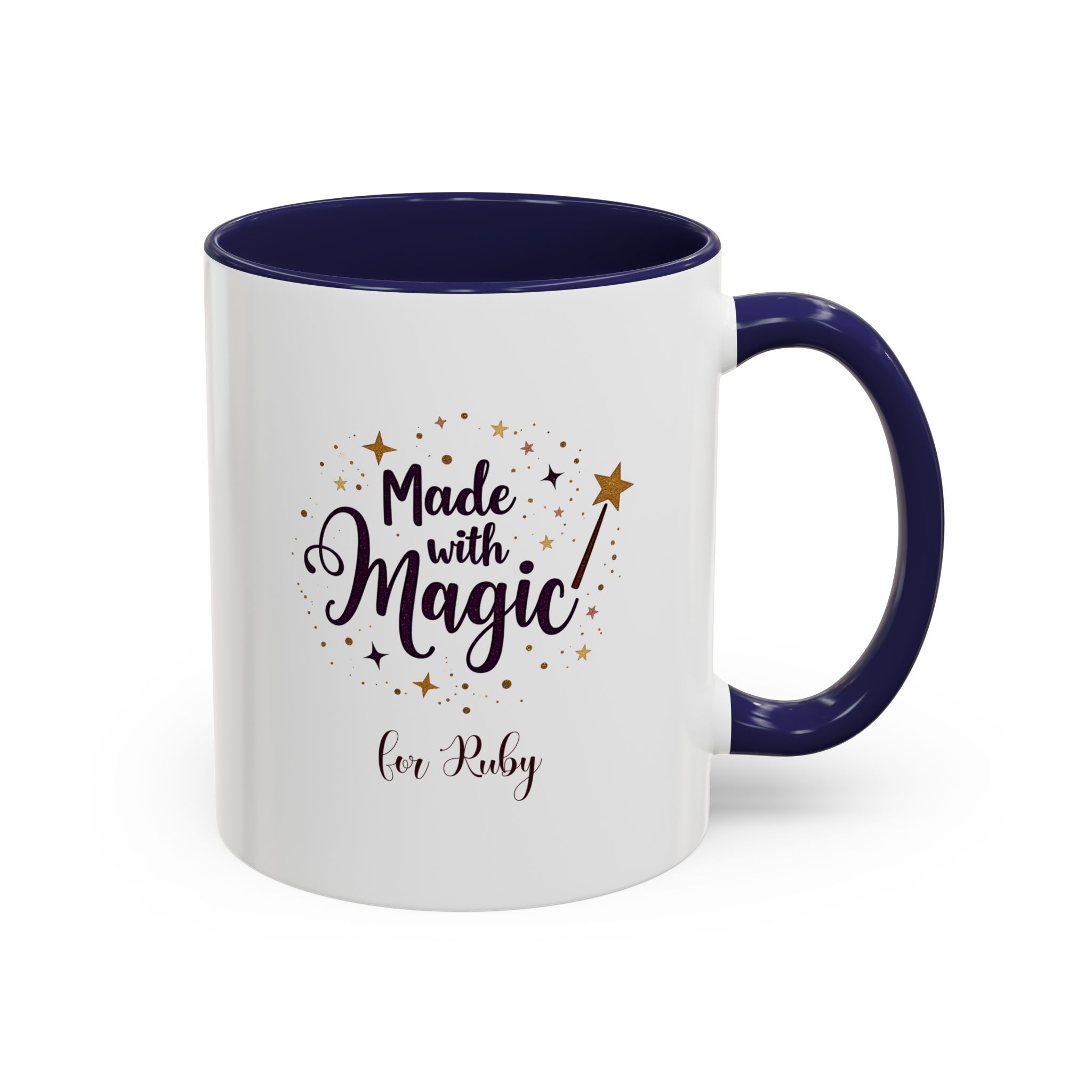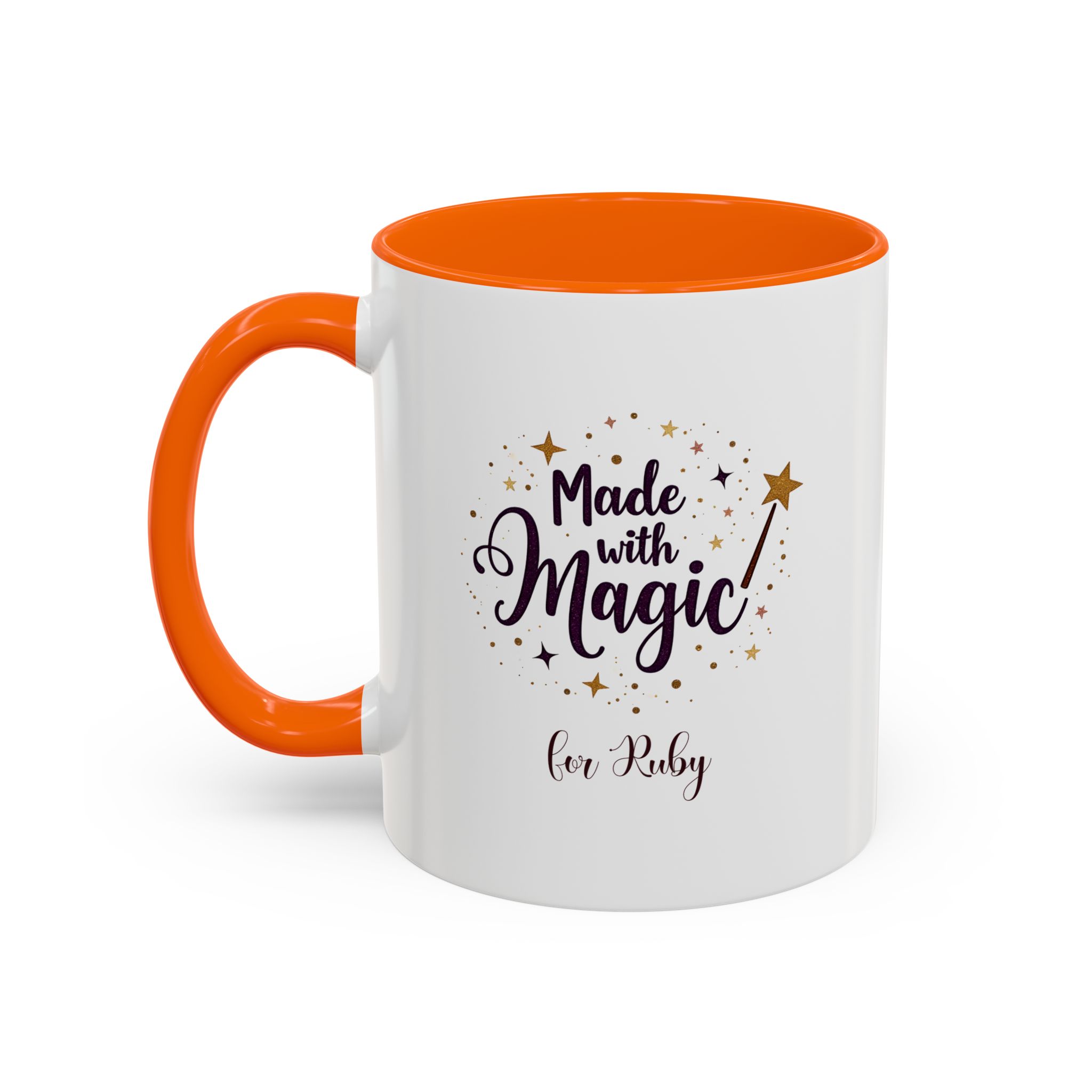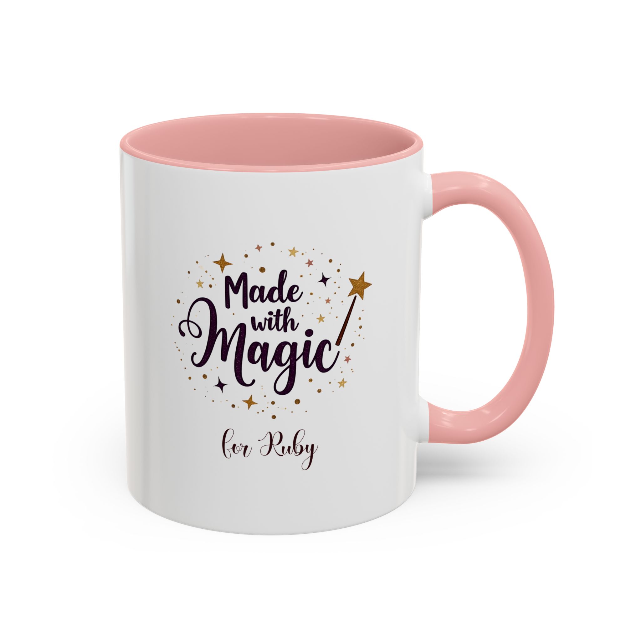 Bring enchantment to the holiday season with this personalised “Made with Magic” Christmas mug. Featuring elegant script surrounded by sparkling stars and a magic wand, along with a customisable name below, this design is part of our magic christmas mug collection.