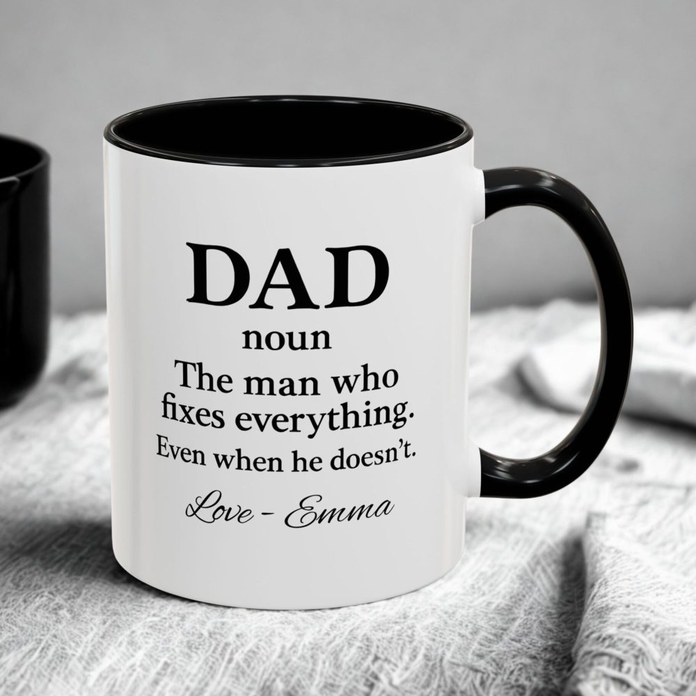 This personalised dad definition mug is a funny and heartfelt gift that perfectly sums up what dads do best. Featuring the definition-style quote “Dad – the man who fixes everything, even when he doesn’t”, this mug can be personalised with a name to make it truly special.