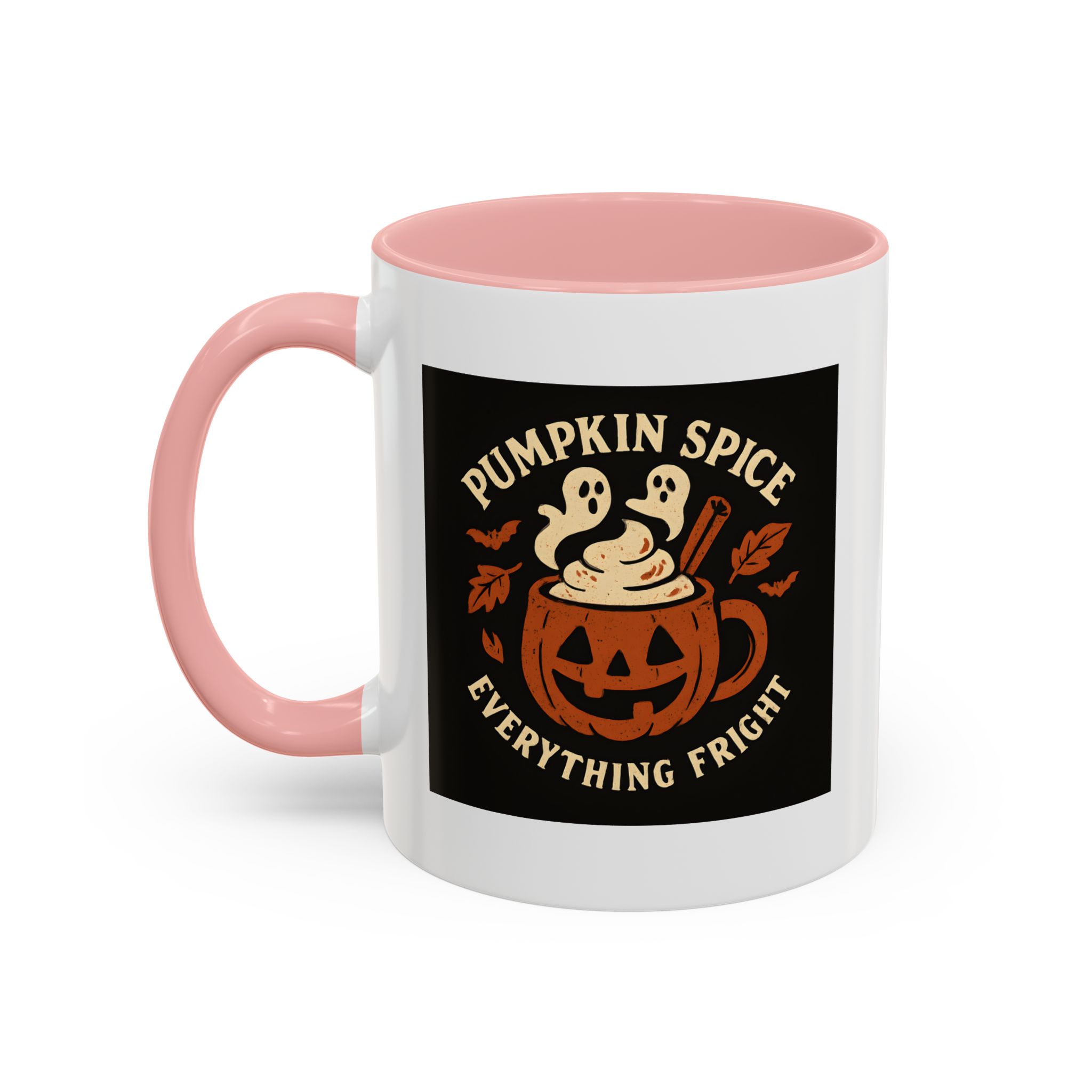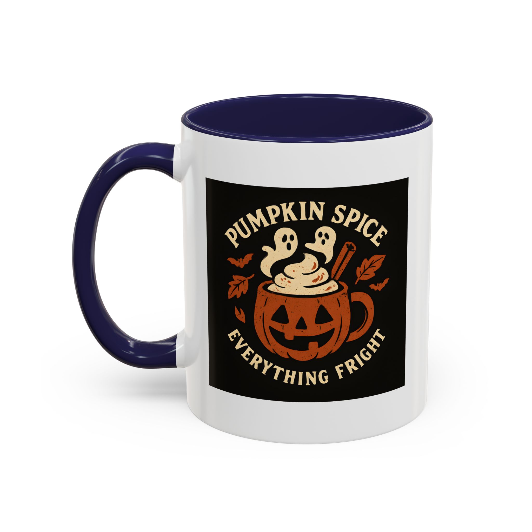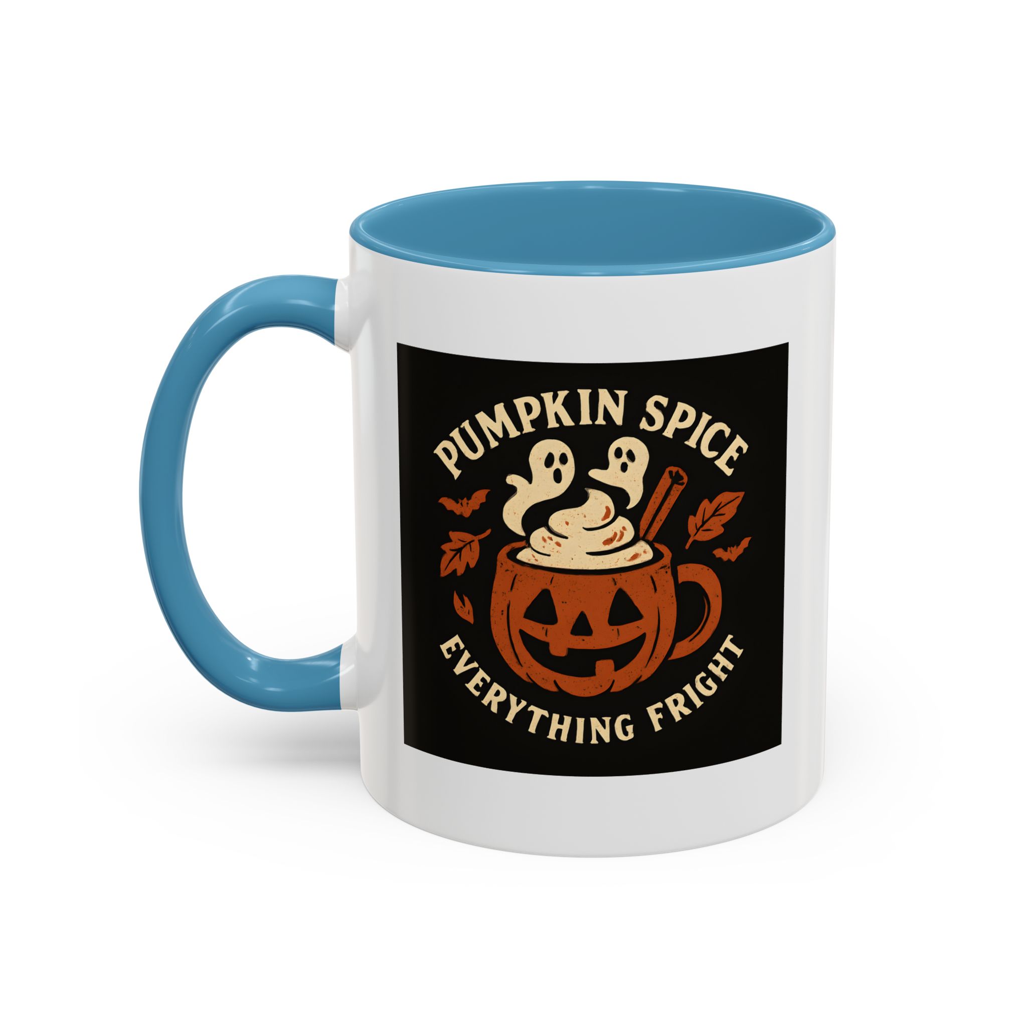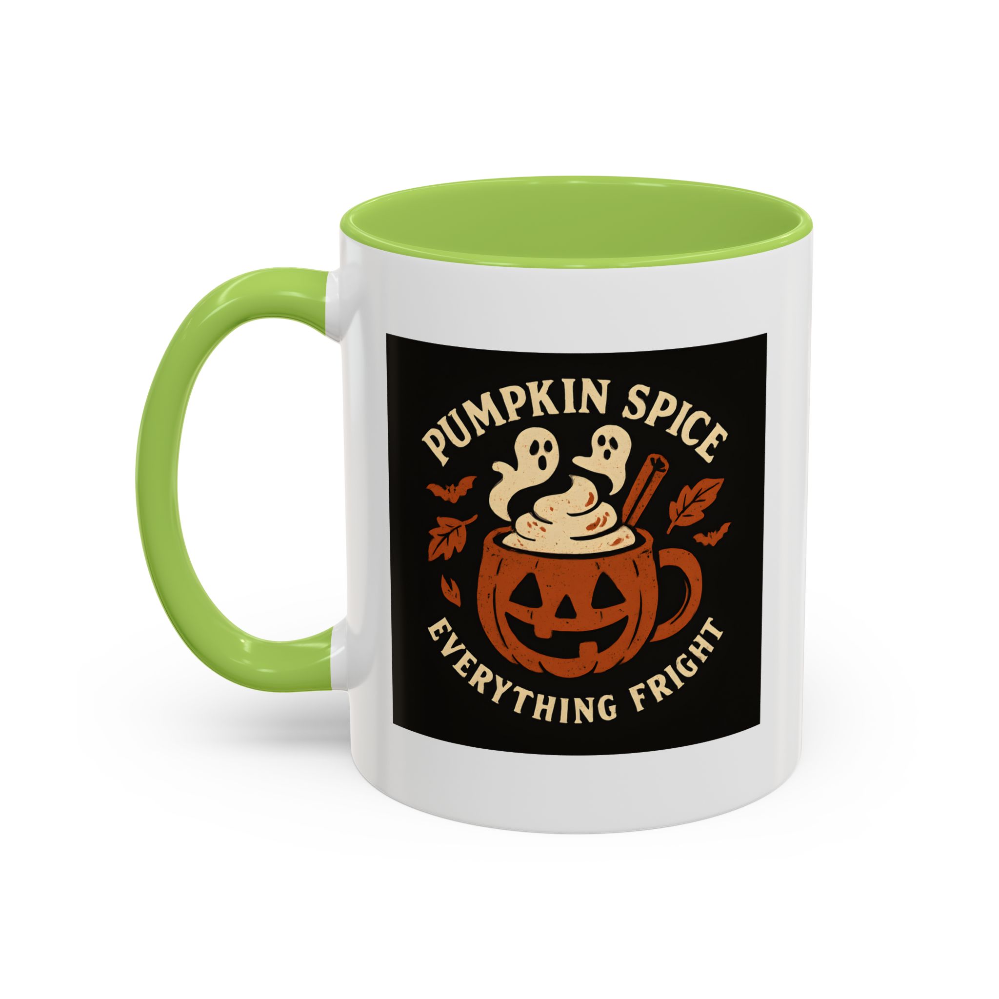 Pumpkin Spice Halloween Mug with ghostly latte art and jack-o’-lantern design. A funny, spooky coffee cup perfect for Halloween and pumpkin spice lovers.