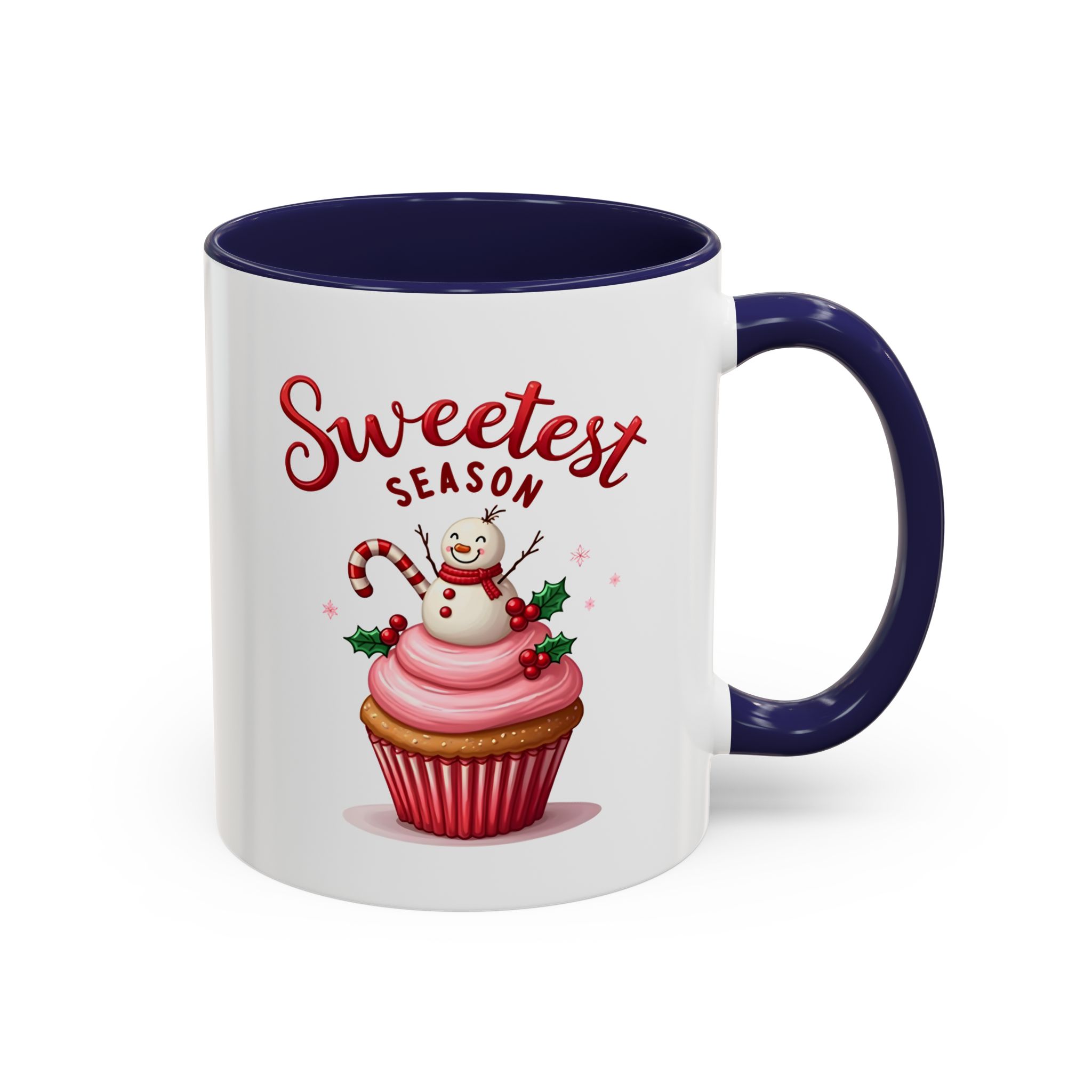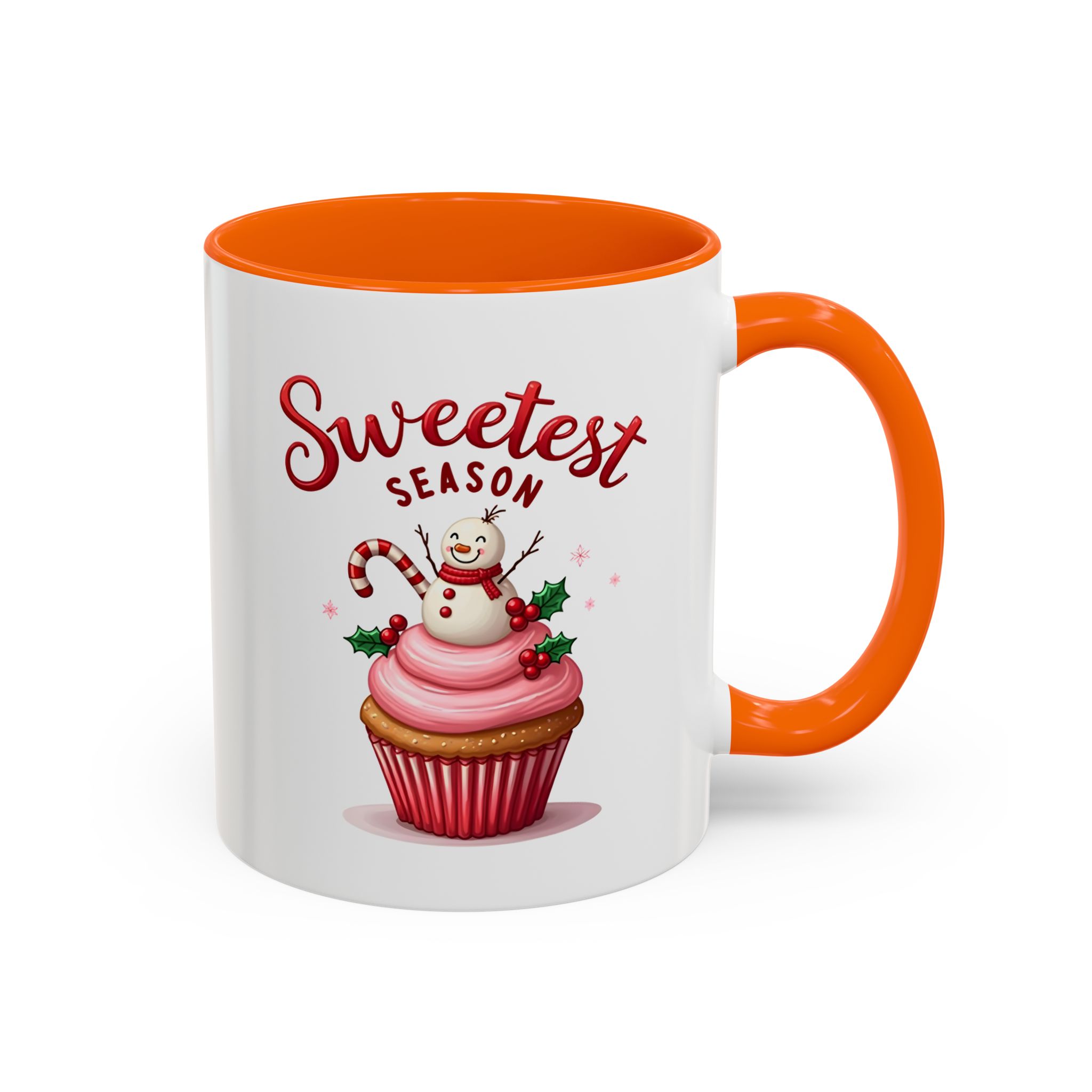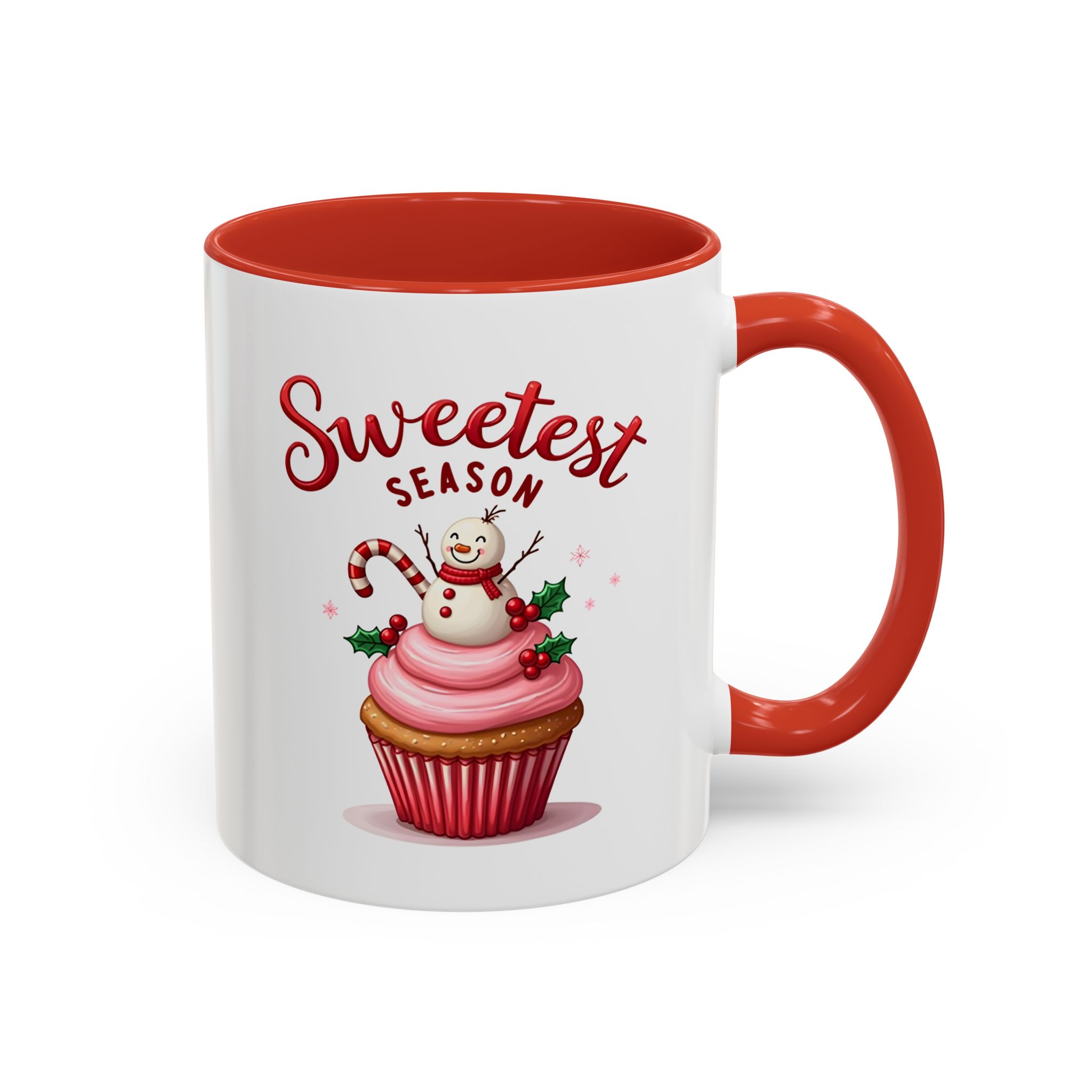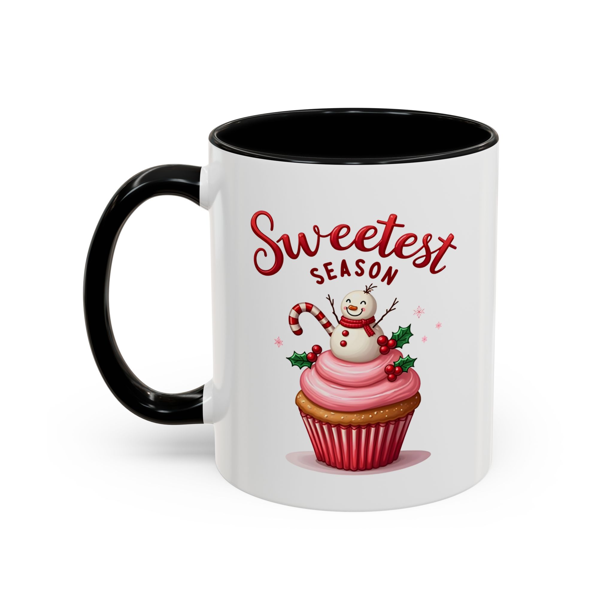 Sweet season christmas mug with “Sweetest Season” cupcake snowman design. 11oz ceramic, dishwasher/microwave safe, available in 9 accent colors.