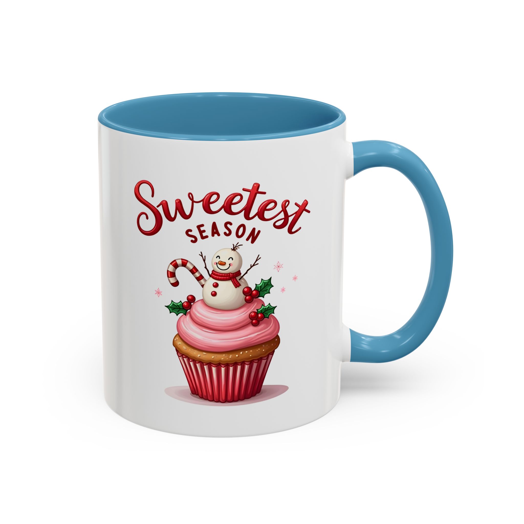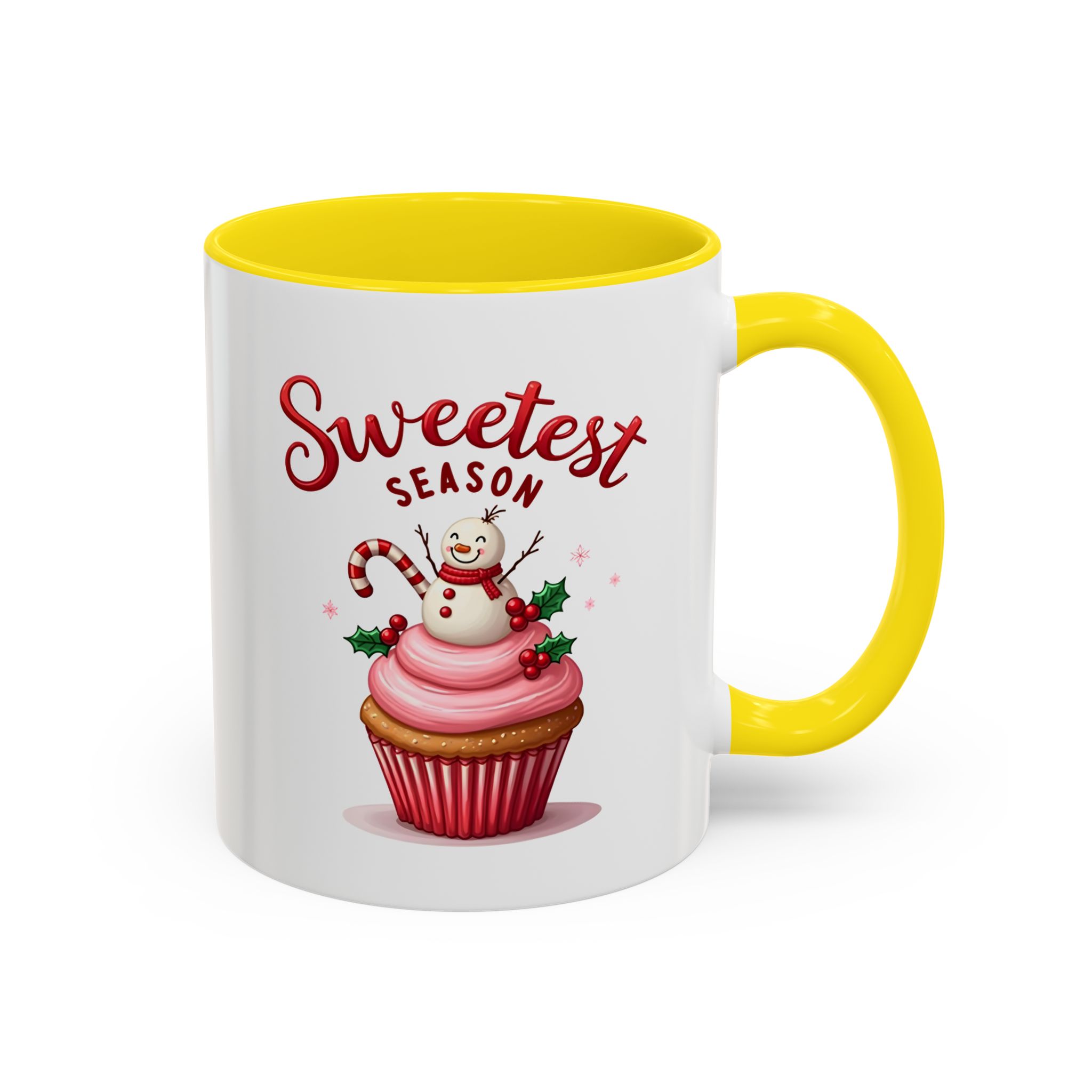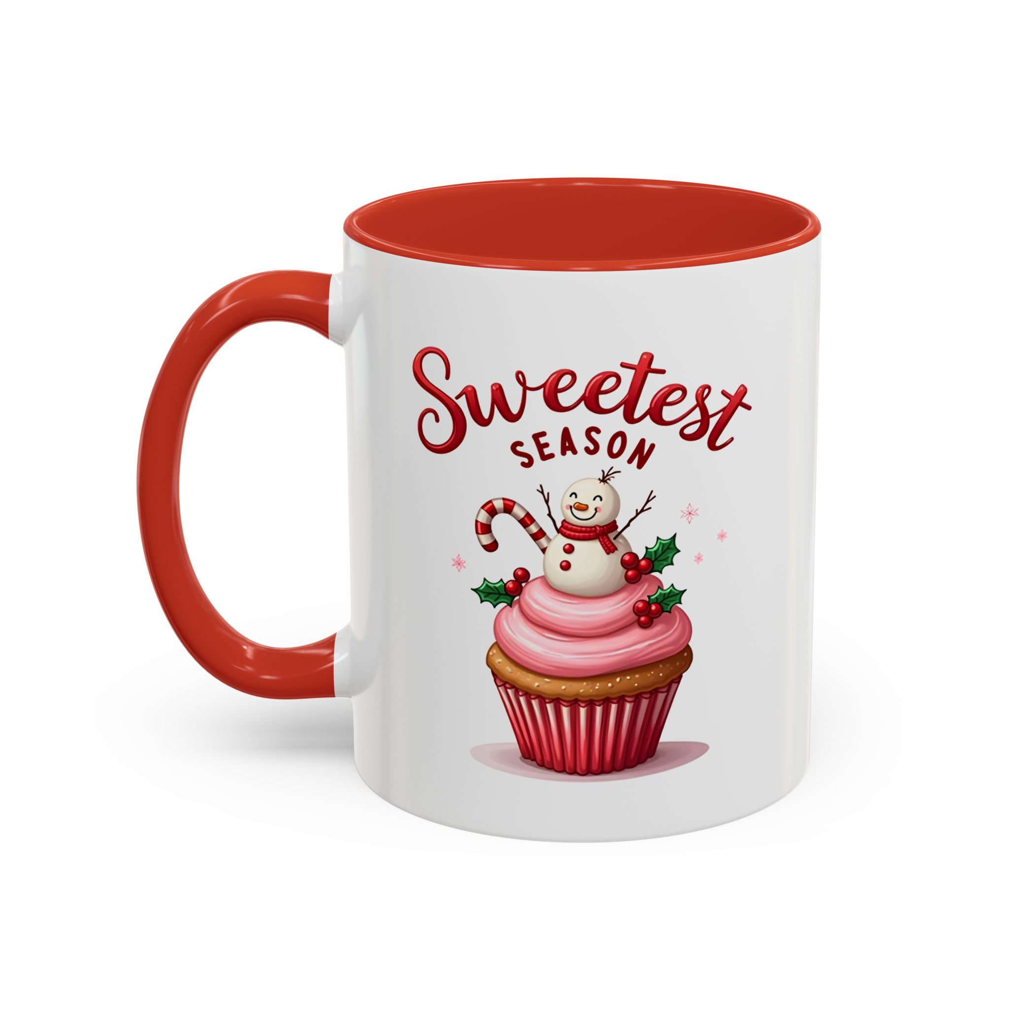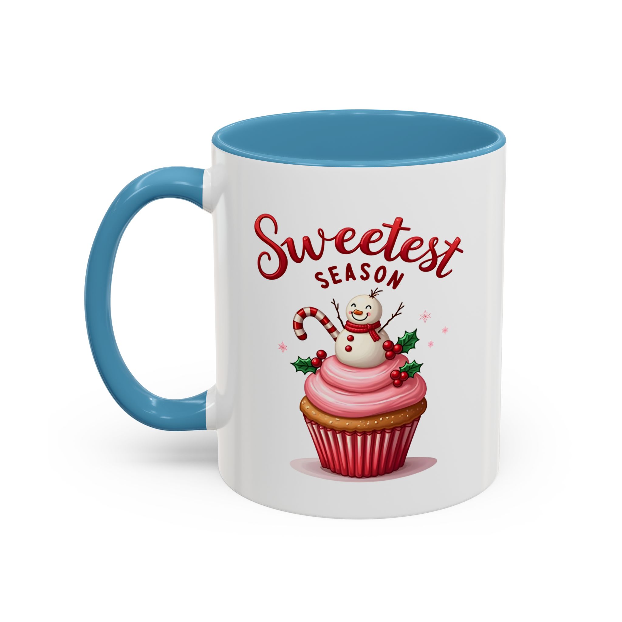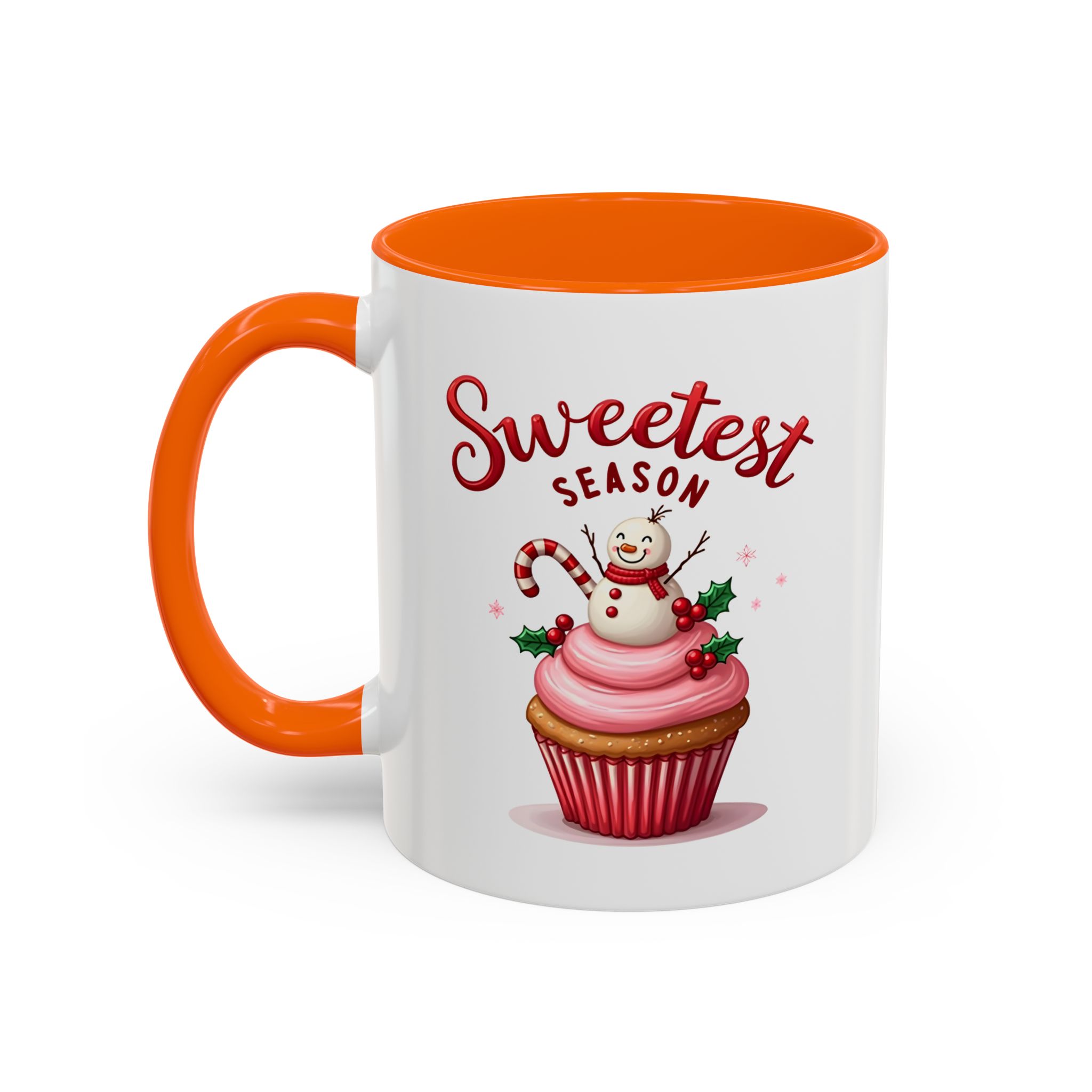 Sweet season christmas mug with “Sweetest Season” cupcake snowman design. 11oz ceramic, dishwasher/microwave safe, available in 9 accent colors.
