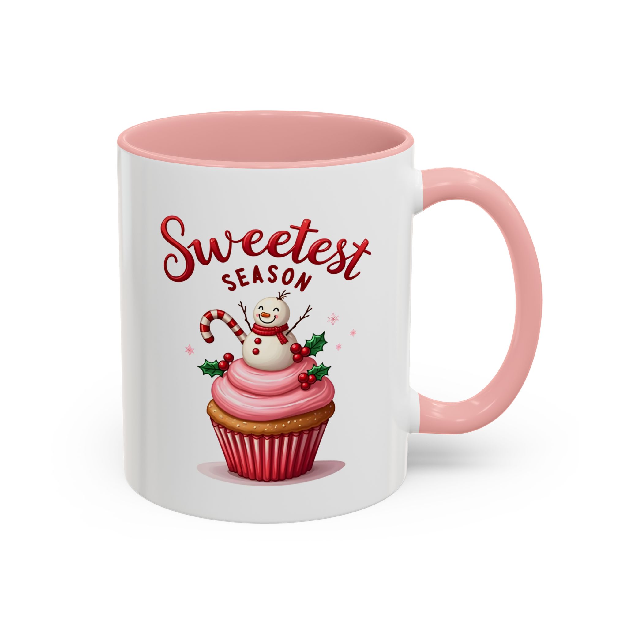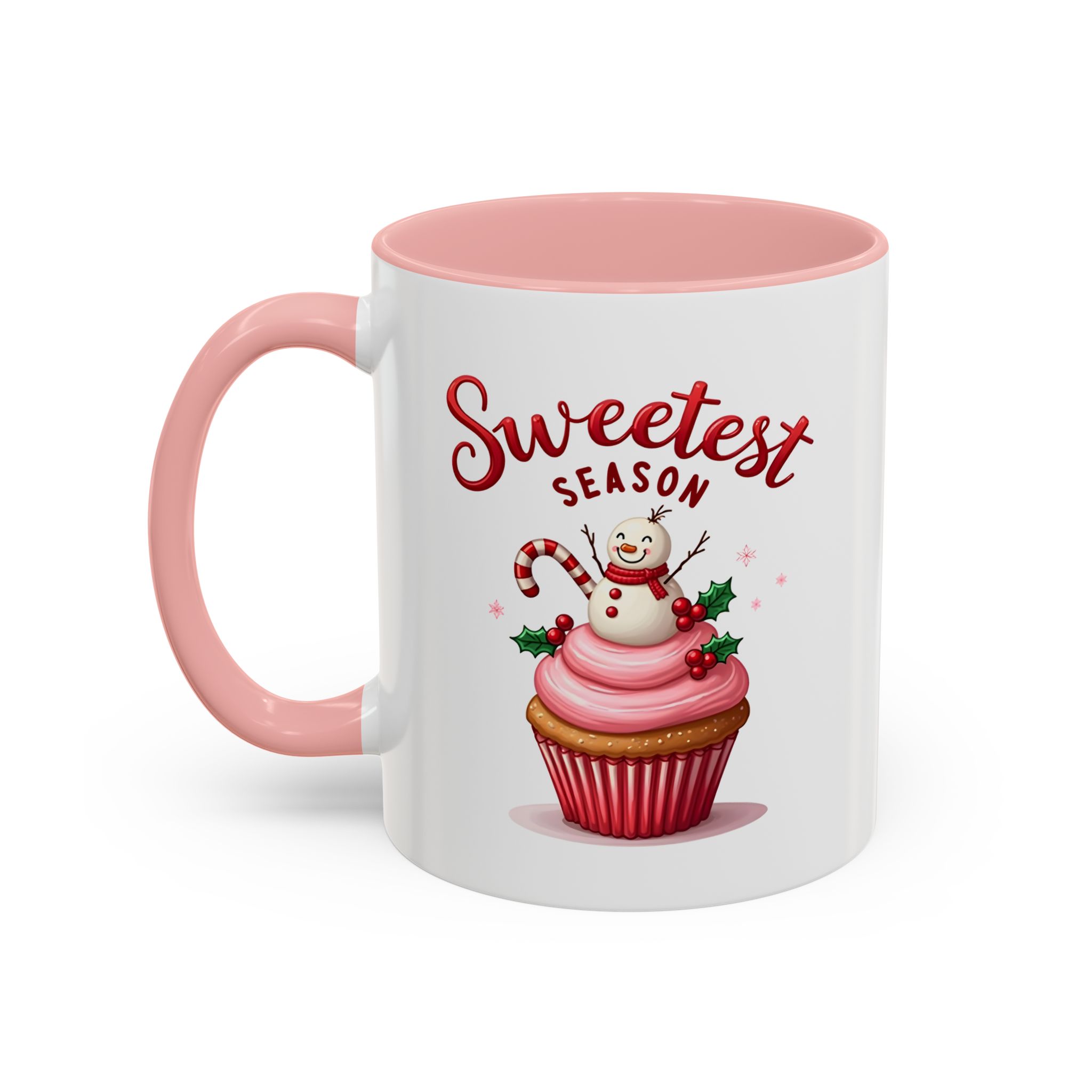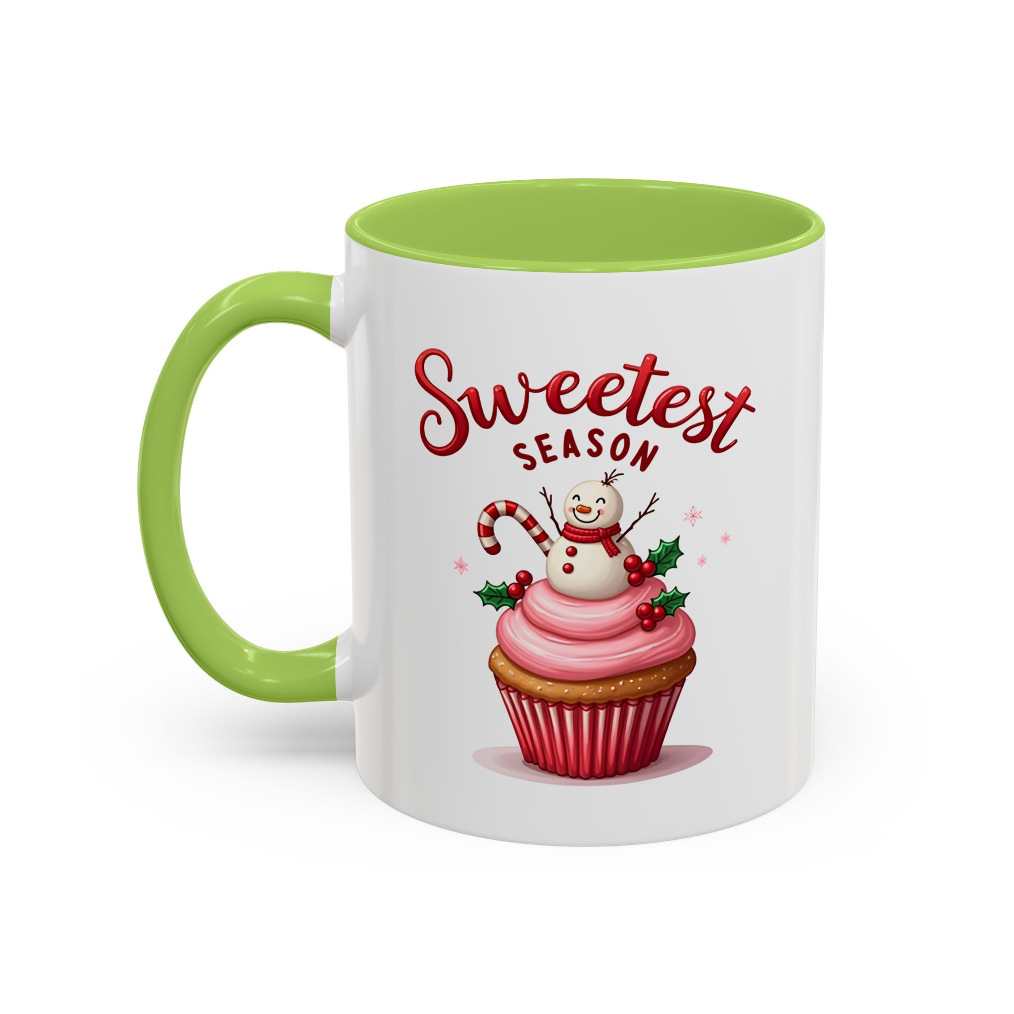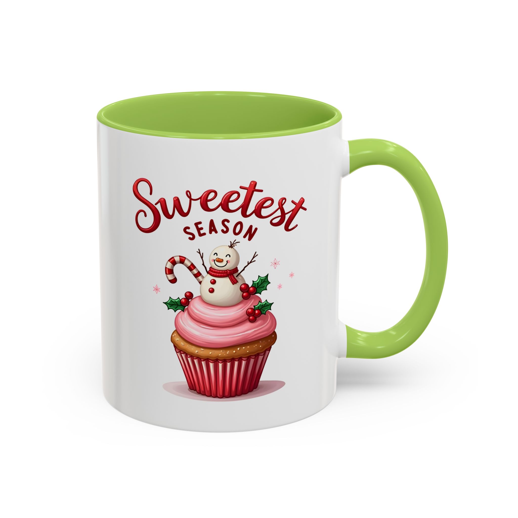 Sweet season christmas mug with “Sweetest Season” cupcake snowman design. 11oz ceramic, dishwasher/microwave safe, available in 9 accent colors.
