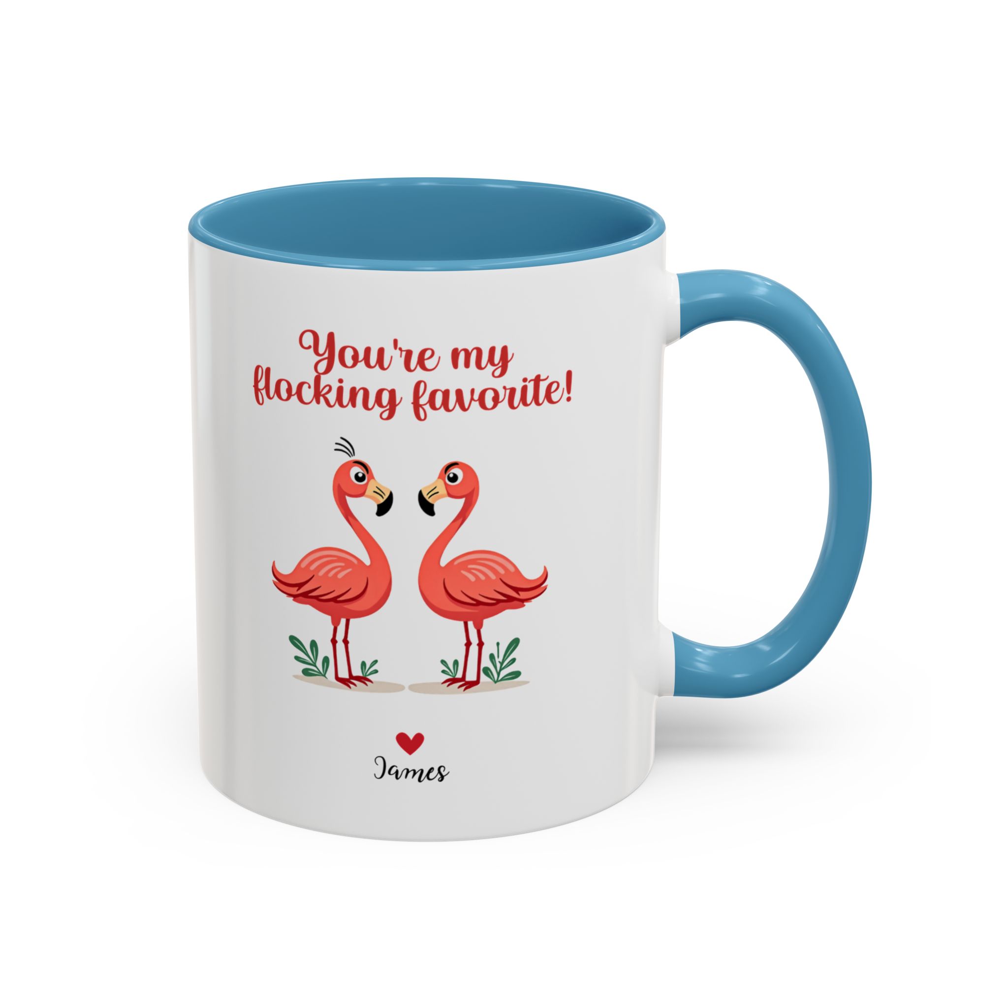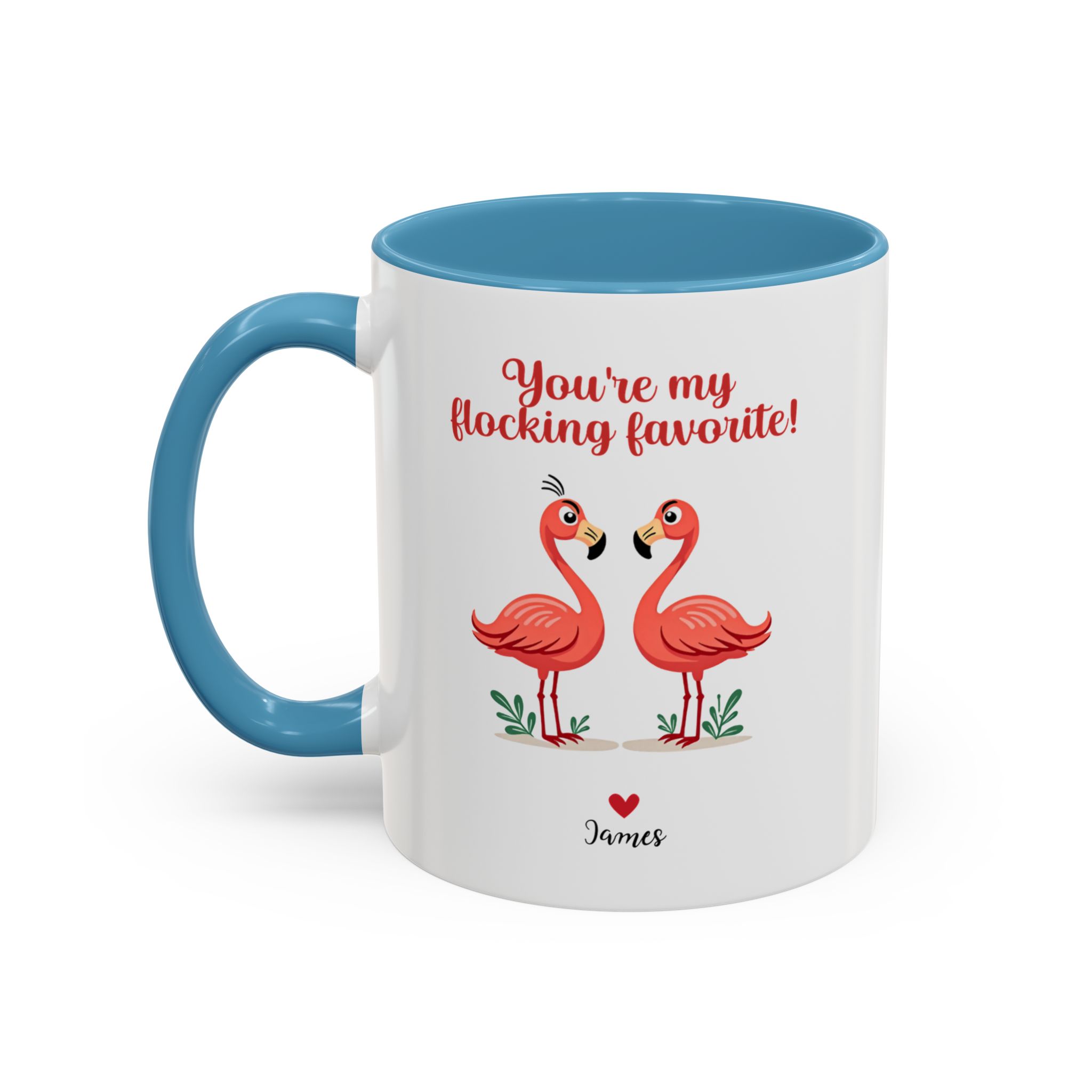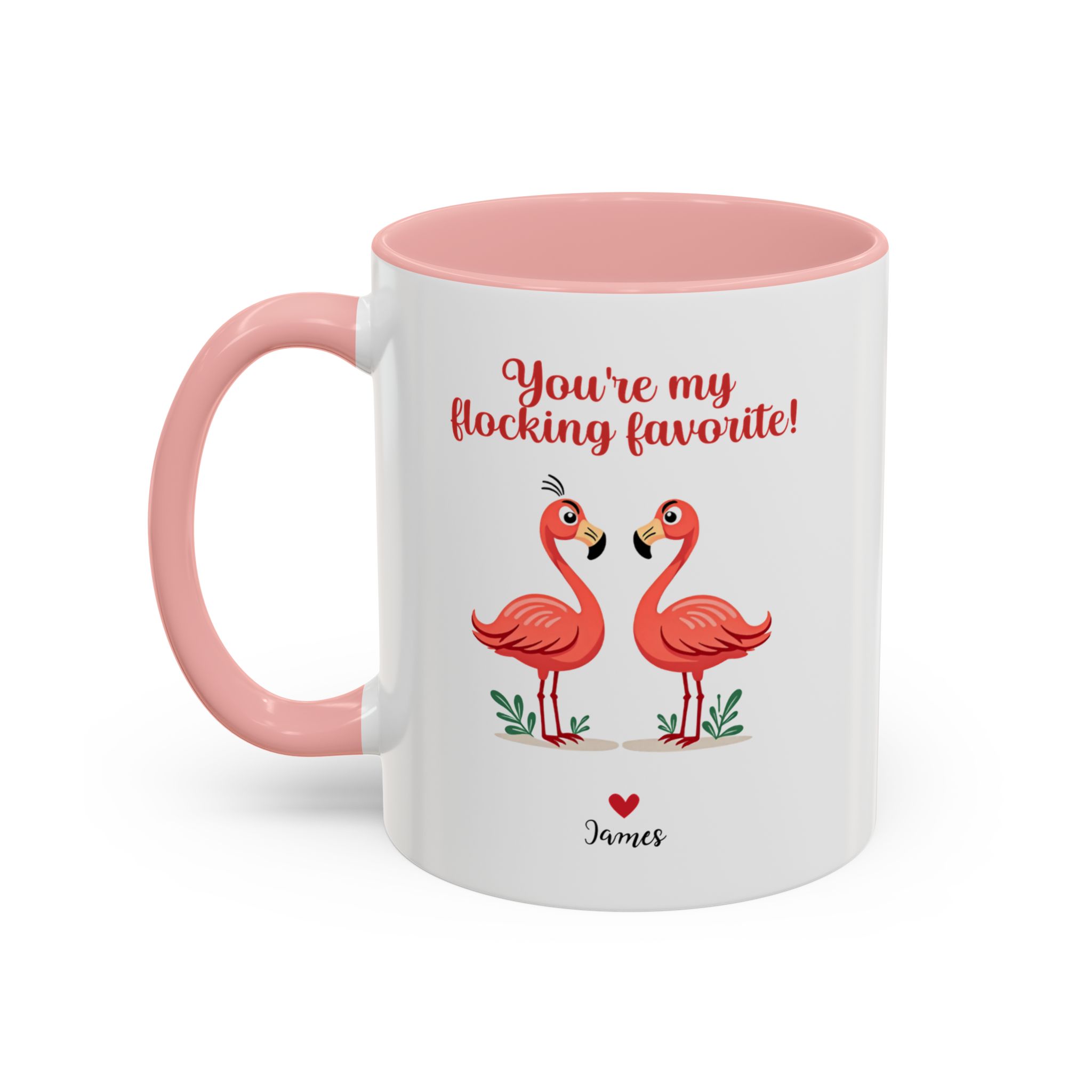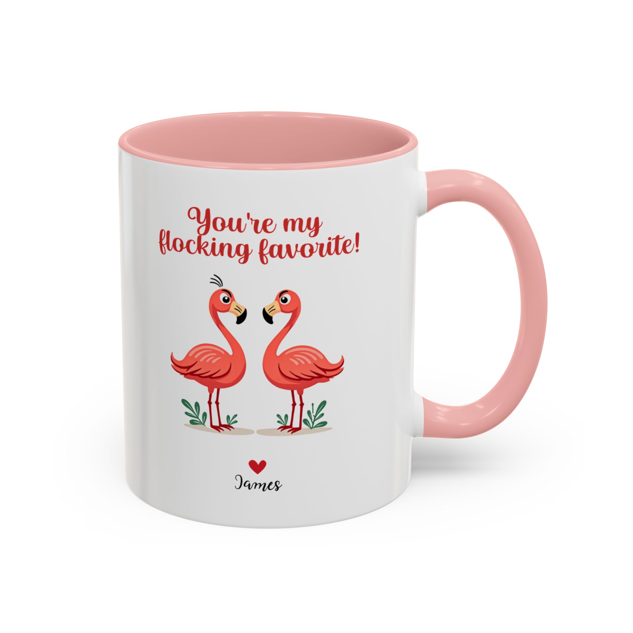 A hilarious Valentine’s Day mug featuring the cheeky quote ‘You’re My Flocking Favourite!’ with a playful flamingo design. This 11oz personalised mug is a perfect gift for your special someone or any flamingo lover. Microwave & dishwasher safe.
