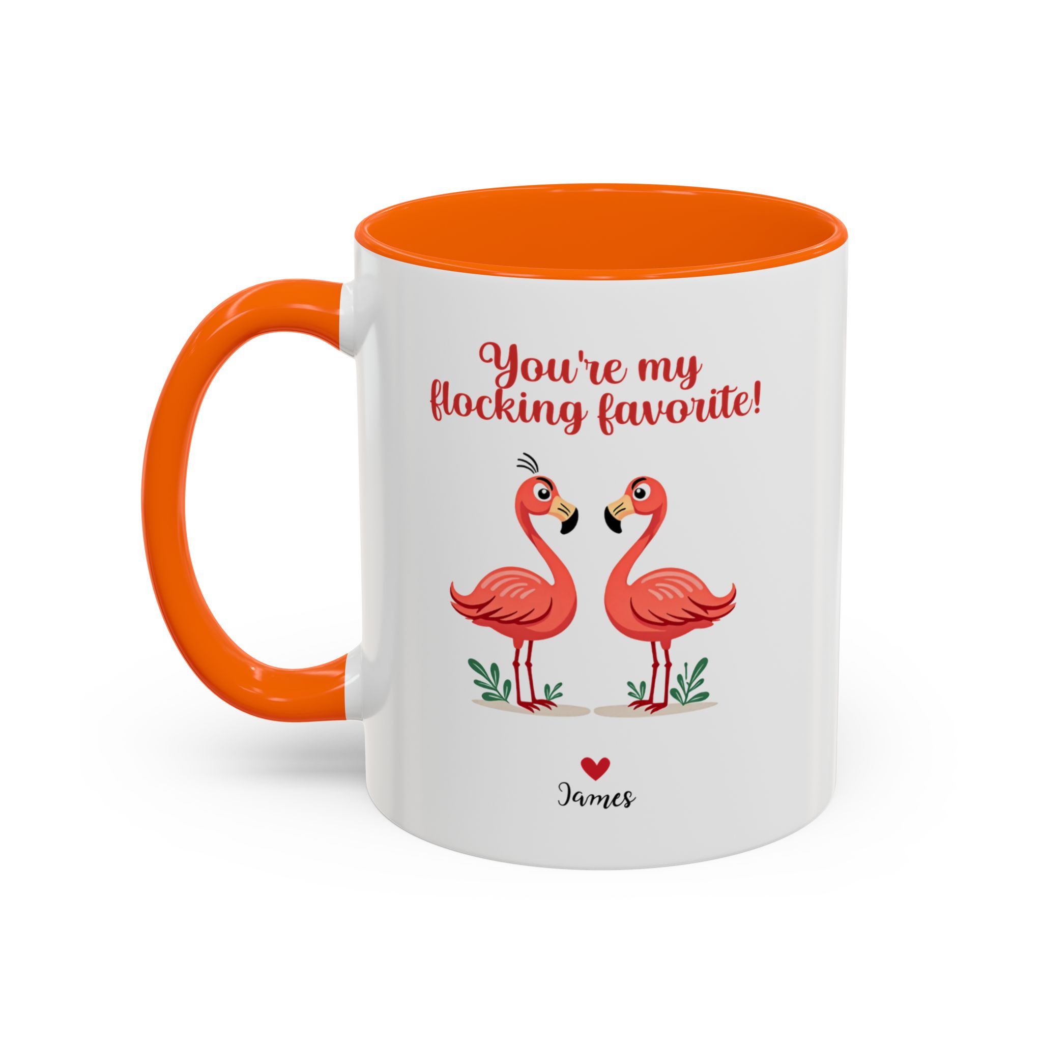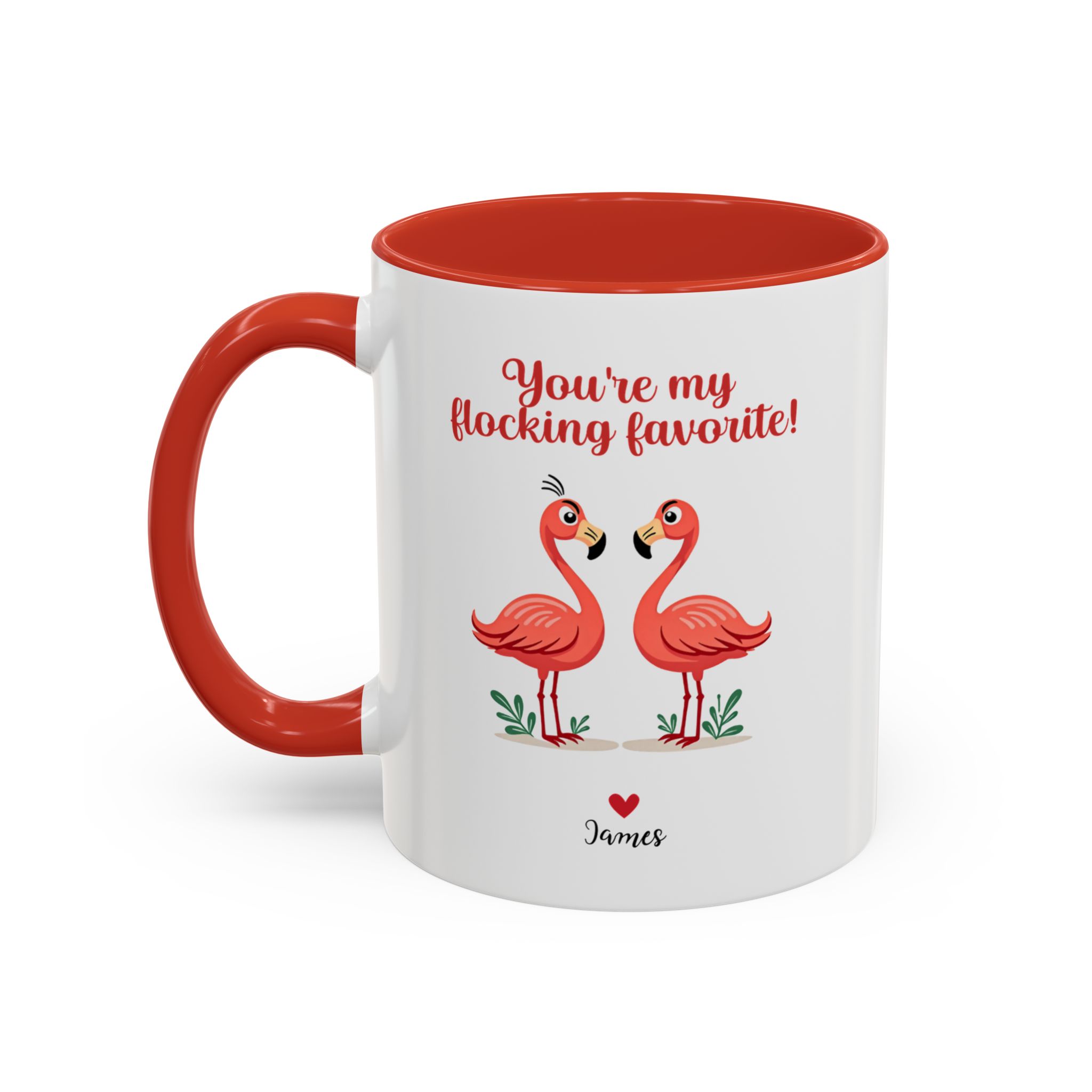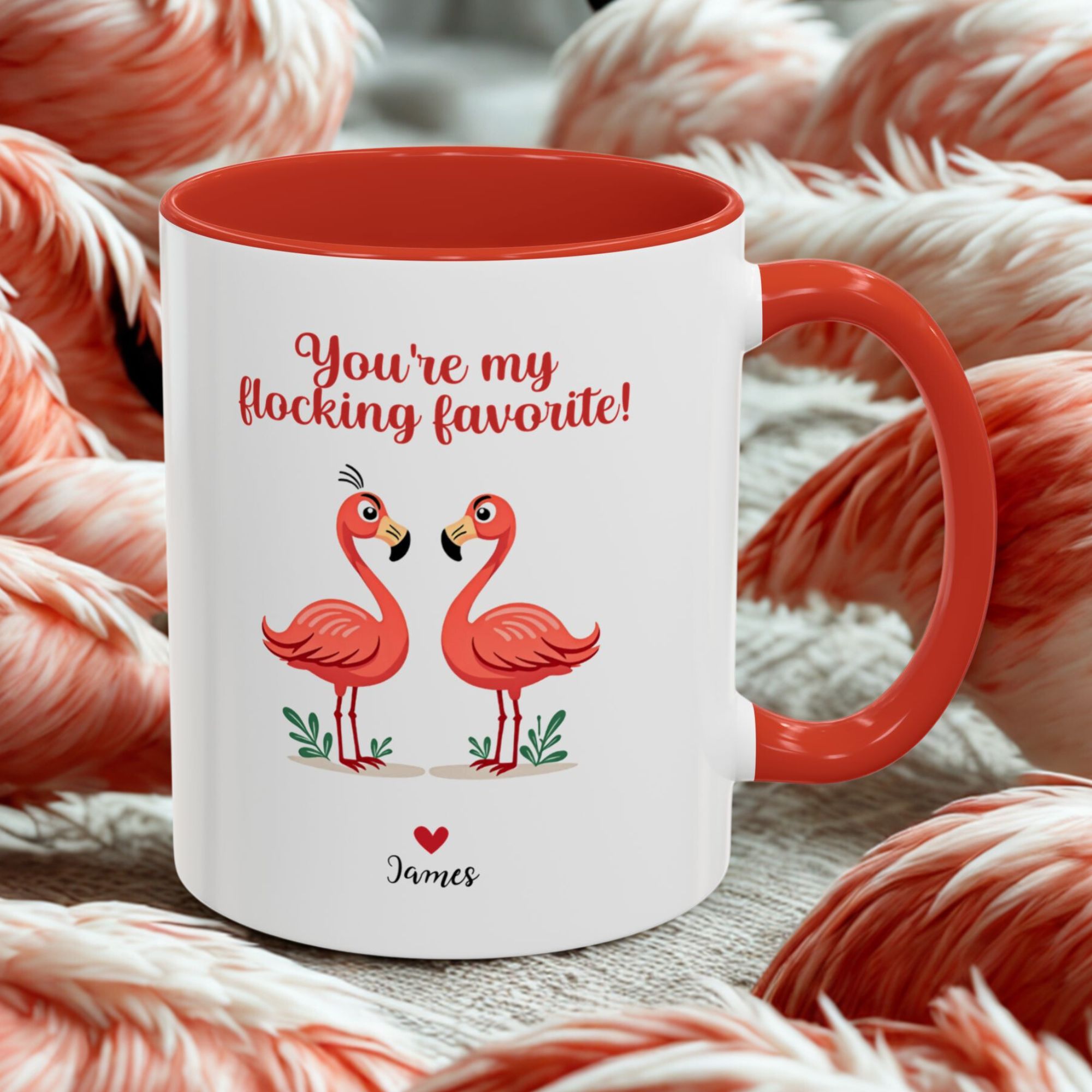 A hilarious Valentine’s Day mug featuring the cheeky quote ‘You’re My Flocking Favourite!’ with a playful flamingo design. This 11oz personalised mug is a perfect gift for your special someone or any flamingo lover. Microwave & dishwasher safe.