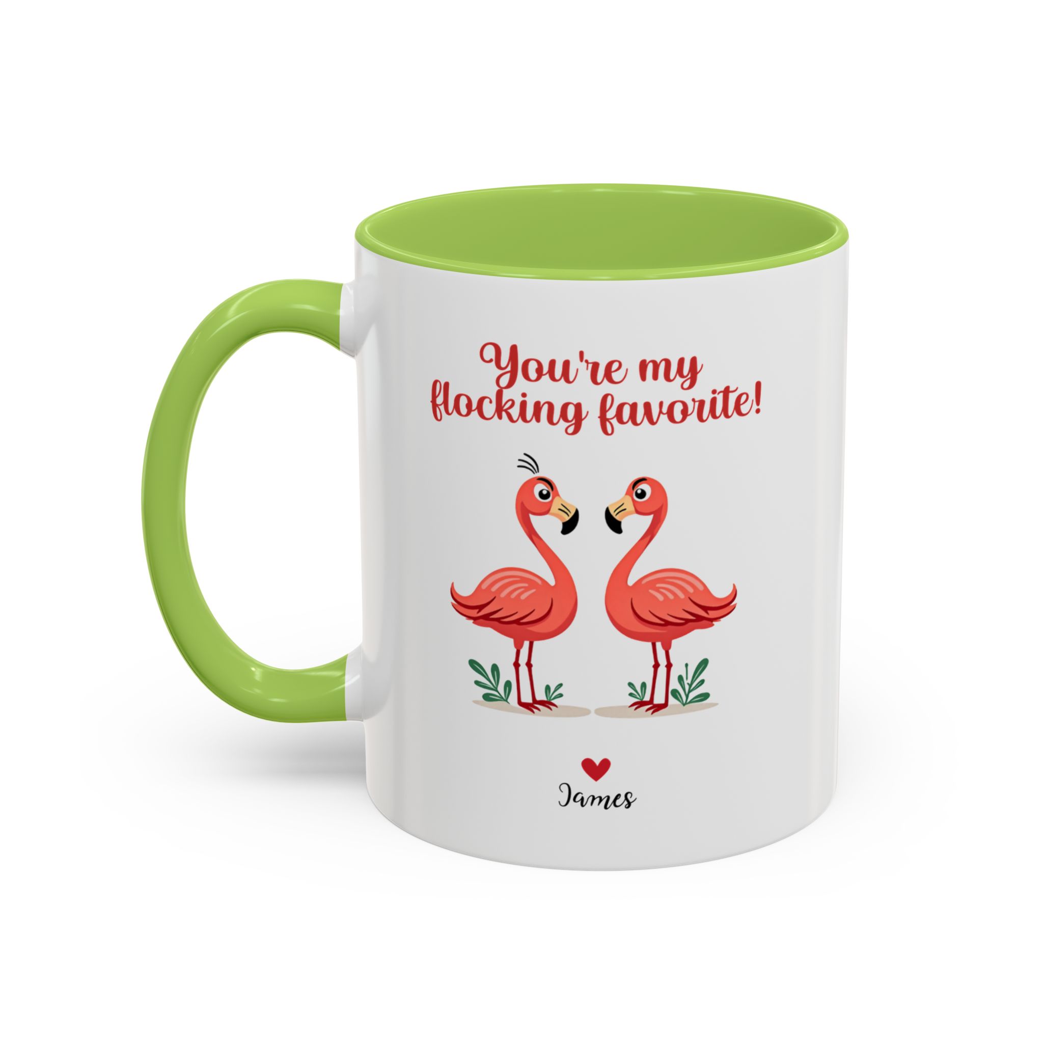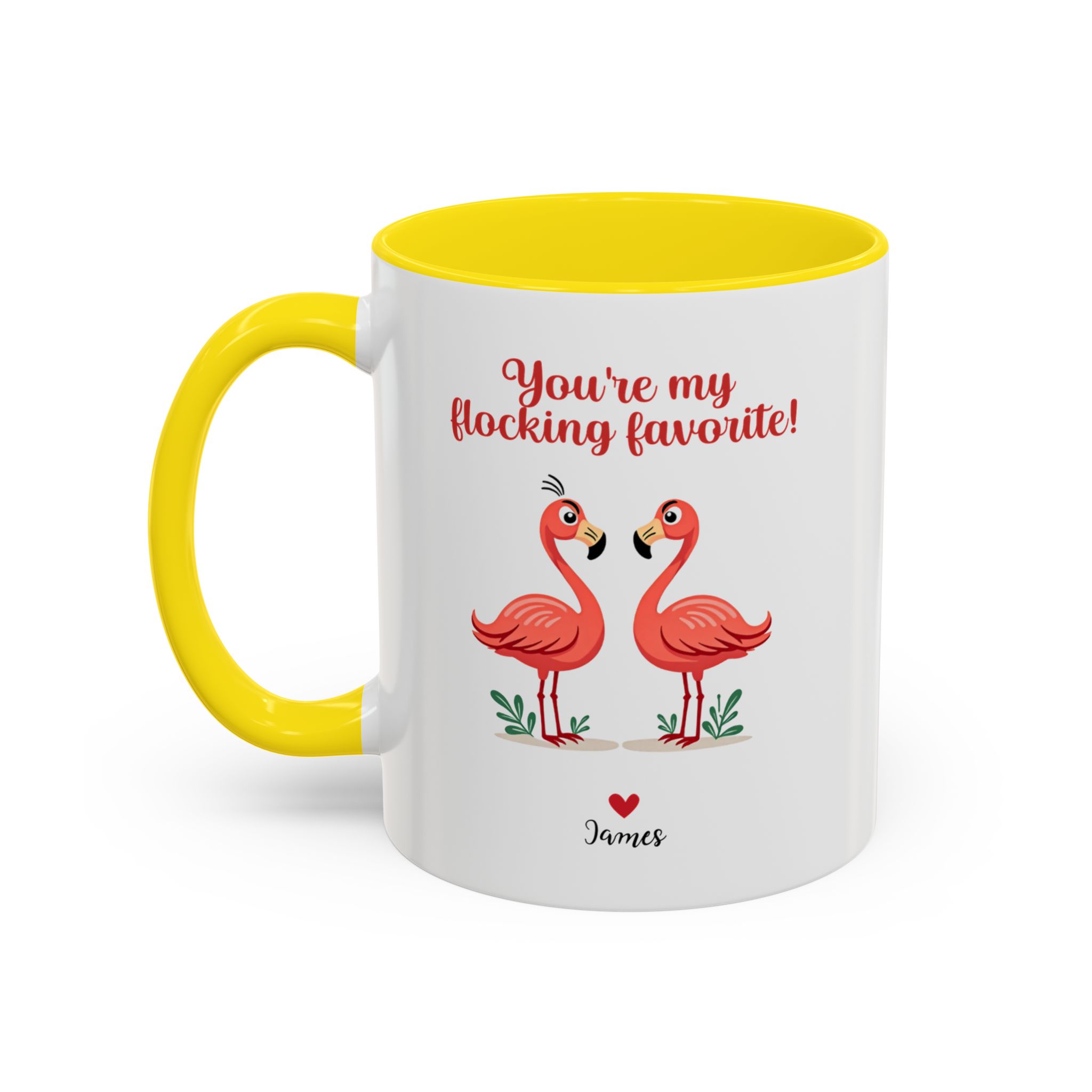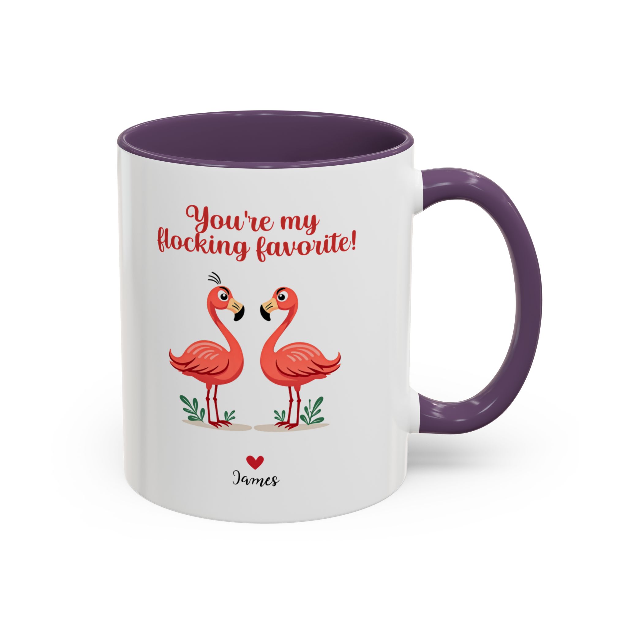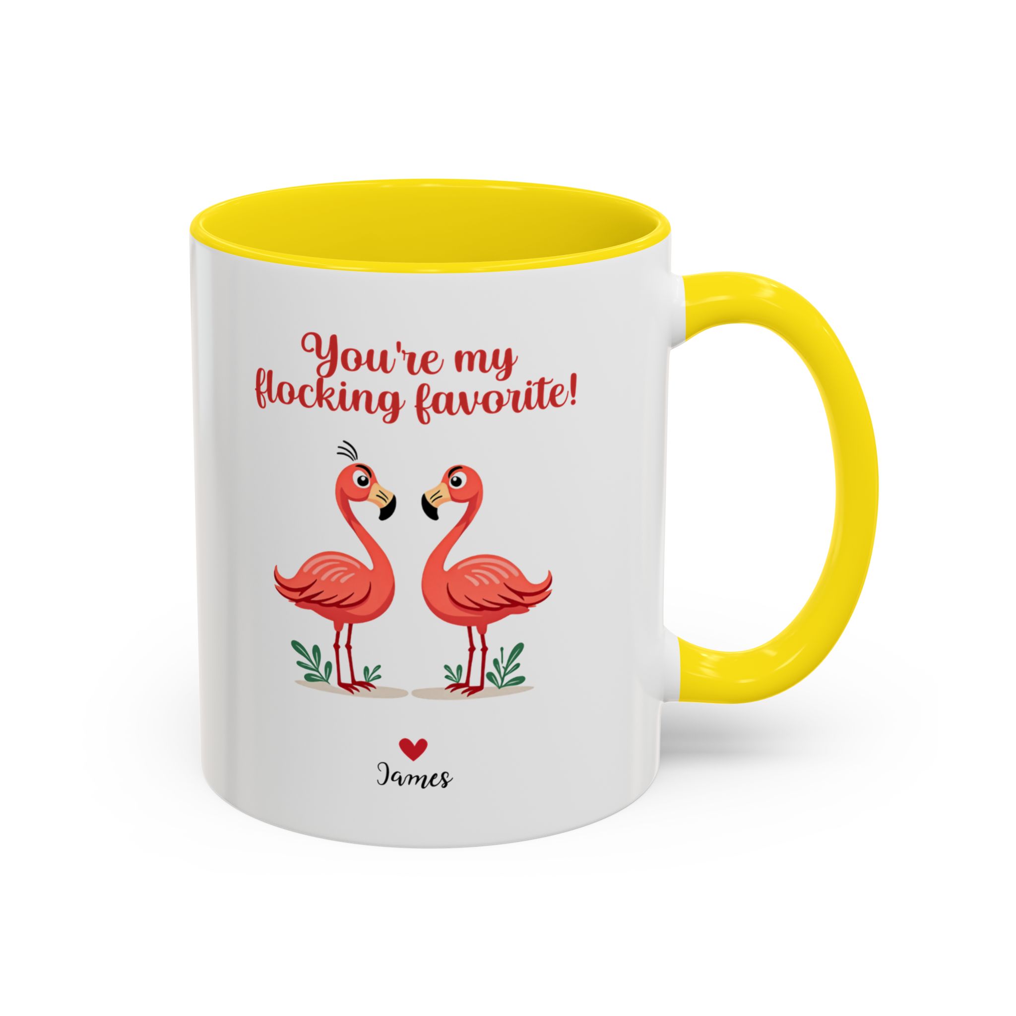 A hilarious Valentine’s Day mug featuring the cheeky quote ‘You’re My Flocking Favourite!’ with a playful flamingo design. This 11oz personalised mug is a perfect gift for your special someone or any flamingo lover. Microwave & dishwasher safe.