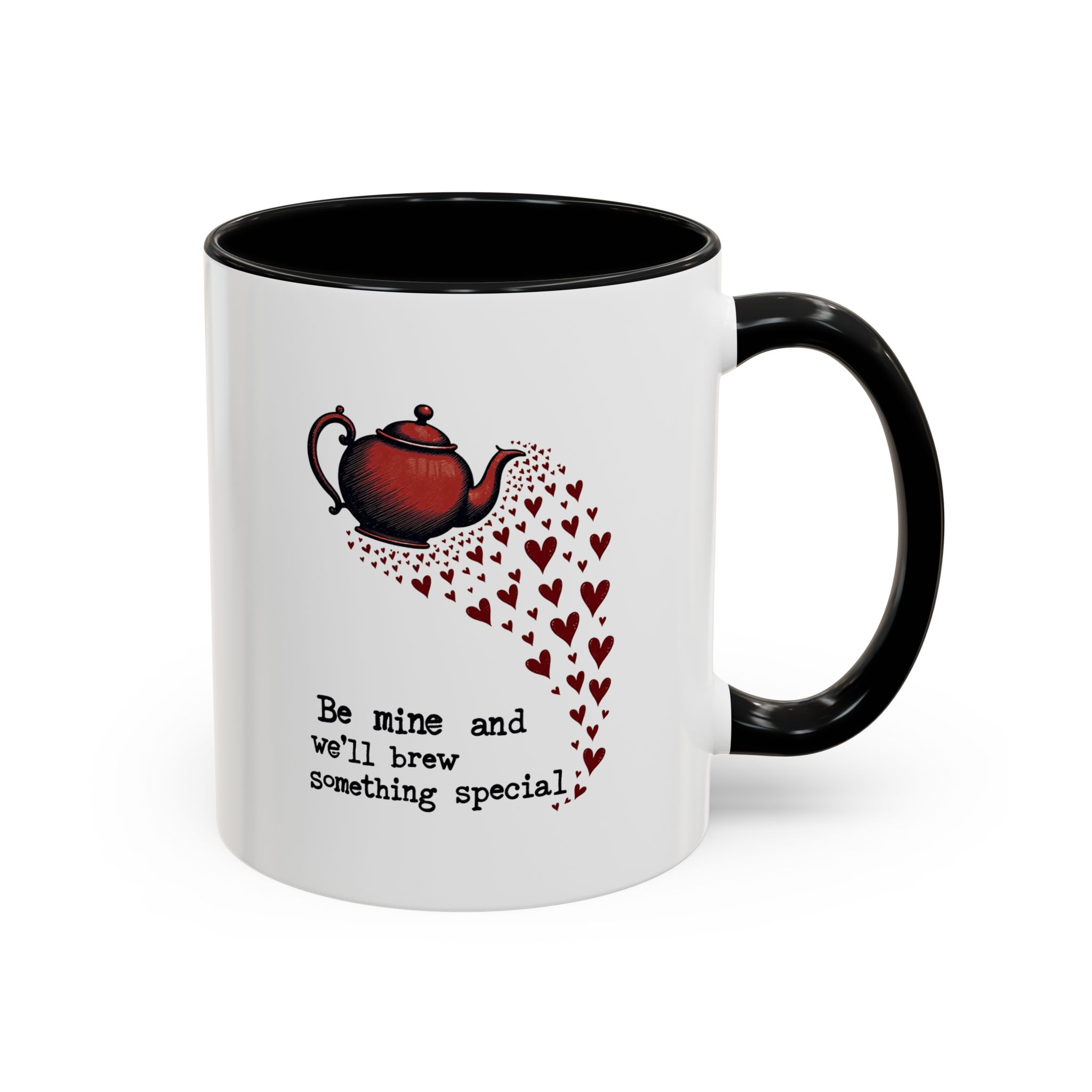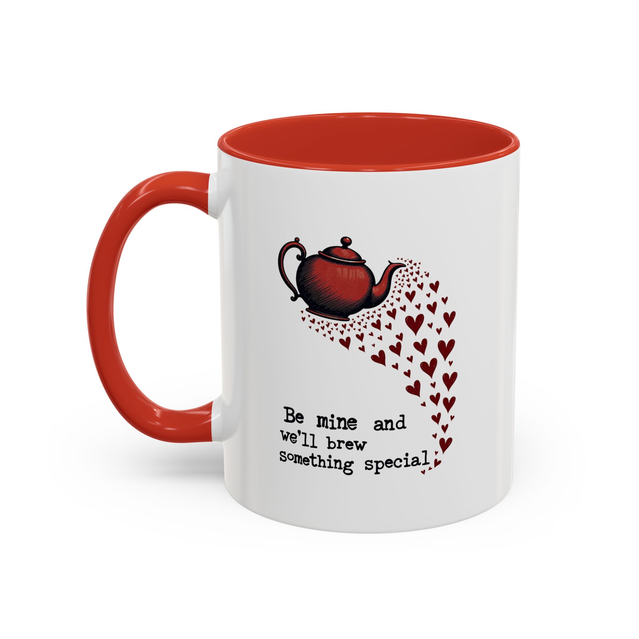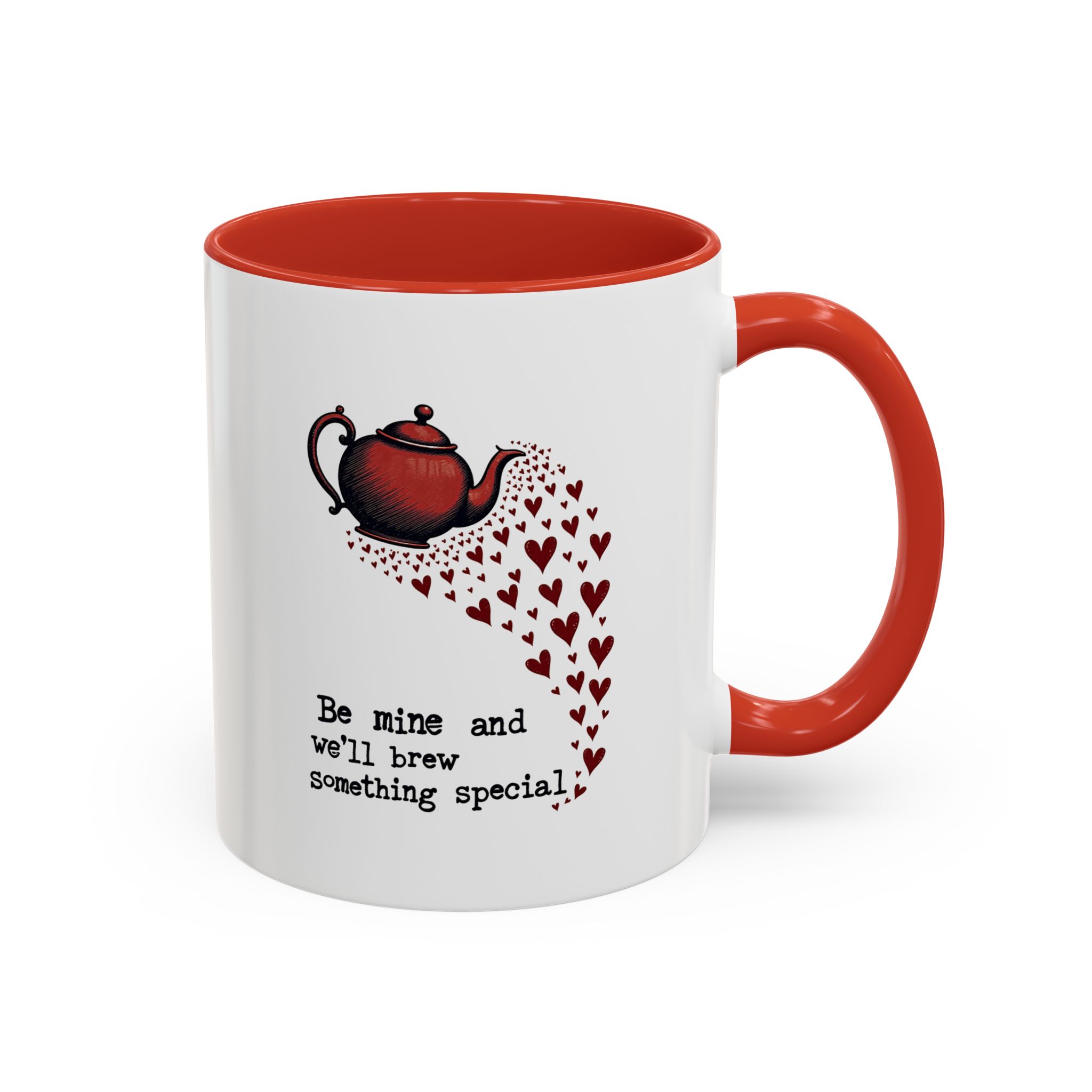 The design features a vintage-style red teapot pouring a swirl of little hearts, visually flowing into the typewriter-style text: “Be mine and we’ll brew something special.” The layout is simple, sweet, and striking — with deep red accents and a clear love note to tea and connection.
