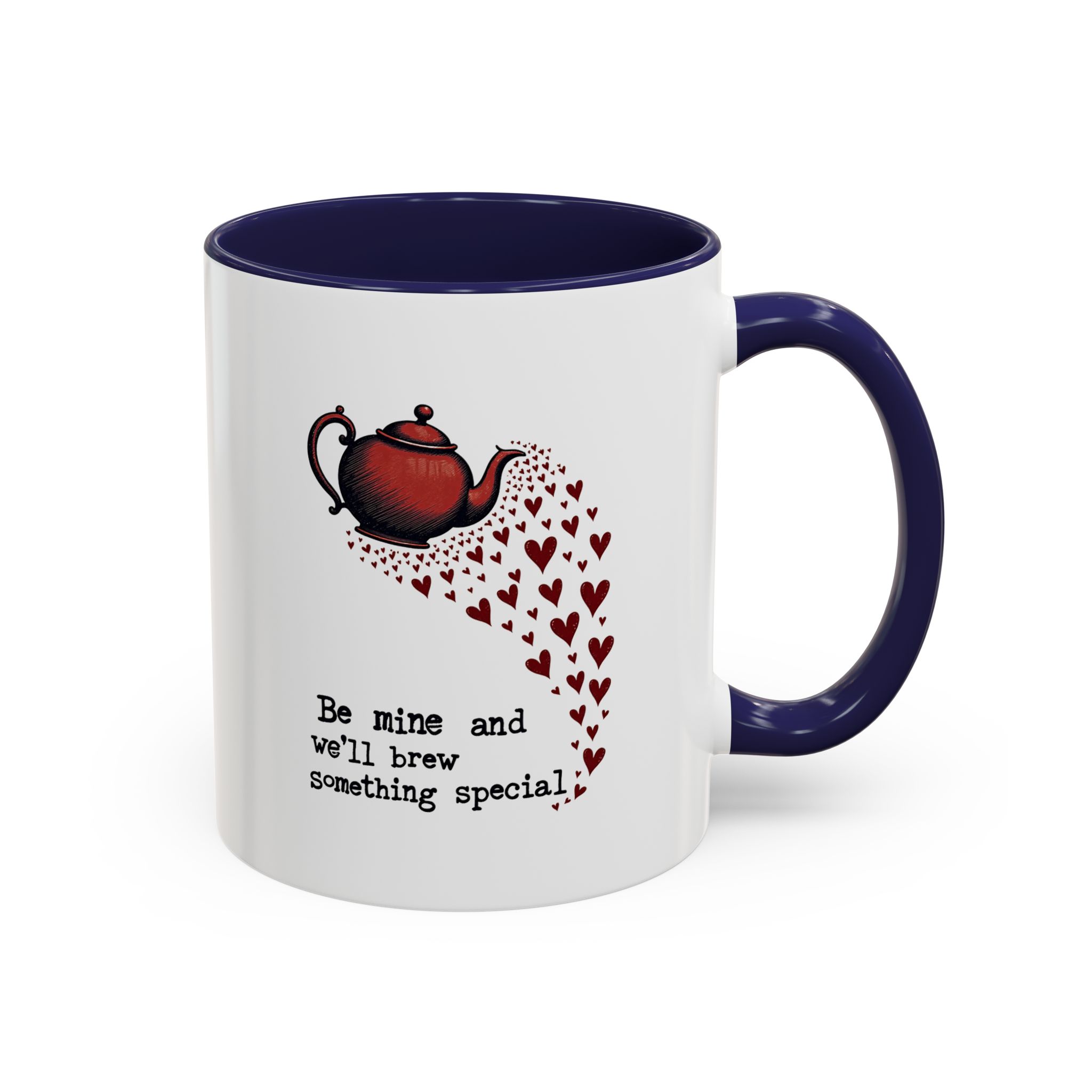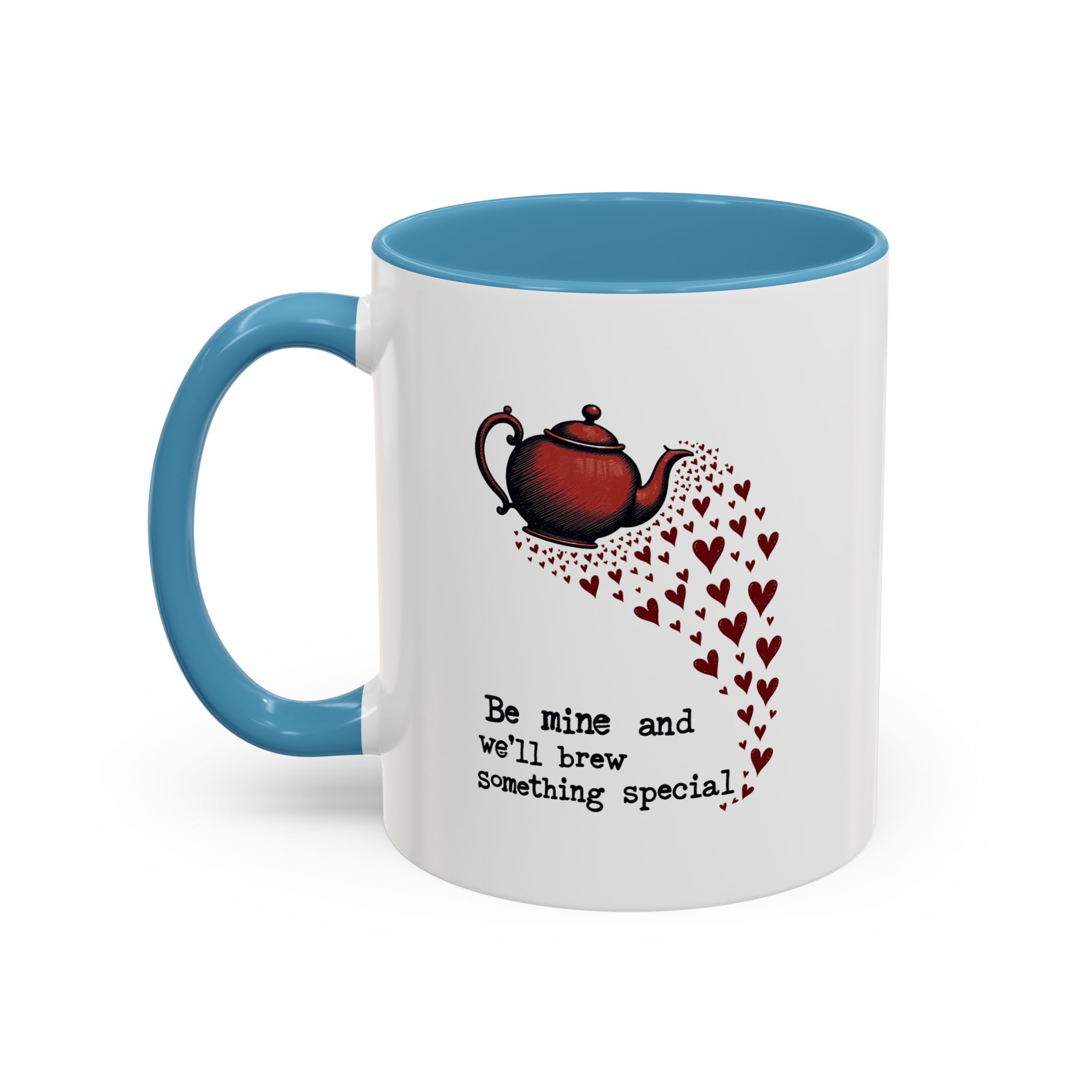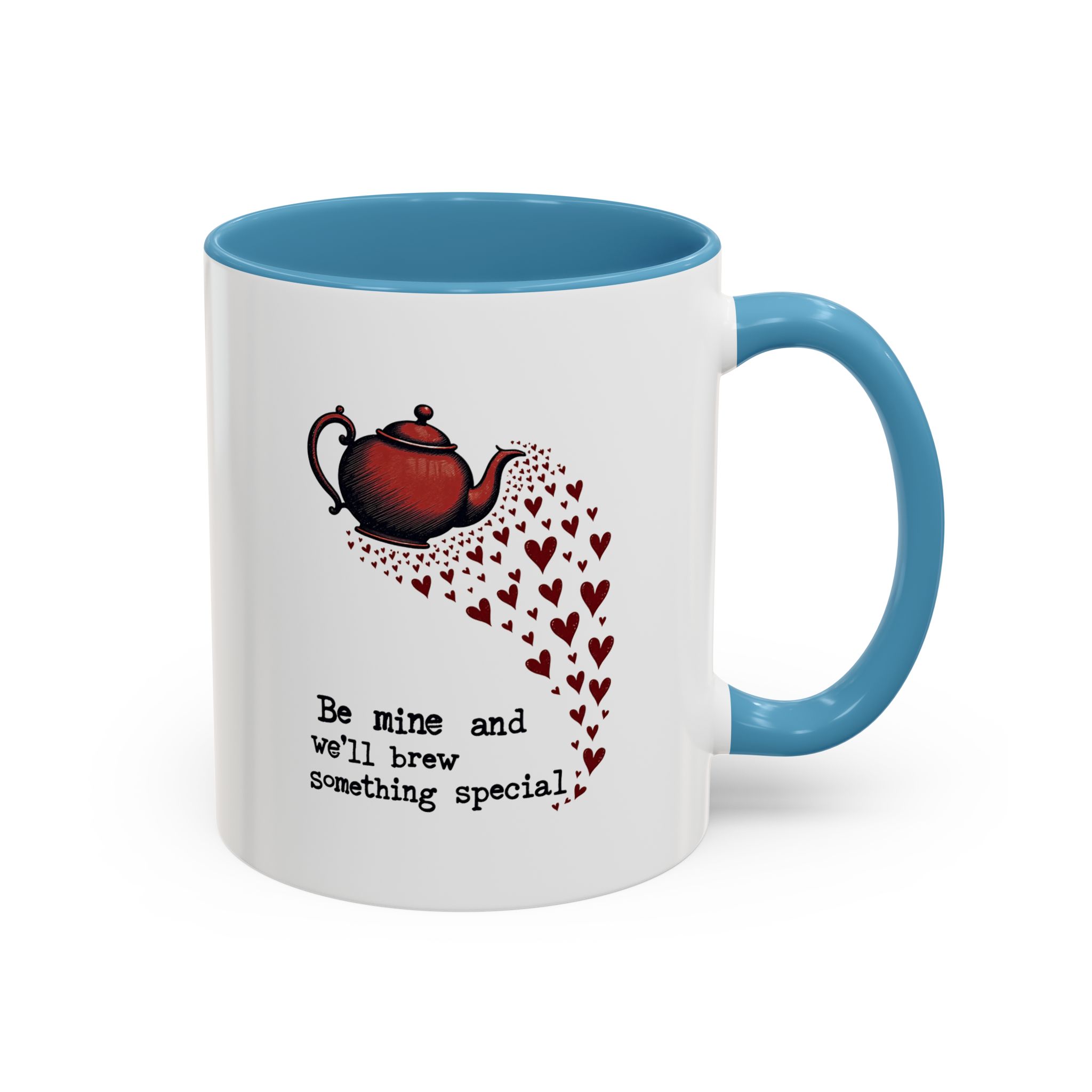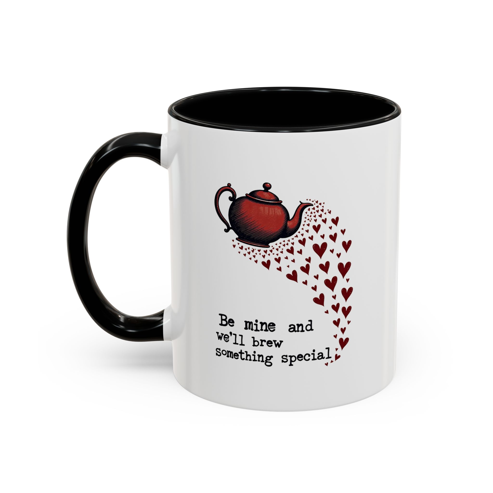 The design features a vintage-style red teapot pouring a swirl of little hearts, visually flowing into the typewriter-style text: “Be mine and we’ll brew something special.” The layout is simple, sweet, and striking — with deep red accents and a clear love note to tea and connection.