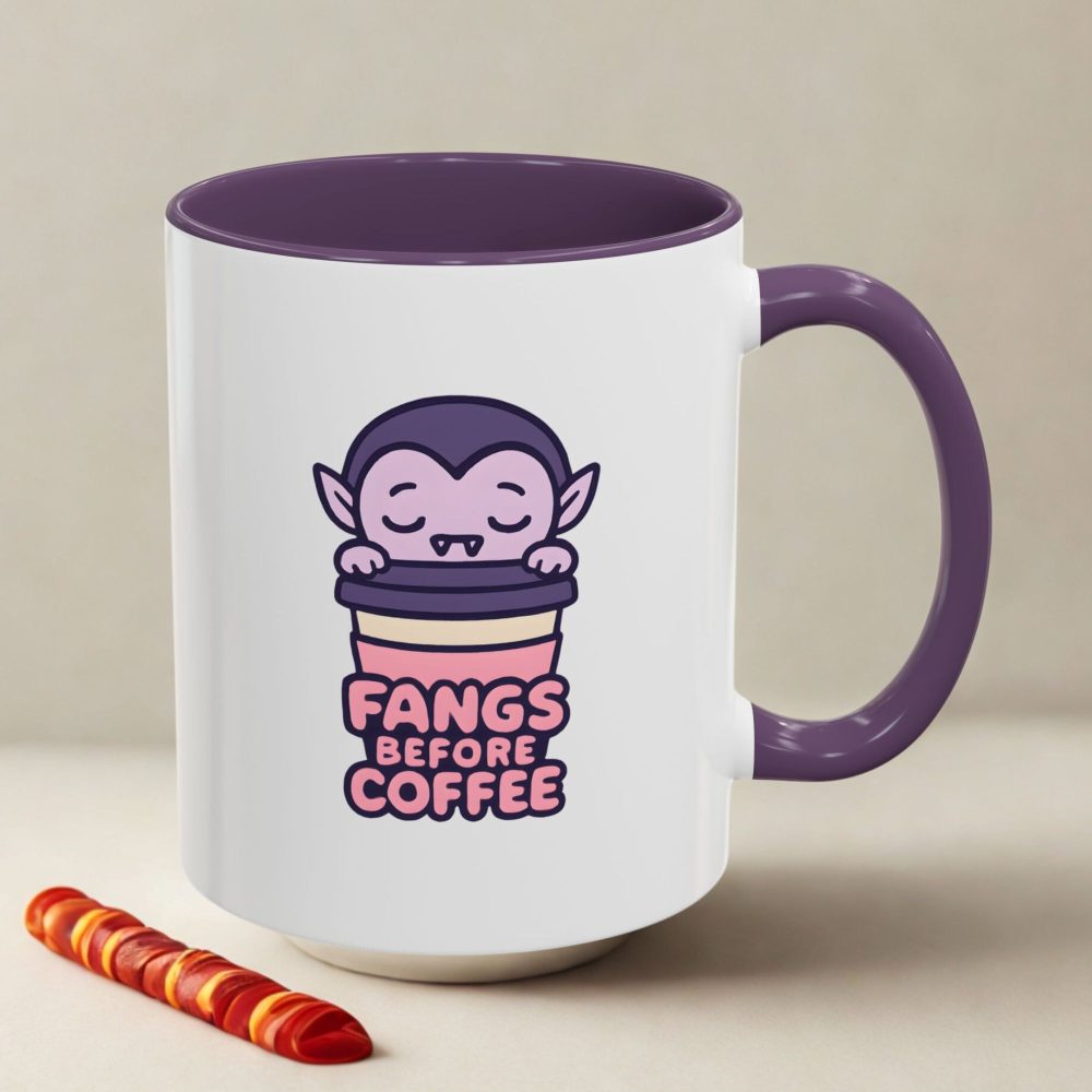 Vampire Coffee Mug with cute “Fangs Before Coffee” design. Perfect for Halloween lovers, vampire fans, and anyone who needs a spooky start to the day.