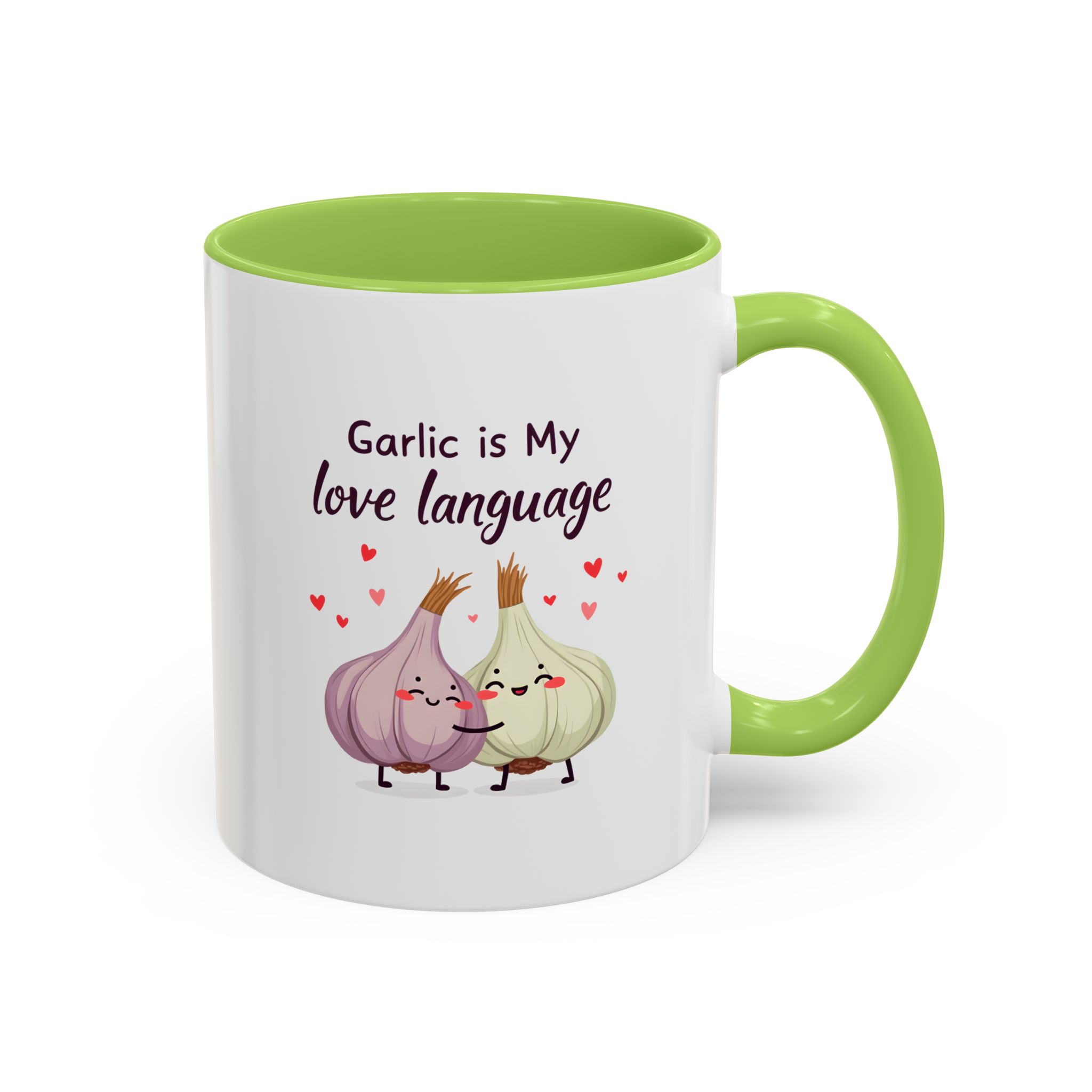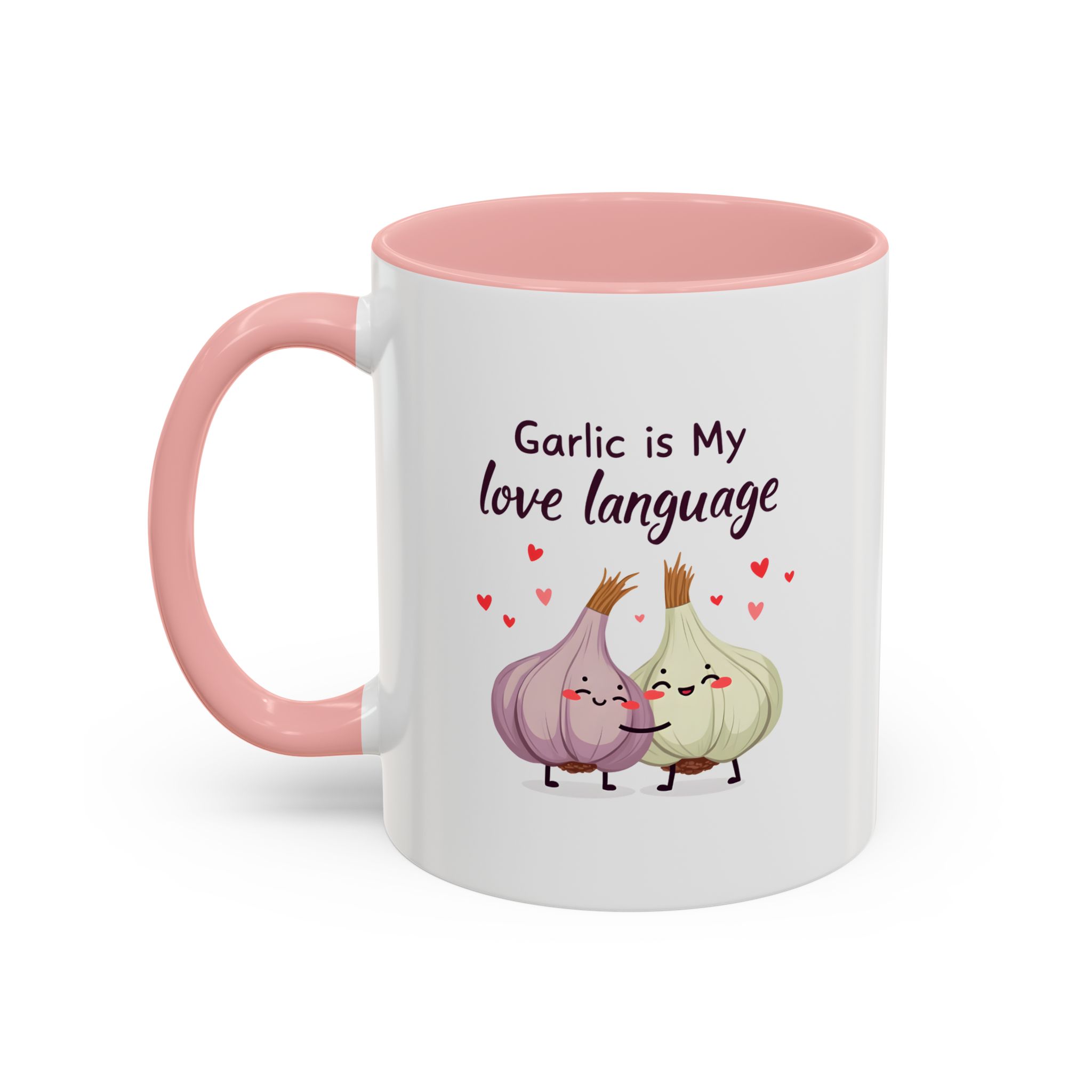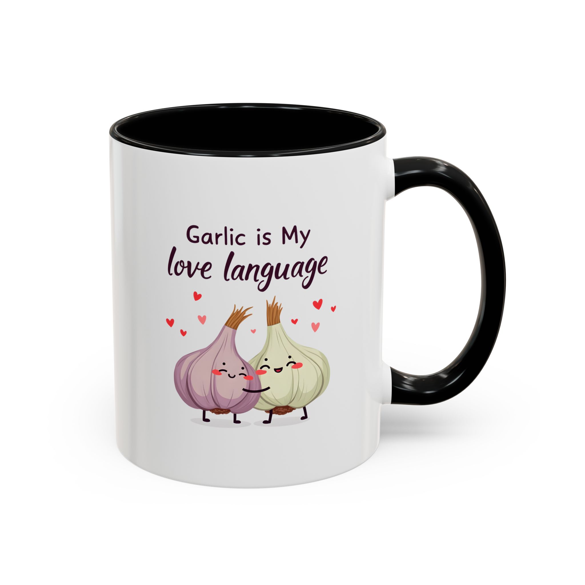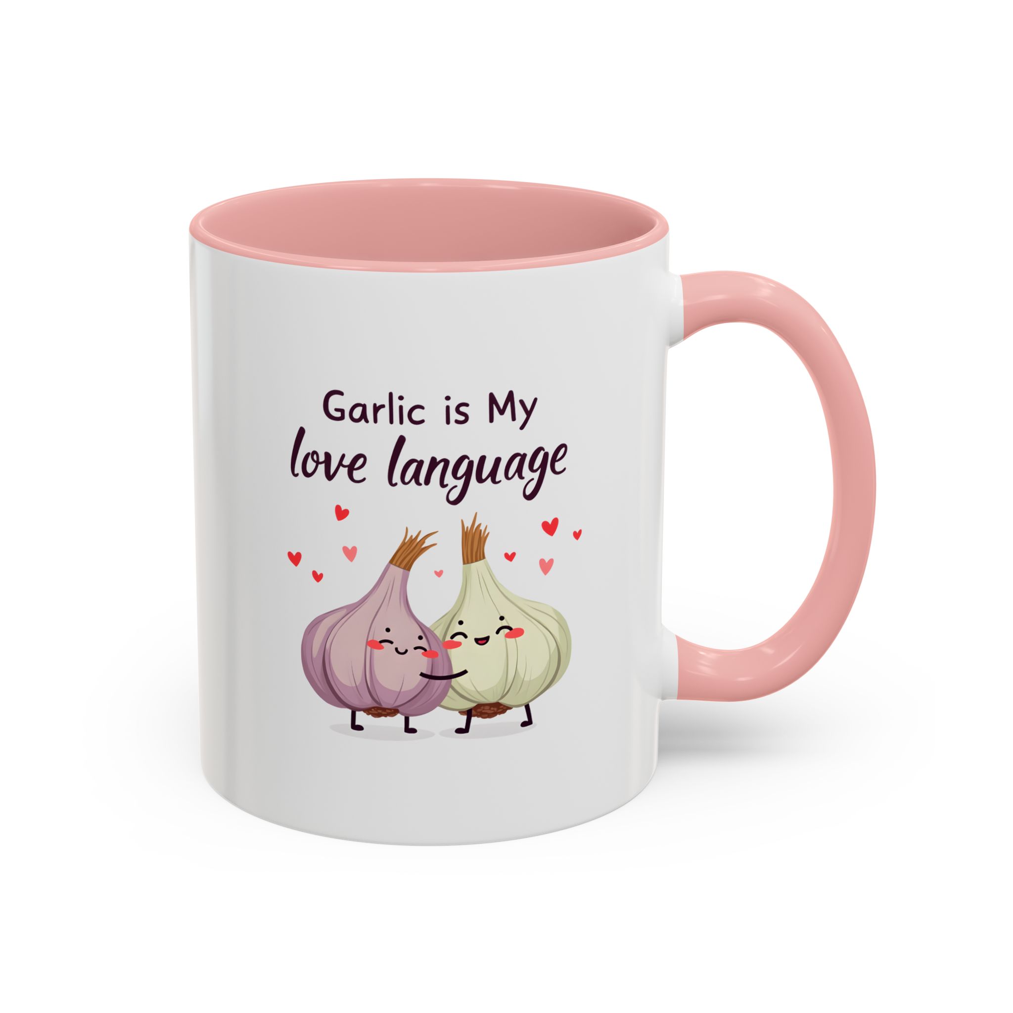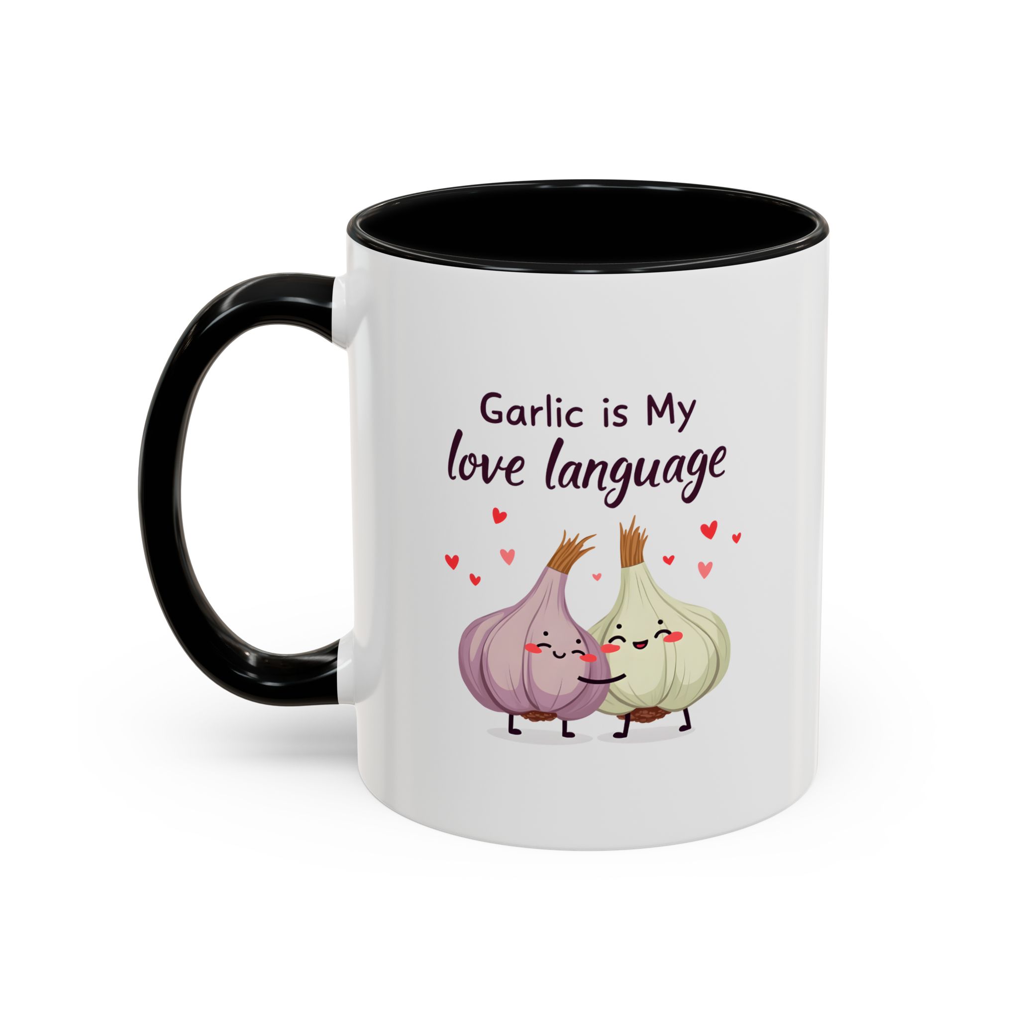 “Garlic is My Love Language” with hugging garlic cloves and floating hearts — a sweet vegan gift mug for flavour lovers.
