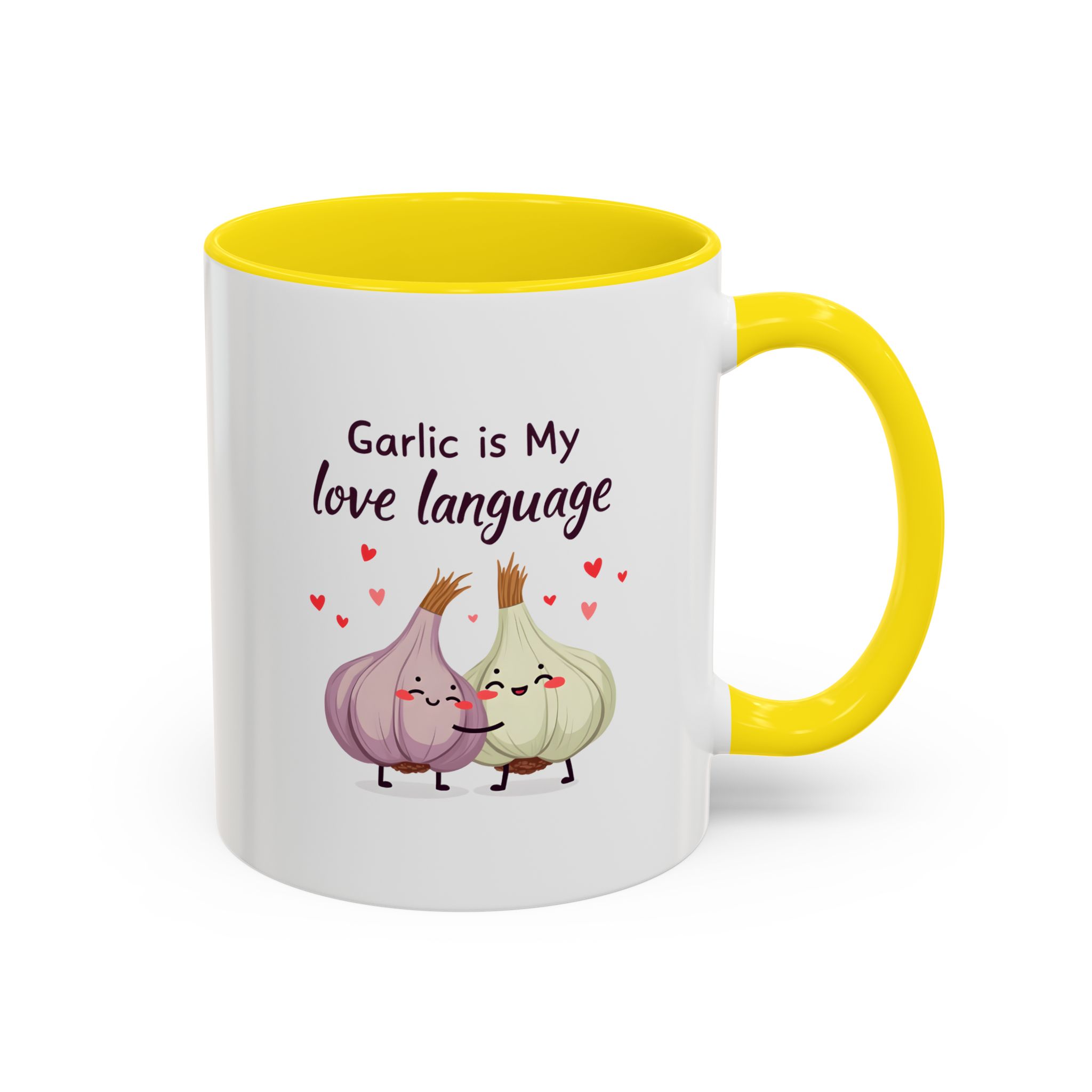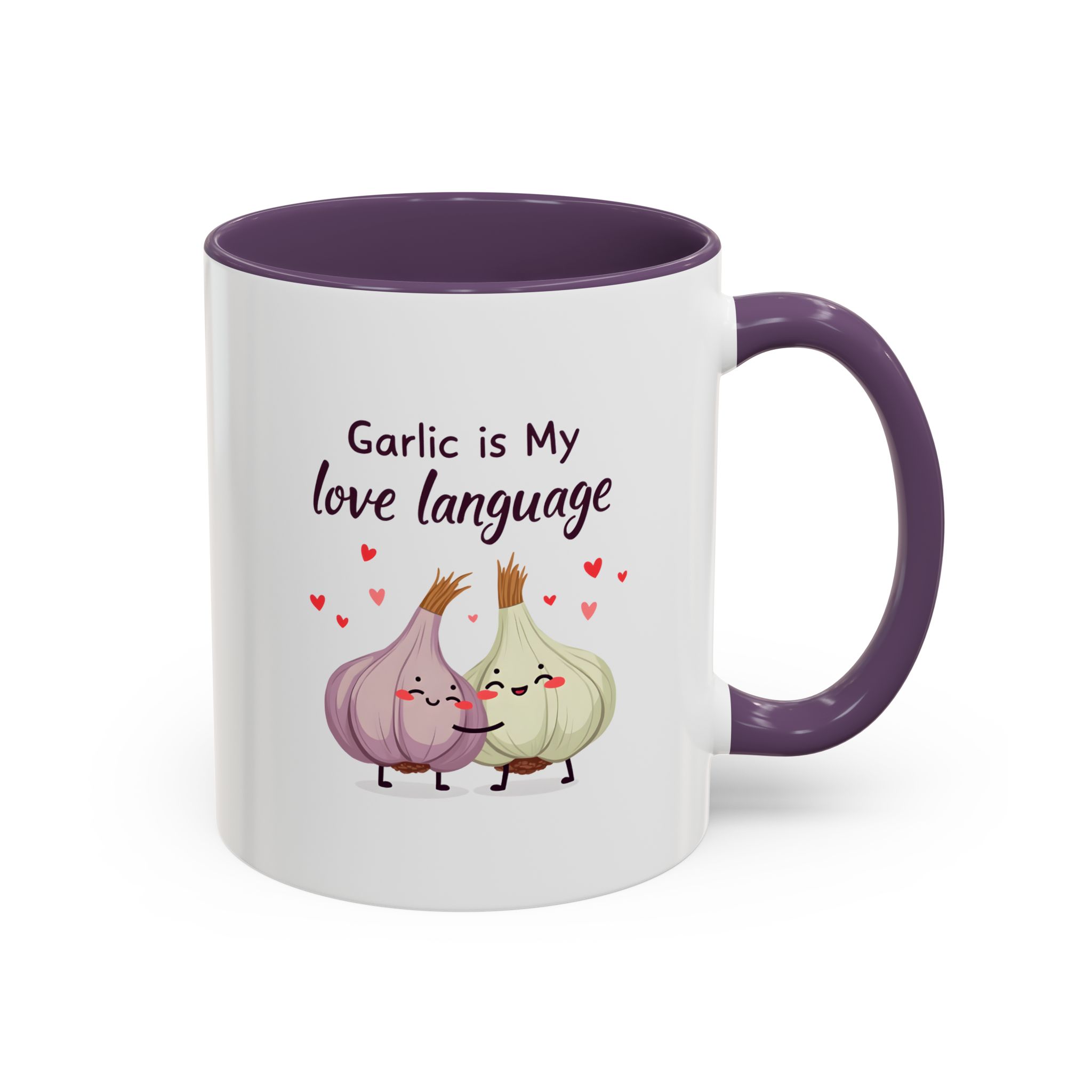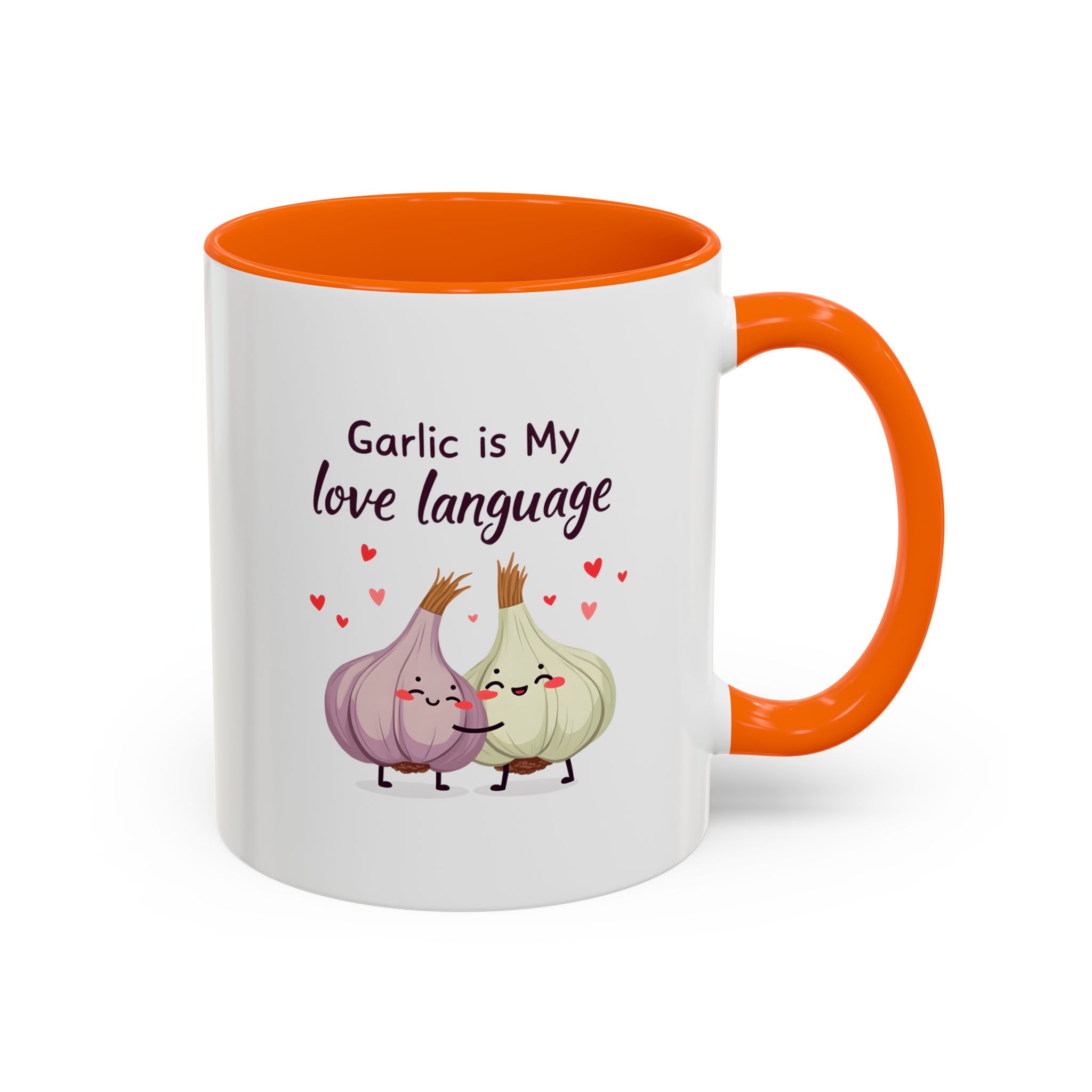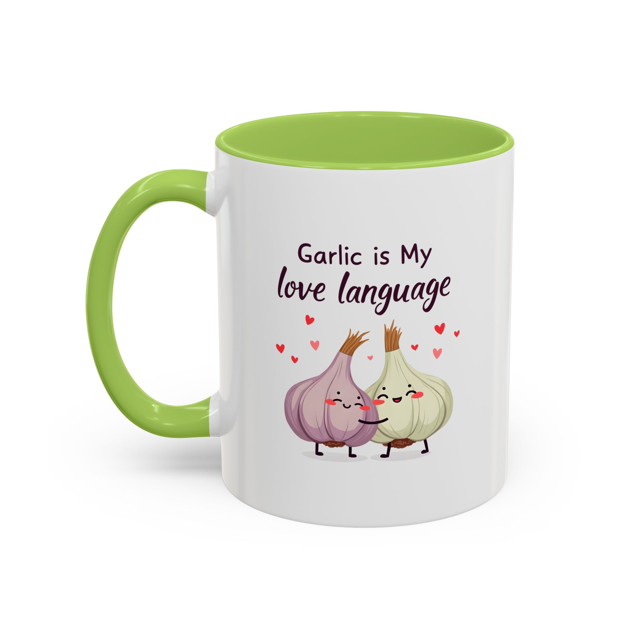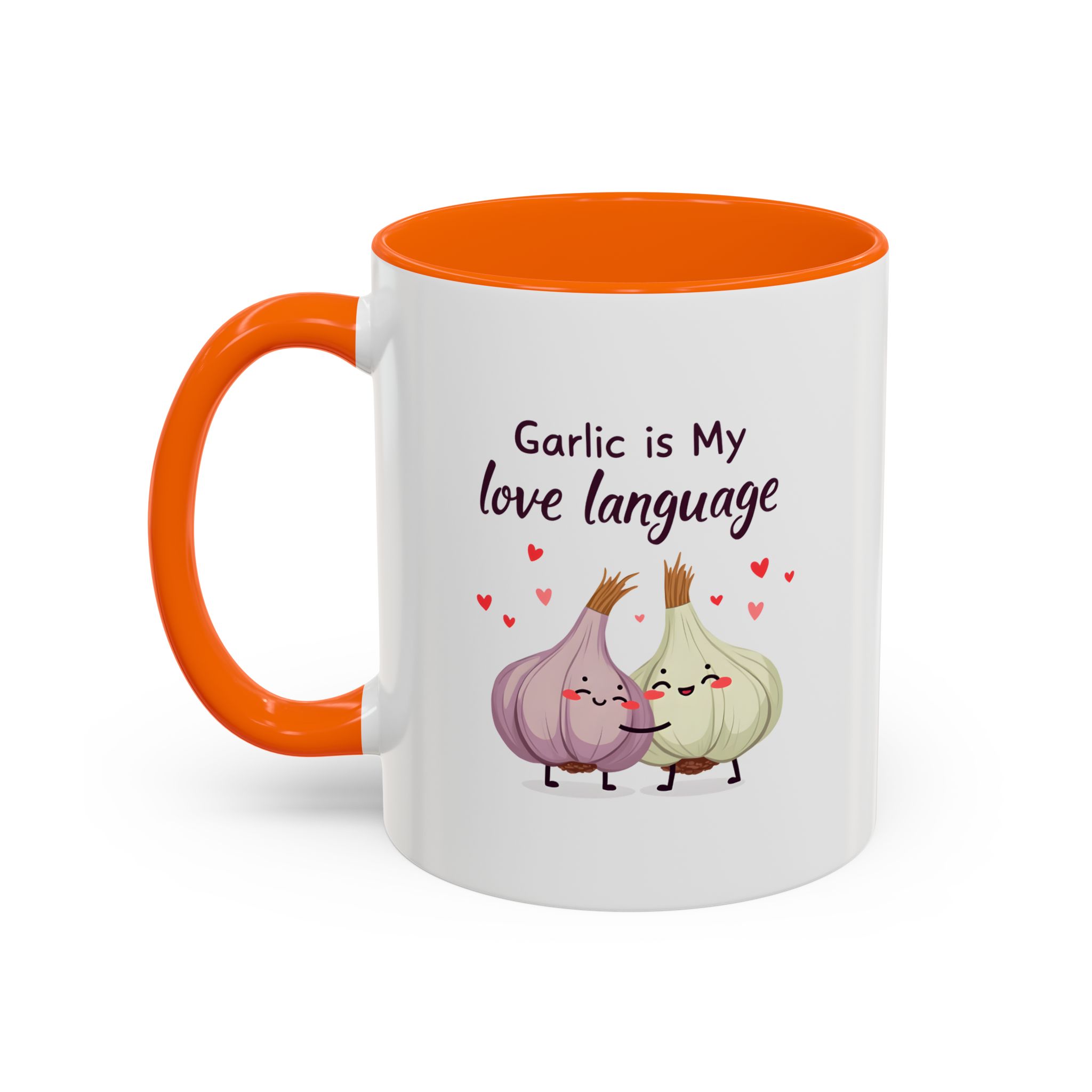“Garlic is My Love Language” with hugging garlic cloves and floating hearts — a sweet vegan gift mug for flavour lovers.