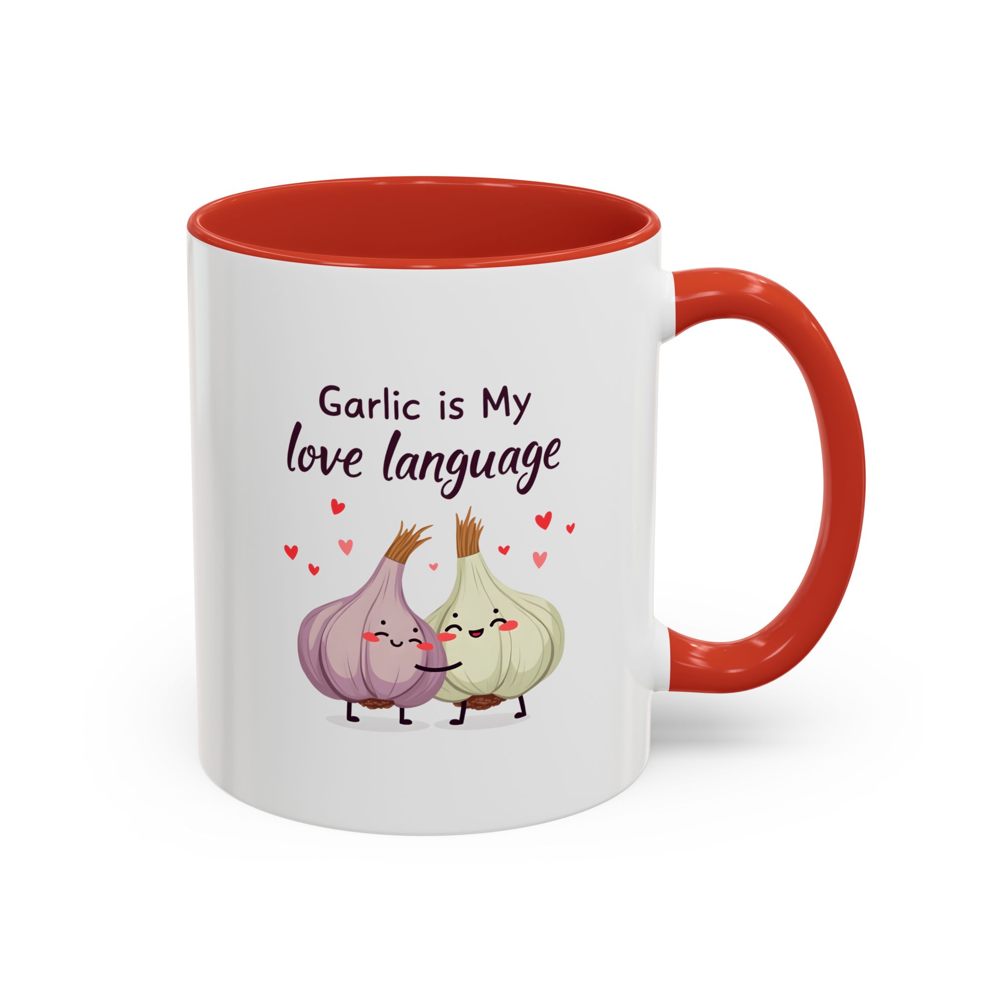 The quote “Garlic is My Love Language” is written in a warm, handwritten script that’s playful and full of personality. Beneath it, two adorable garlic cloves with happy, smiling faces are locked in a heartfelt hug — floating hearts dancing around them in shades of red and pink.