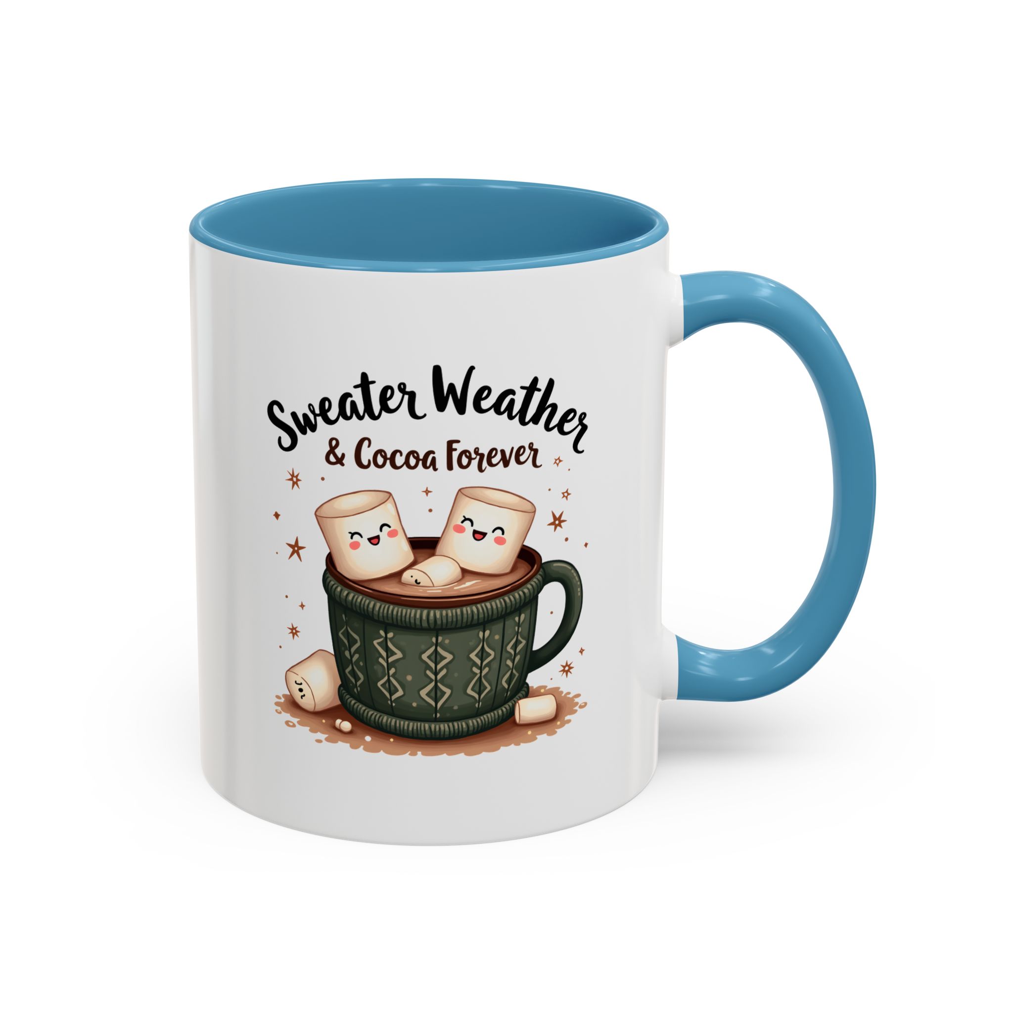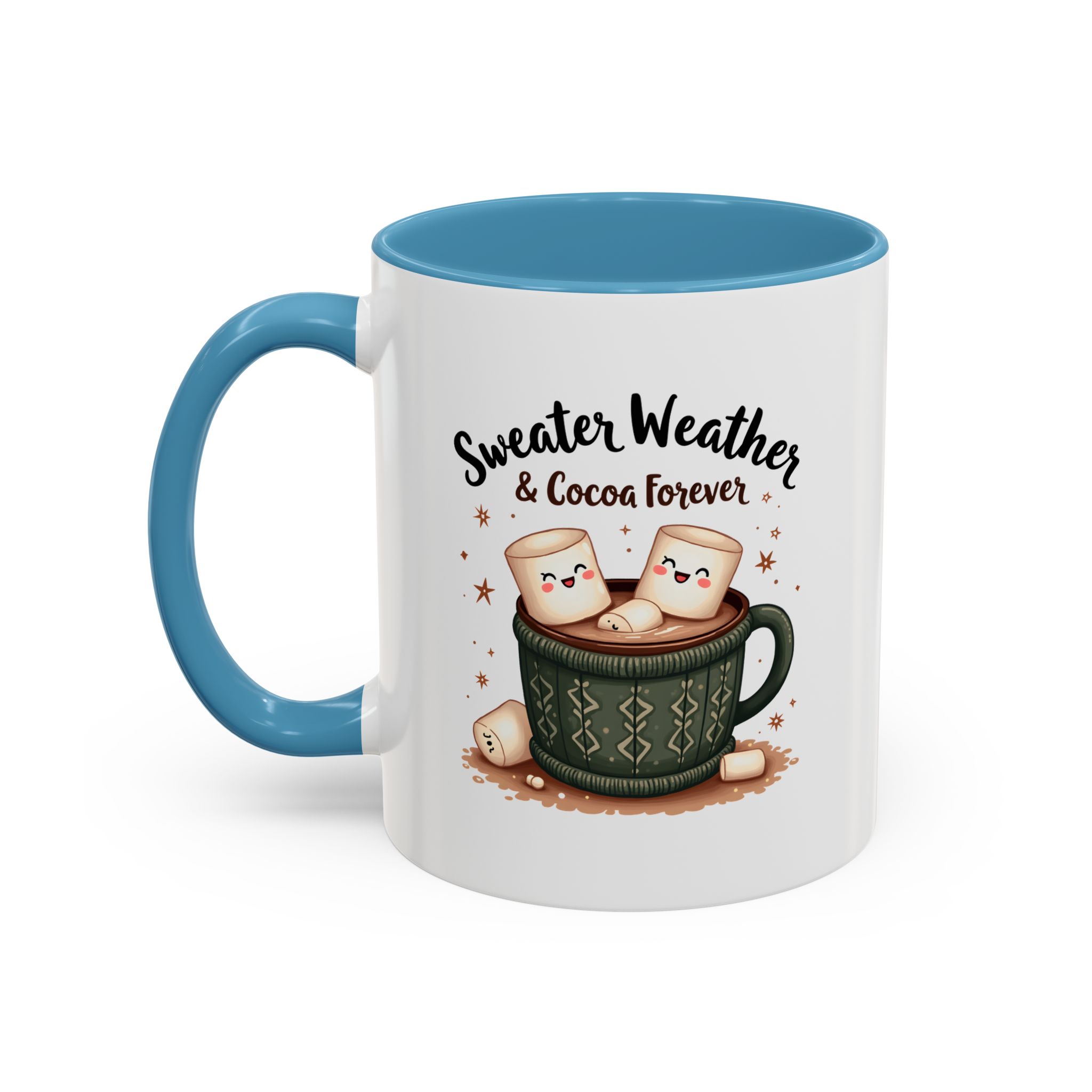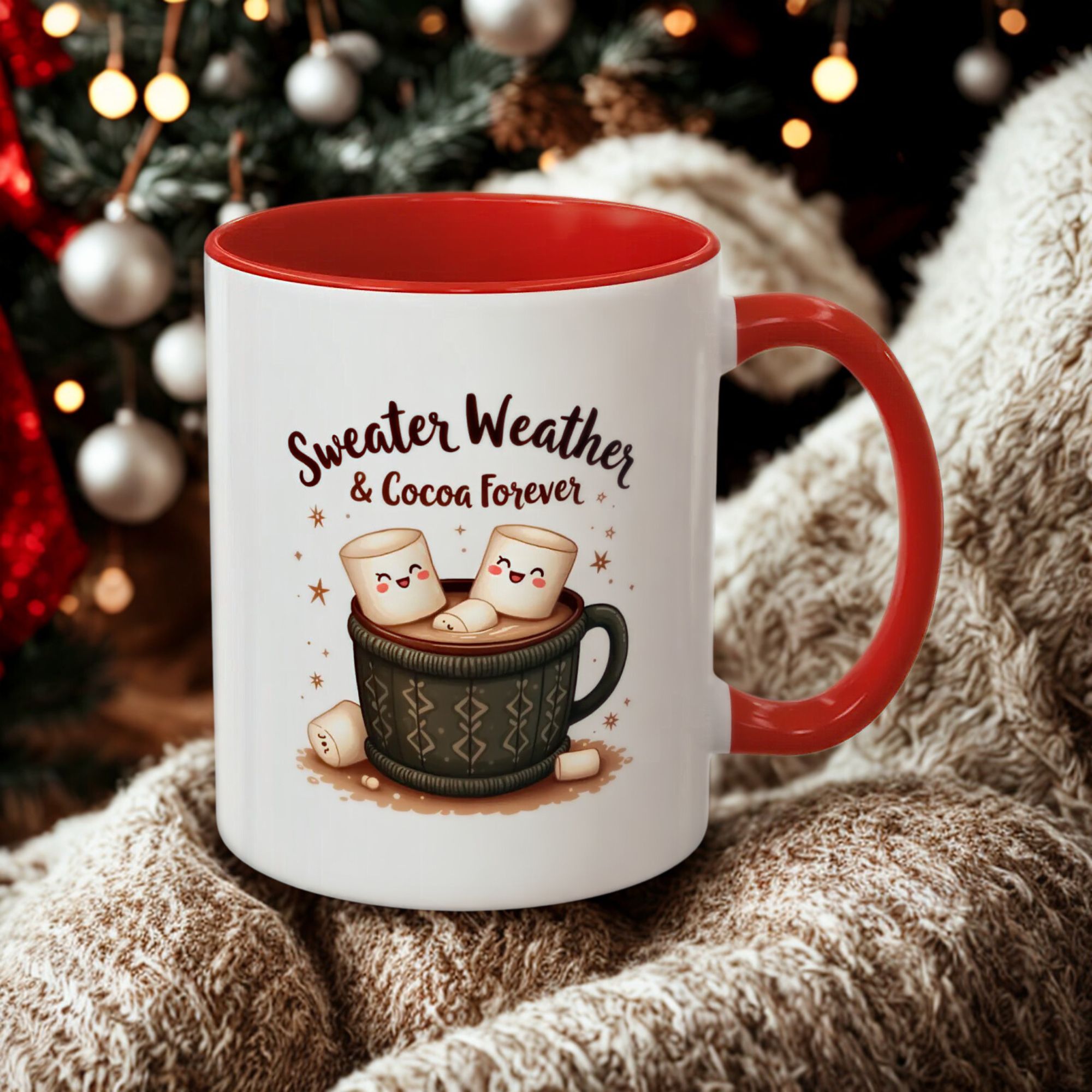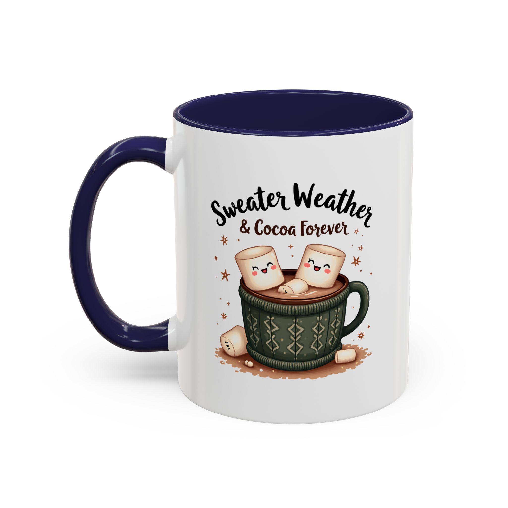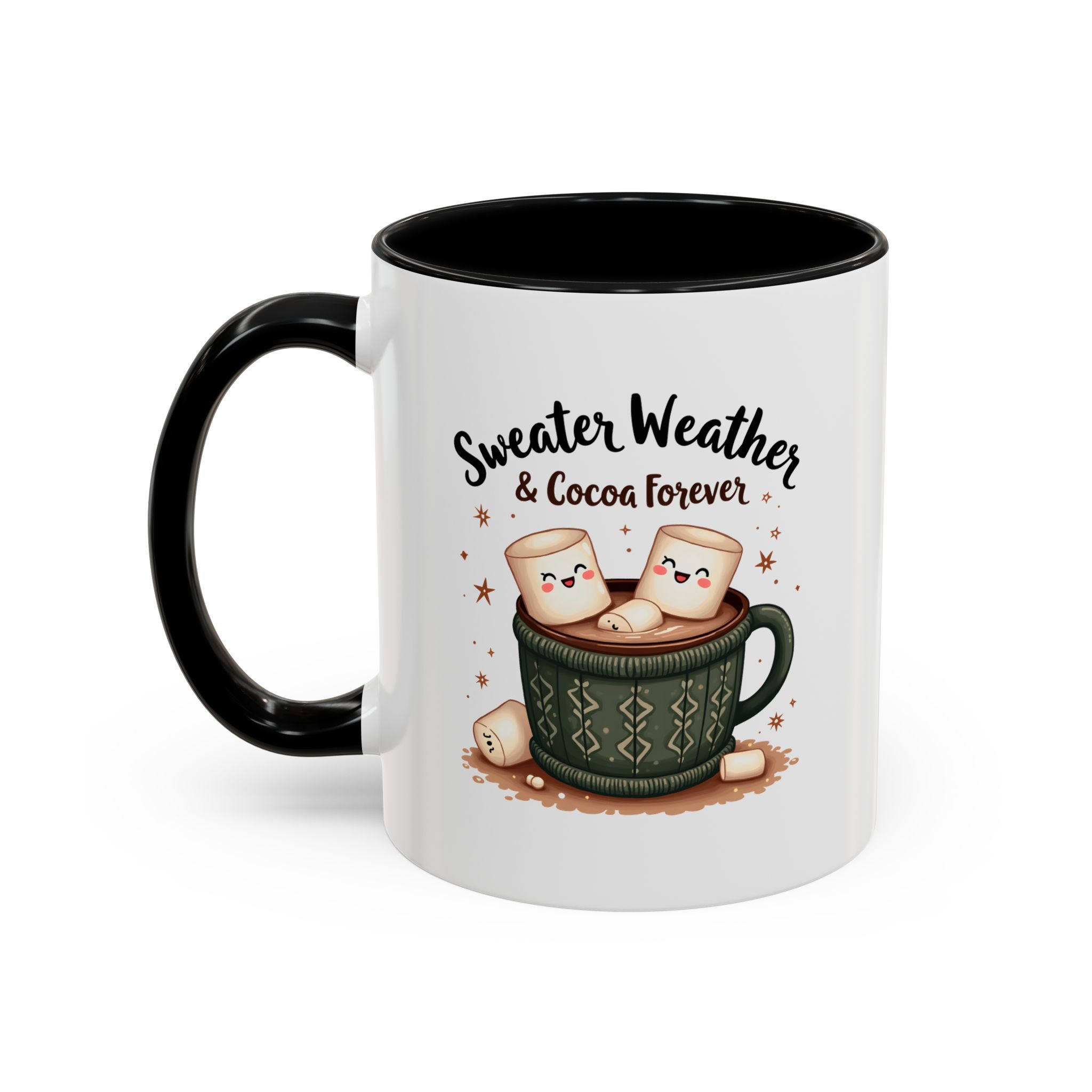 • ☕ “Sweater Weather & Cocoa Forever” with festive sweater-patterned mug and marshmallows illustration