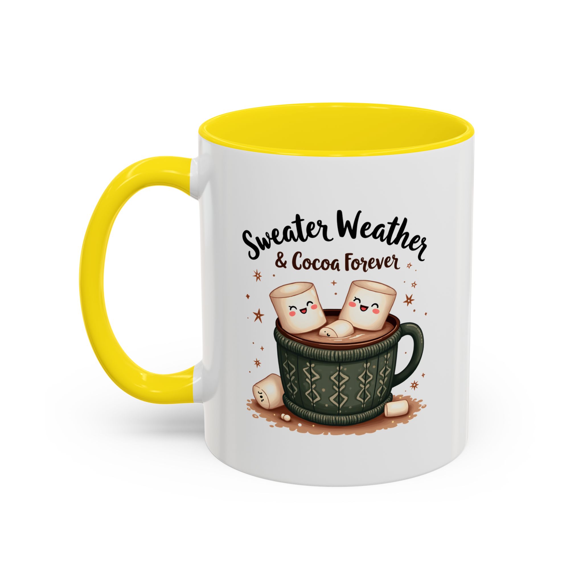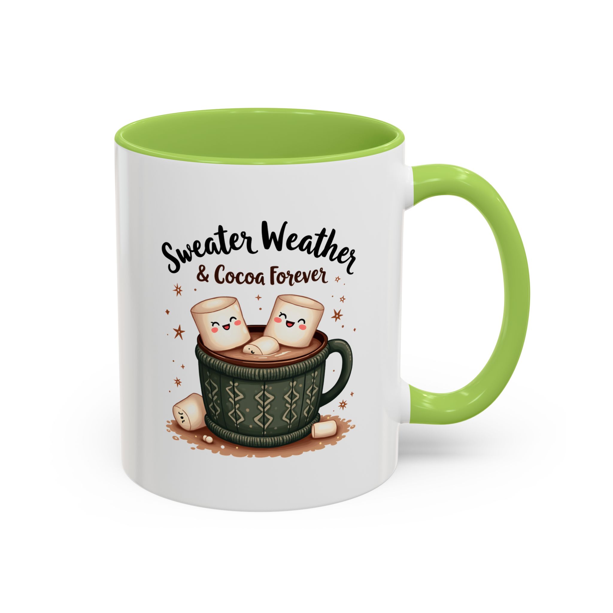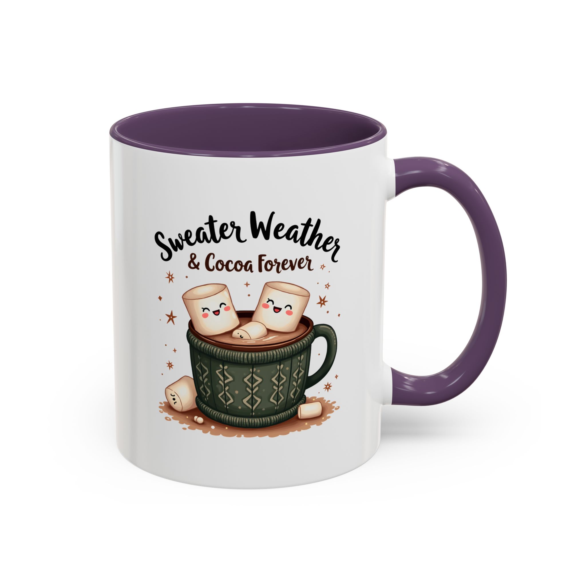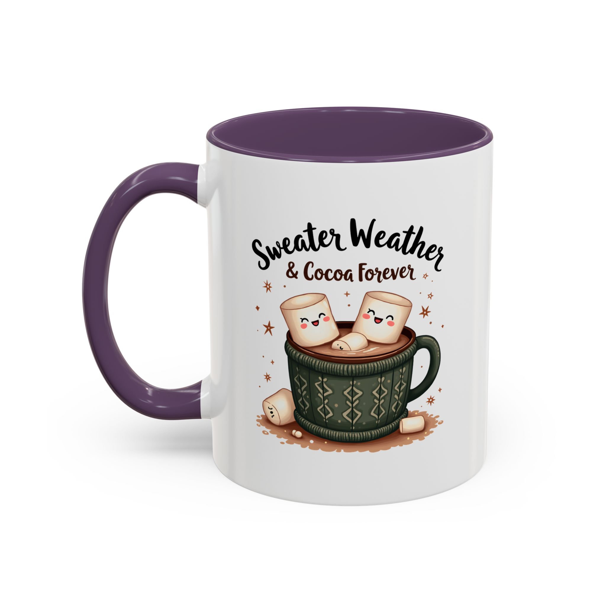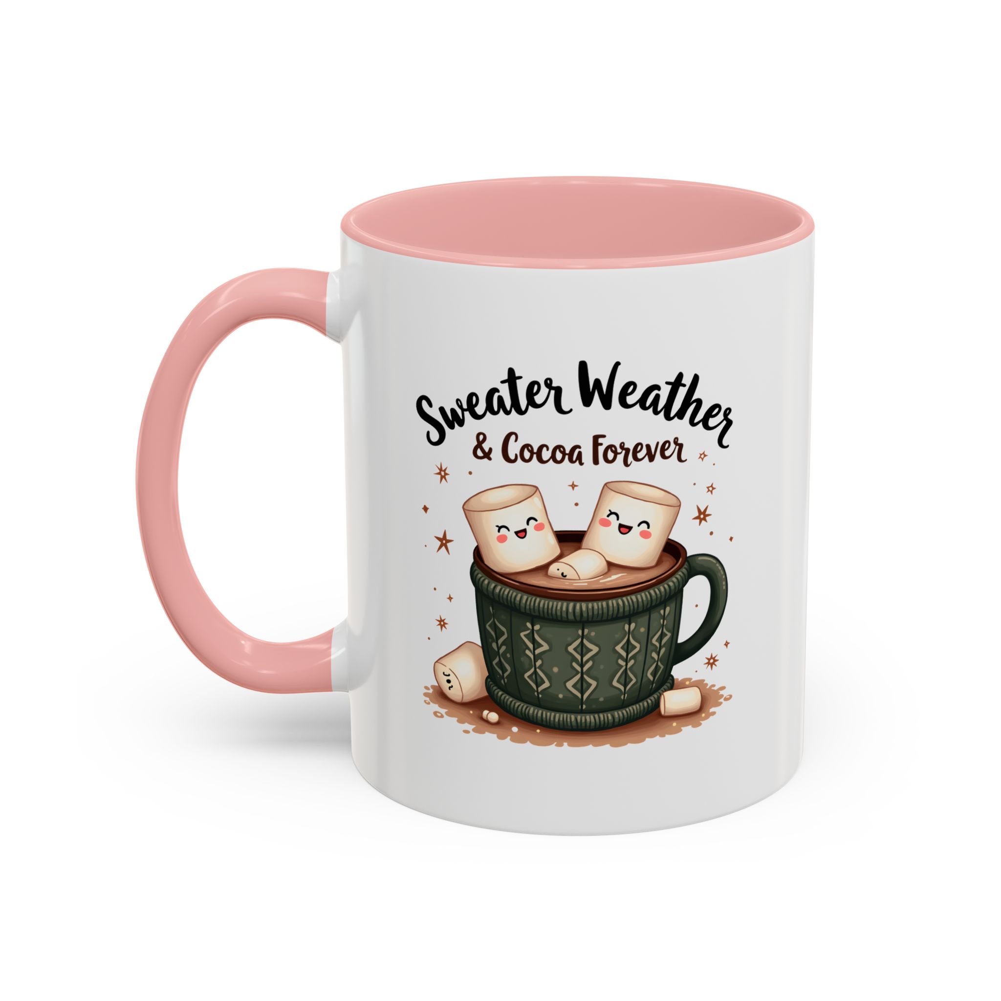• ☕ “Sweater Weather & Cocoa Forever” with festive sweater-patterned mug and marshmallows illustration
